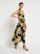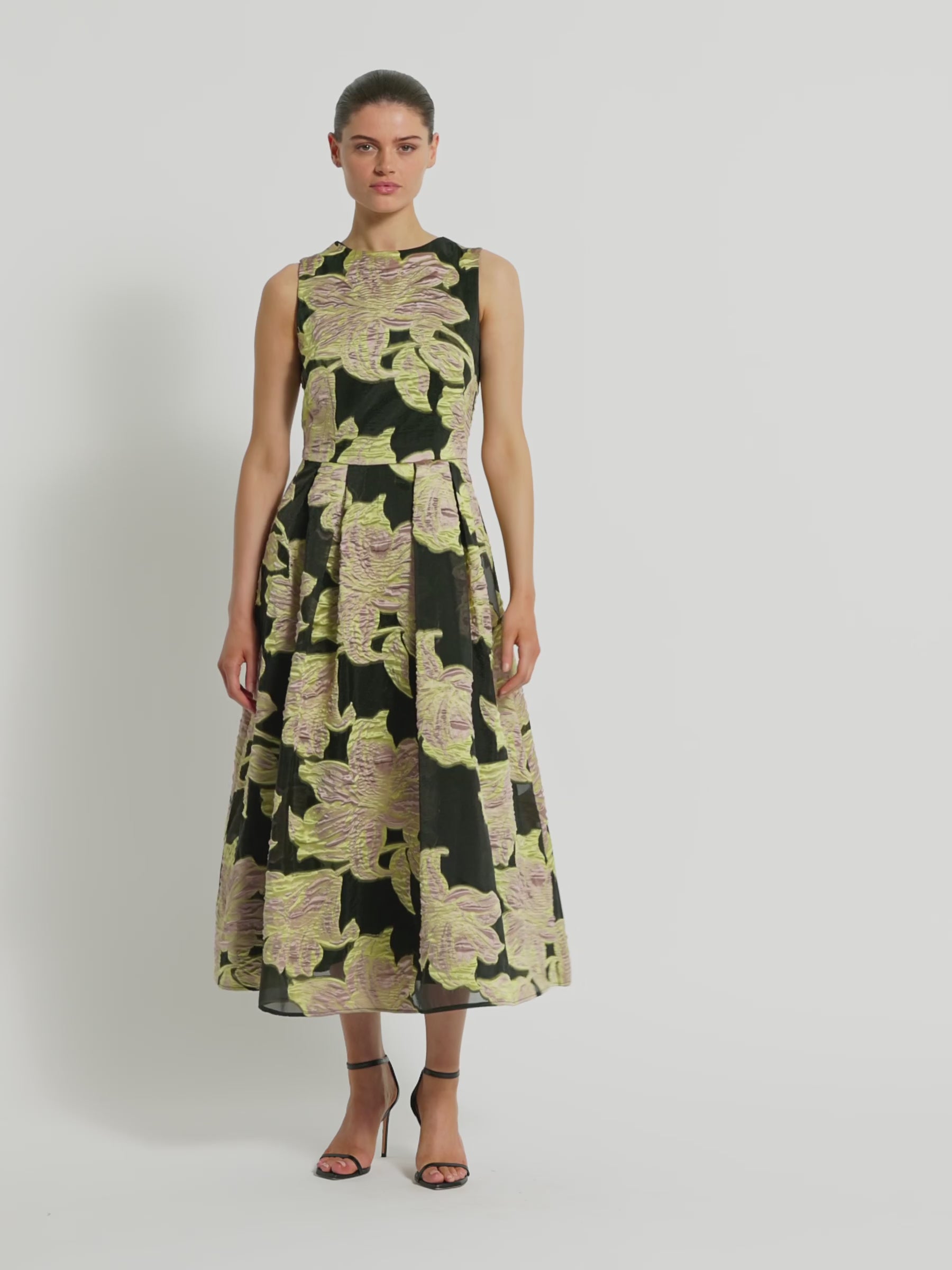 The Florence Midi, inspired by vintage 1950’s glamour will stand out at any event. Beautifully crafted from an exclusive two-tone floral jacquard in citrus and pink on a contrasting black organza, it features a fitted bodice falling to an A-line midi length pleated skirt. This classic A-line silhouette is a standout piece for any cocktail or black-tie event.