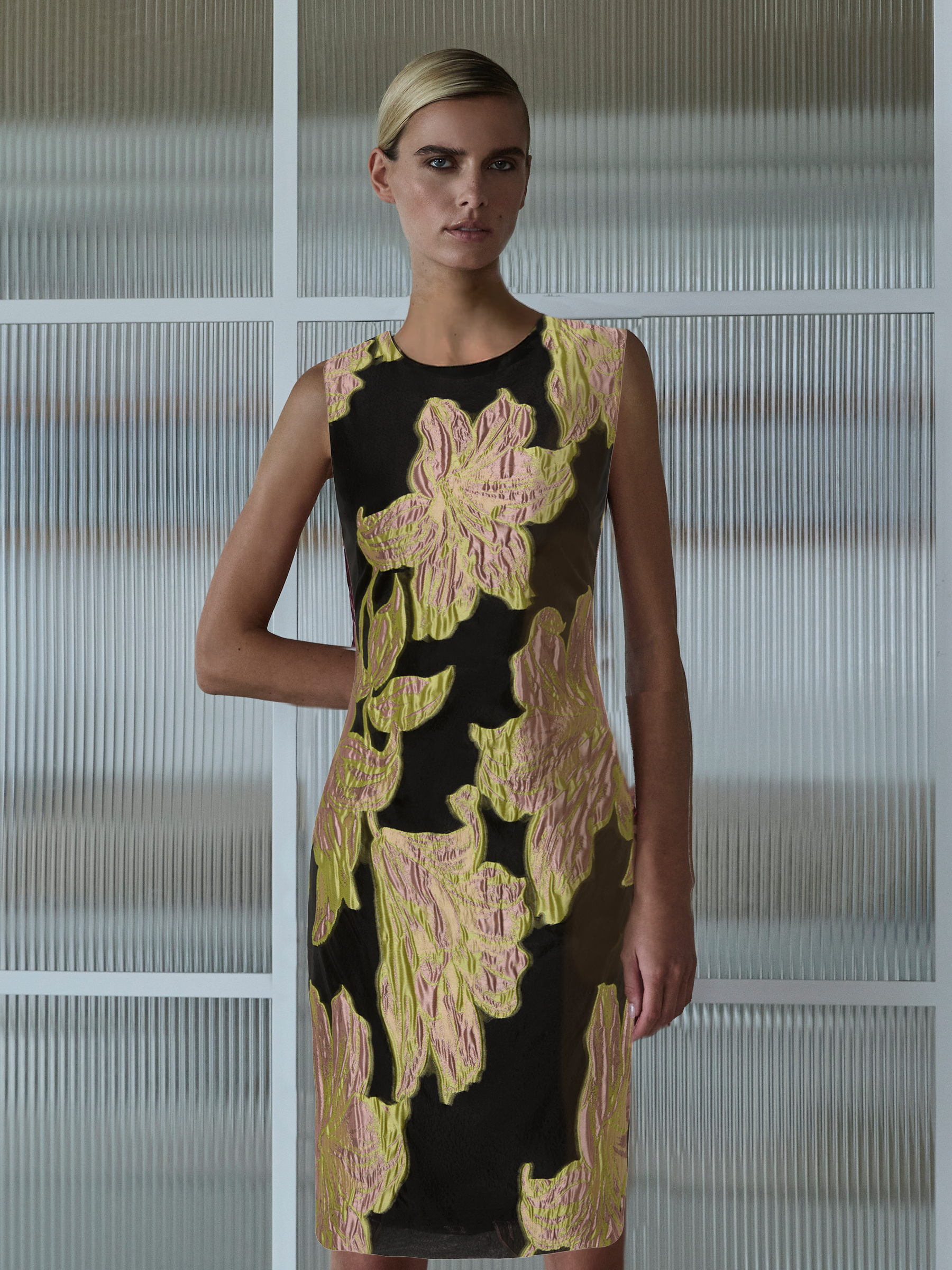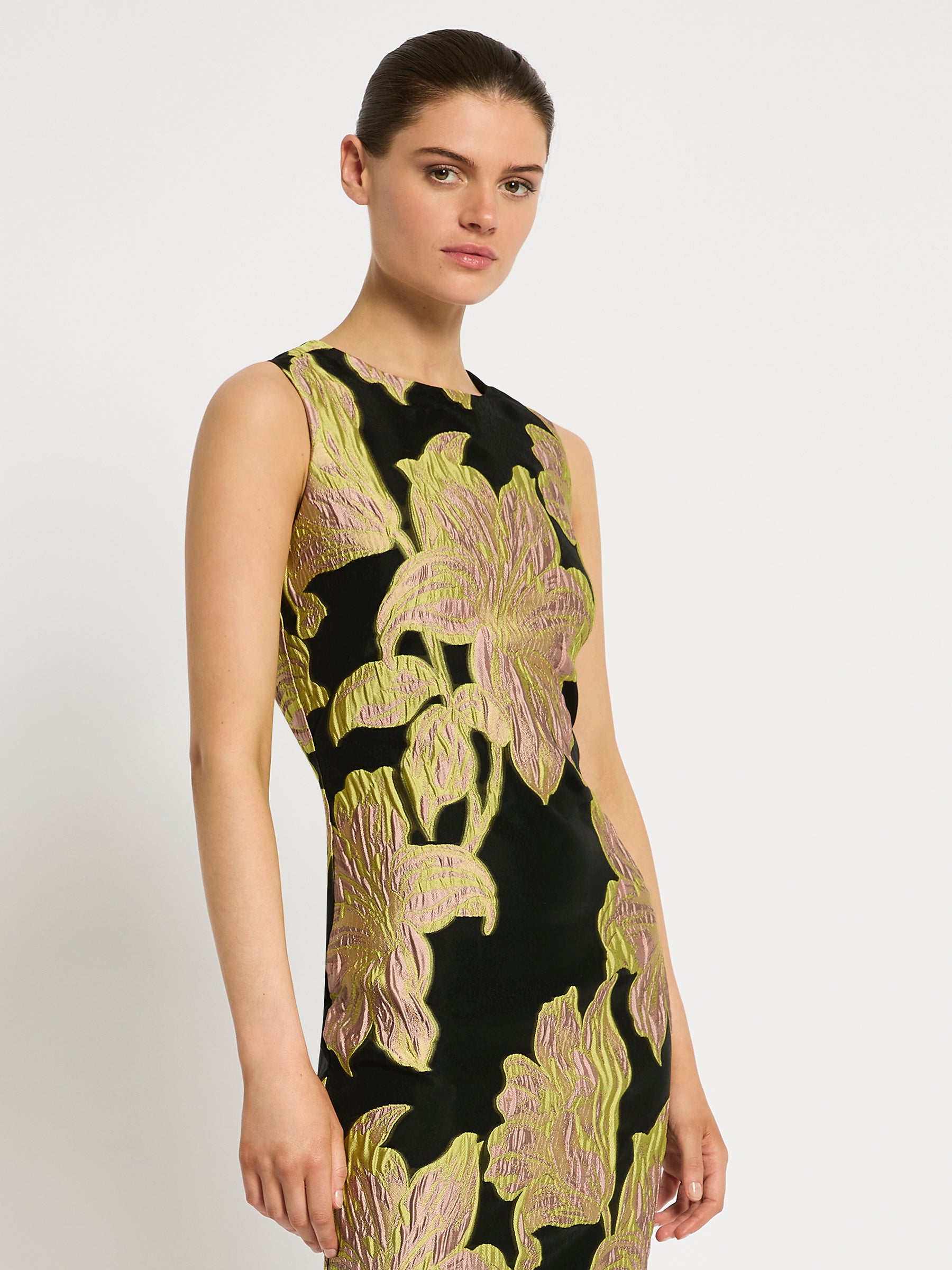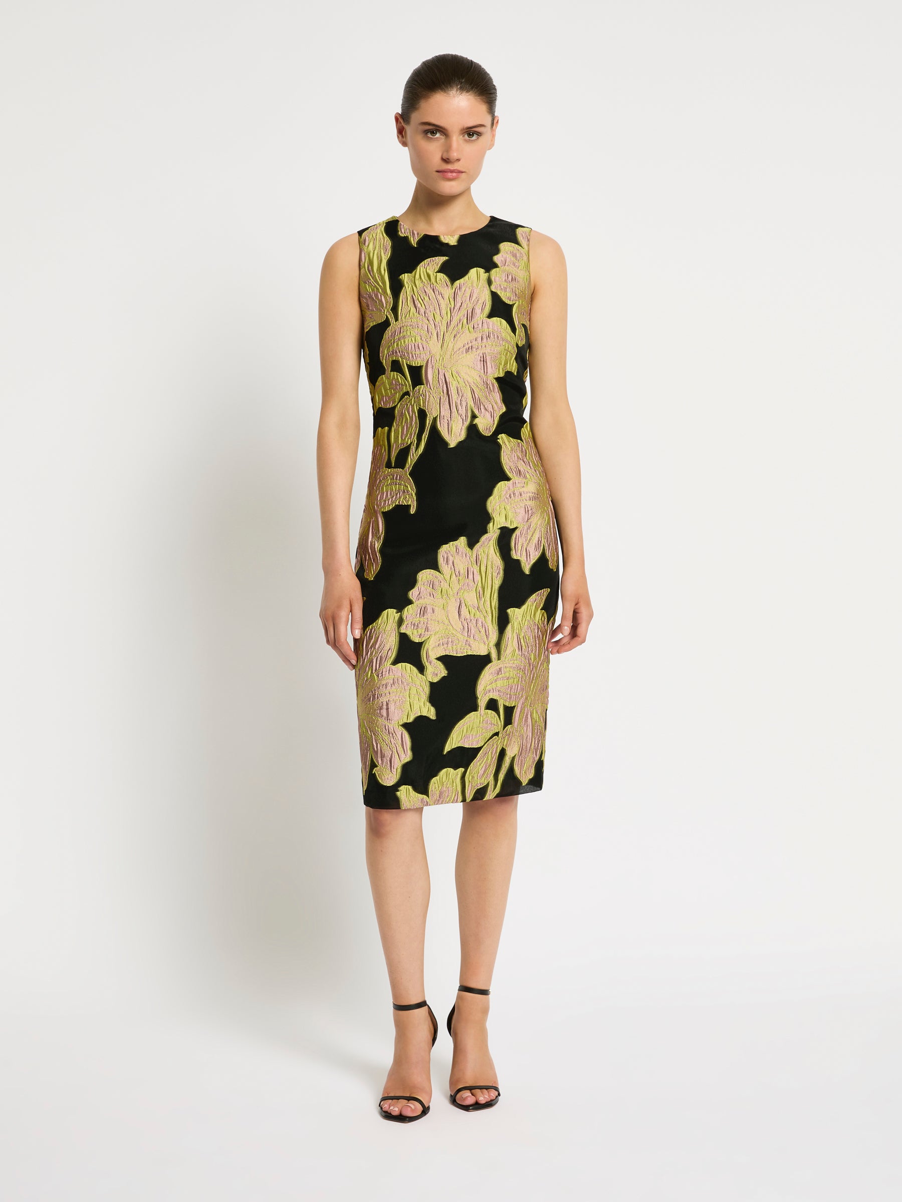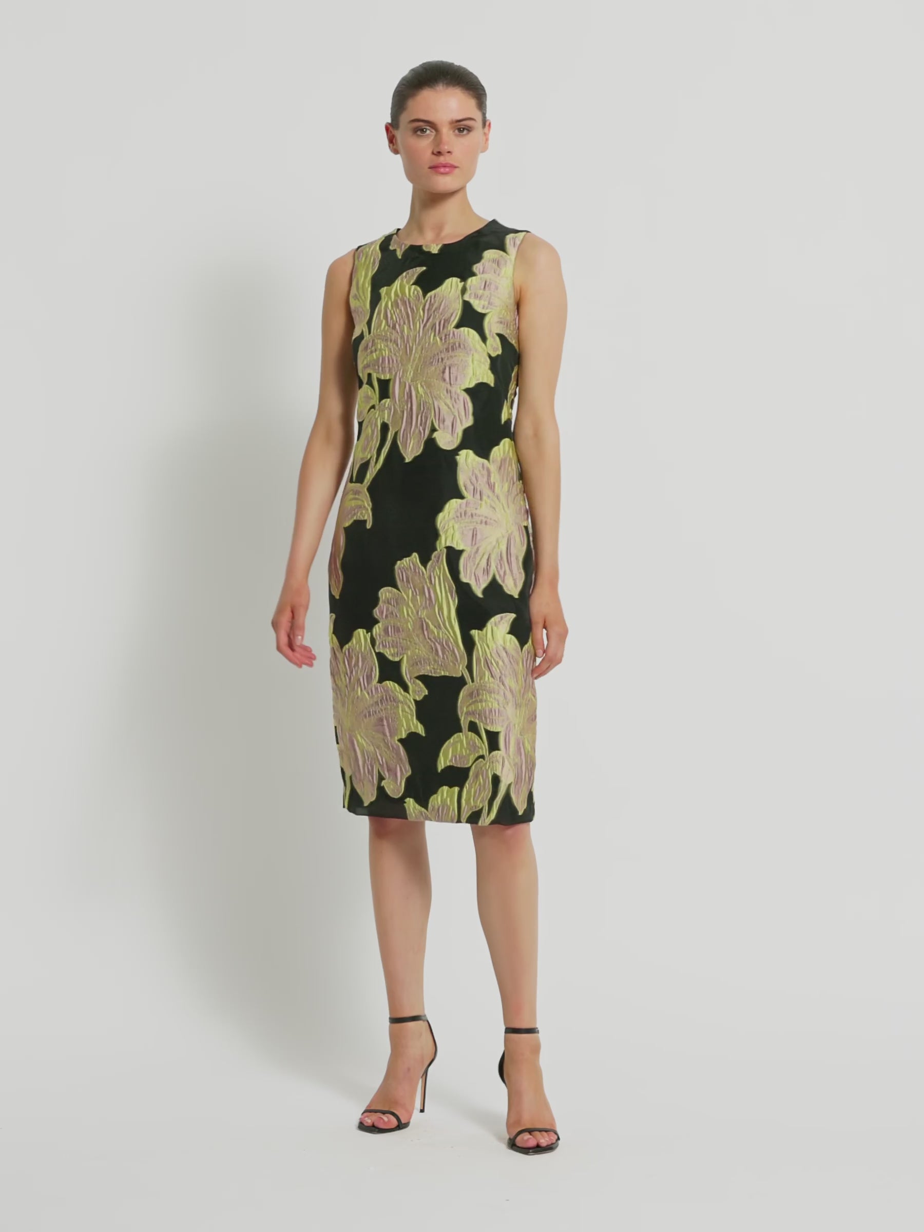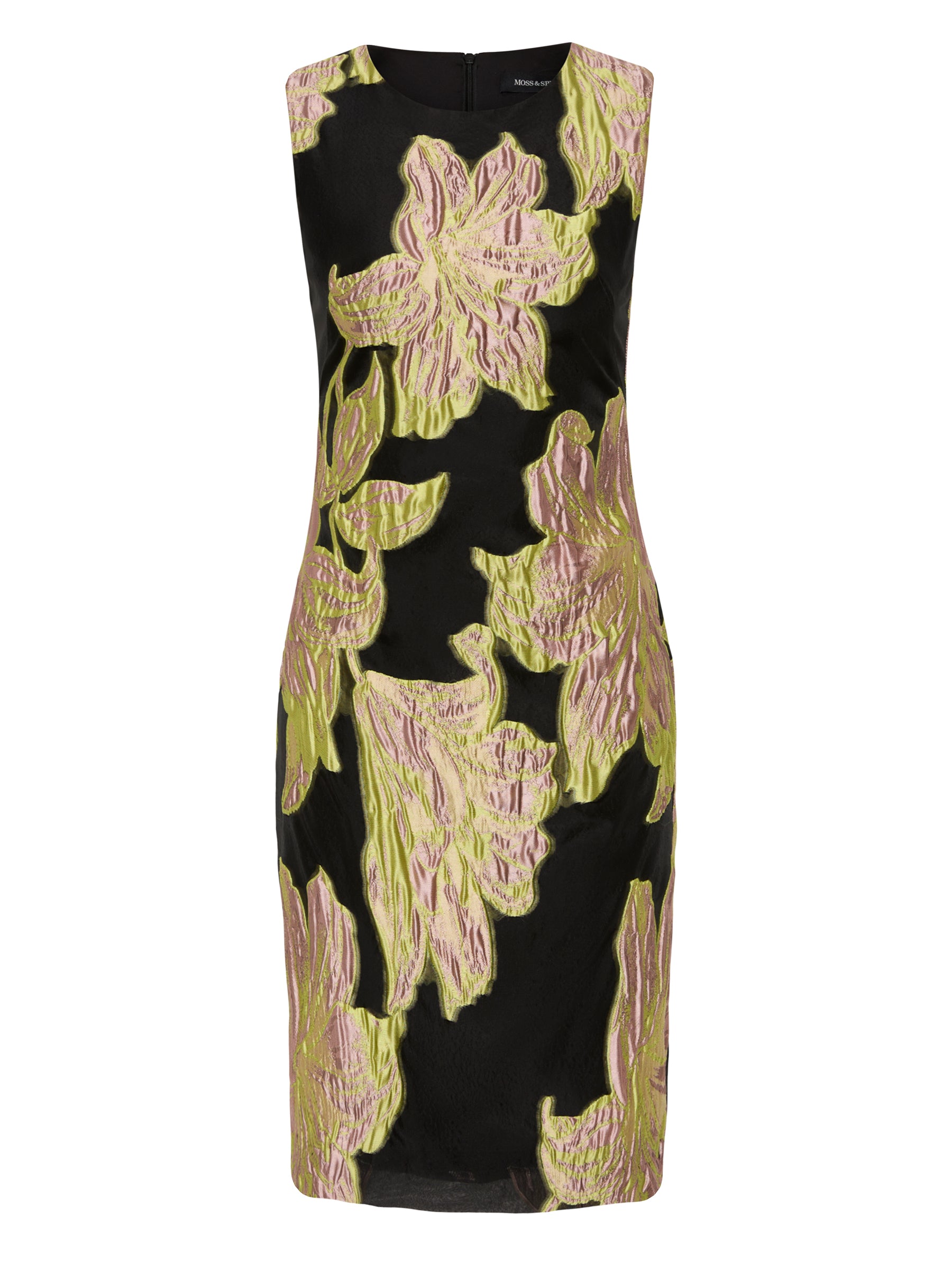 With a large two tone floral design in citrus and pink on a contrasting black organza jacquard background, the timeless refined style of the Florence Shift will stand out at any event. Its classic shift silhouette is shaped to fit the body with a round neckline and straight pencil skirt, finishing just above the knee