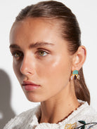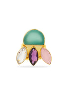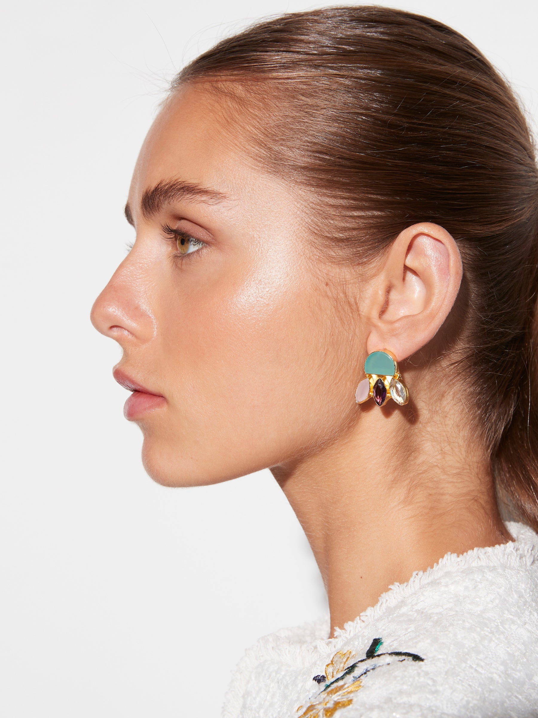 The Francoise Earring is hand made from semi-precious natural stones with brass metal. These flat earrings feature one half circle mint chalcedony stone, with three diamond shaped stones beneath in a pink and a white chalcedony stone and an amethyst stone, all individually encased, with a stud back for pierced ears.
