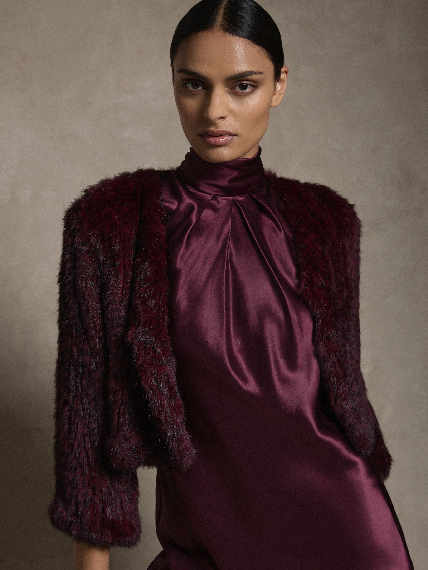 Crafted from luxurious rabbit fur in burgundy with back tips scattered throughout. Features three quarter length sleeves and a hook and eye front closure, cropped to sit on the waistline. The Fur Bolero is a classic elegant jacket to throw over on a cold winter's night, the perfect addition to any outfit.