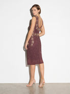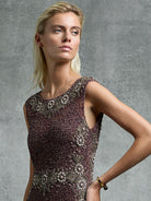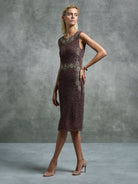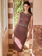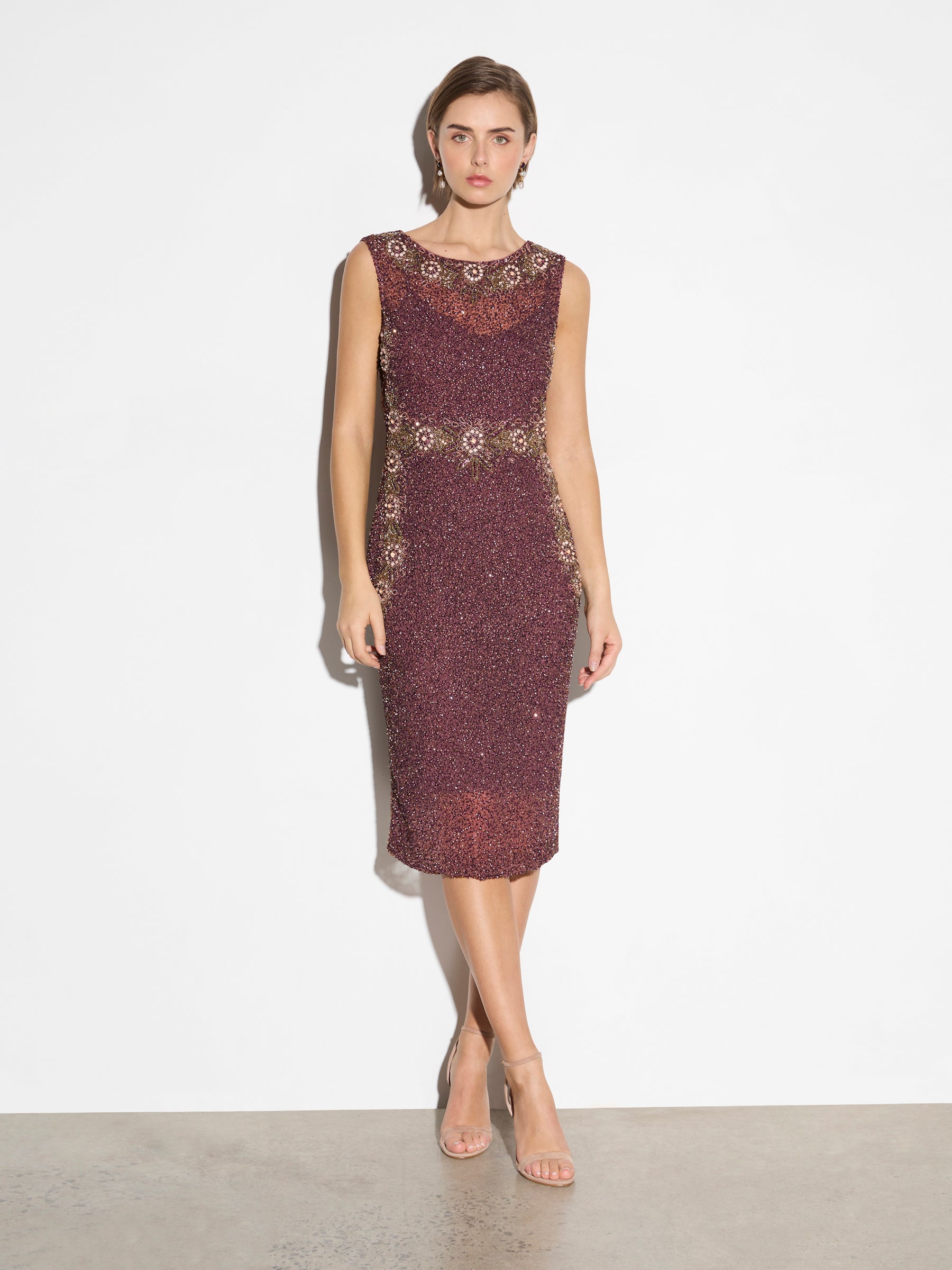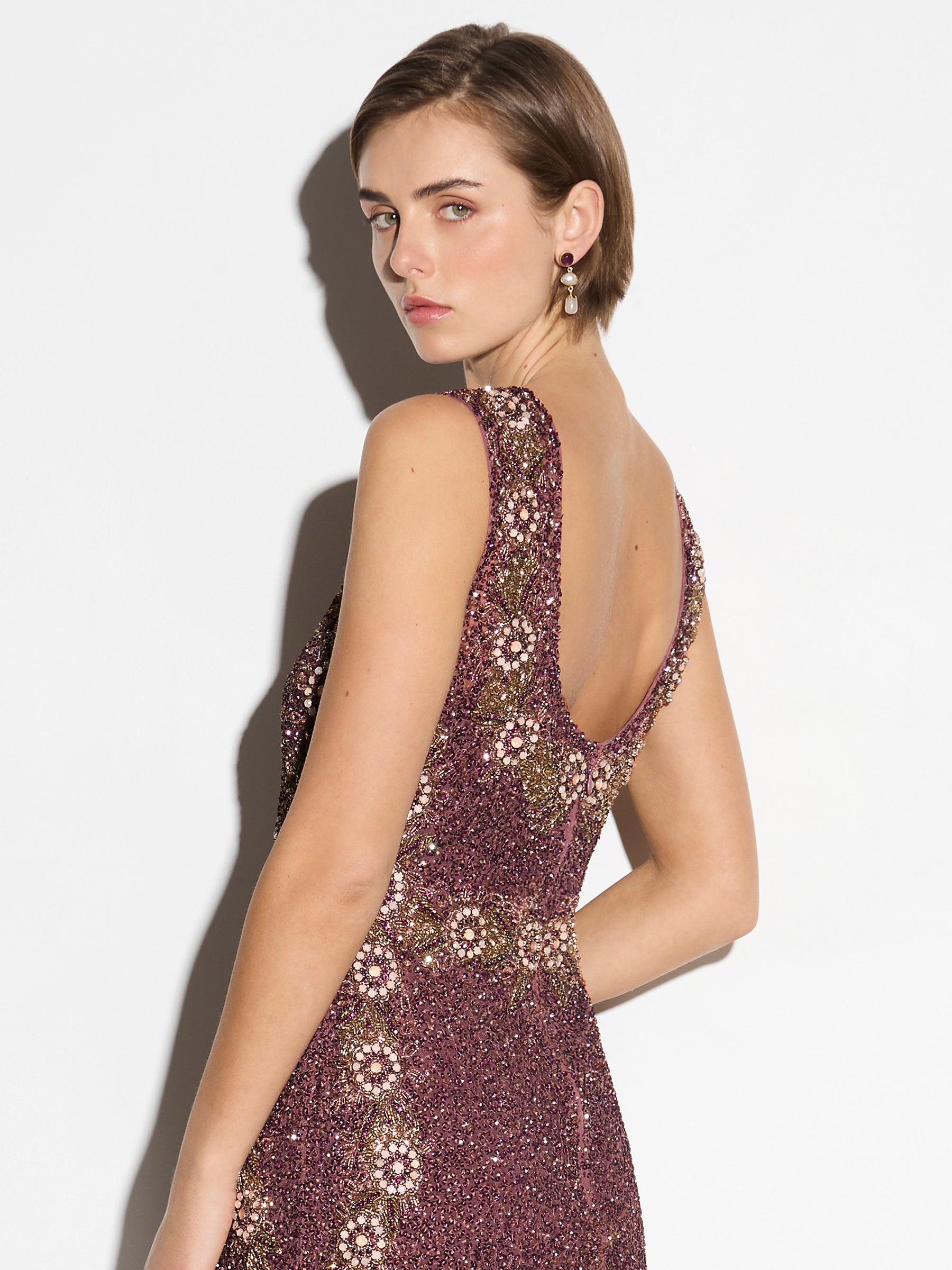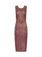 The Grace Shift is intricately beaded all over with delicate sequins on a soft plum coloured tulle. The heavily encrusted jewels in pale pink and soft bronze around the neckline, waist and side panels adds to the luxurious detailing. Fitted through the bodice and waist it falls to a fitted straight shift finishing below the knee. The intricate detailing and sparkle makes the Graces Shift a perfect choice for any cocktail or black-tie event.