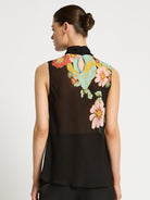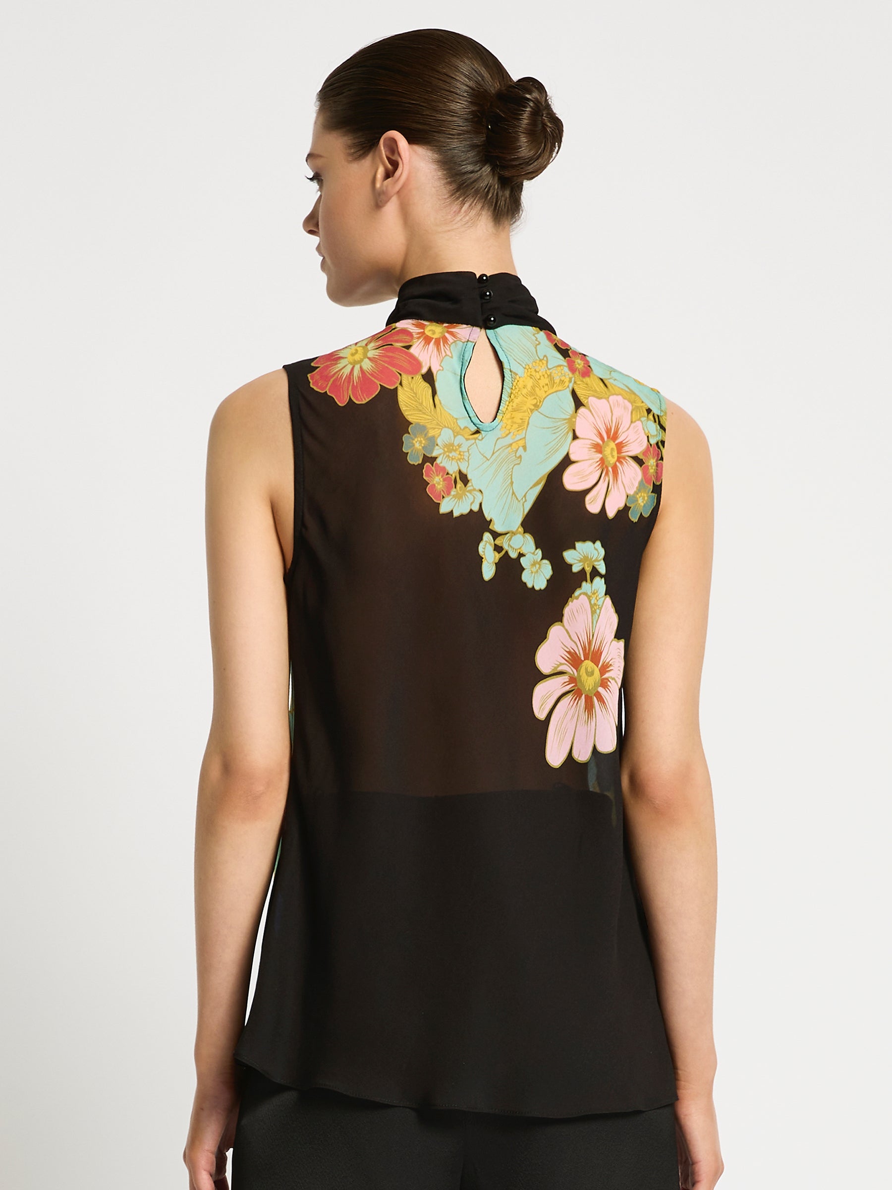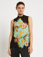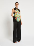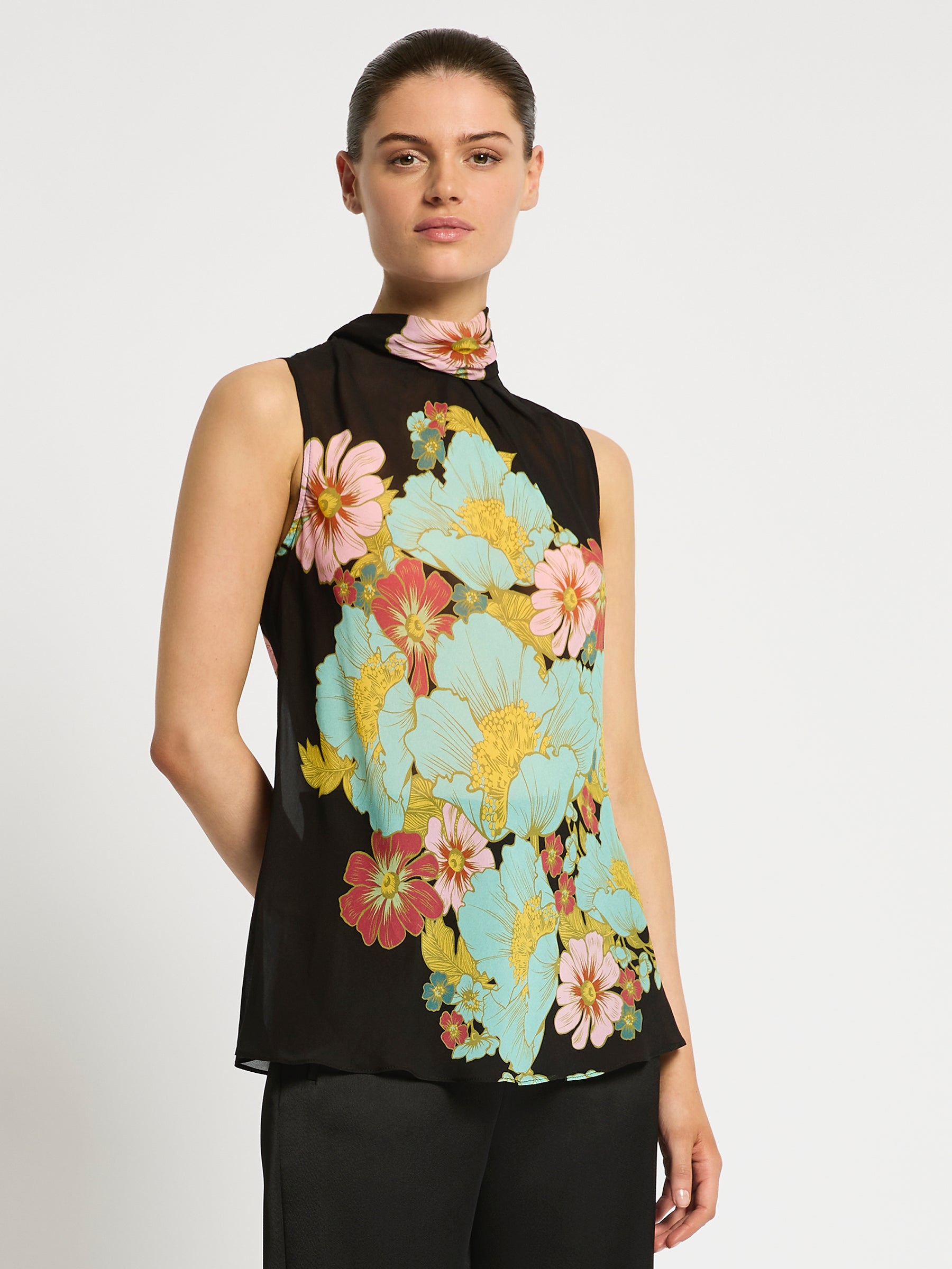 The Julia Top is a versatile staple for your wardrobe. Crafted from a soft drapey viscose georgette with a large placement floral print in mint, ruby pink and yellow flowers on a striking black background, meticulously placed to flatter the body. Features a sleeveless design with a high draped collar and loop and button closure at centre back.