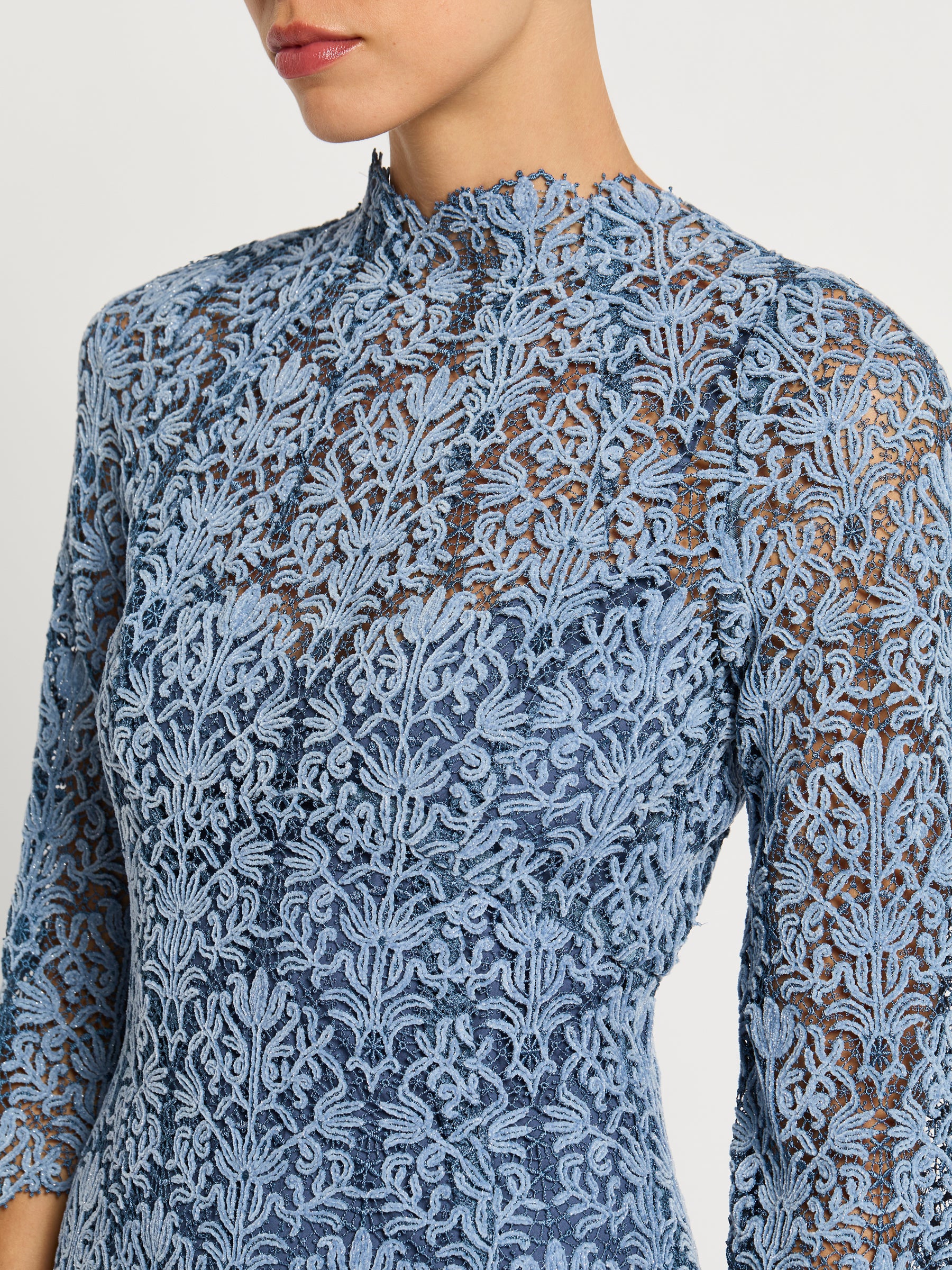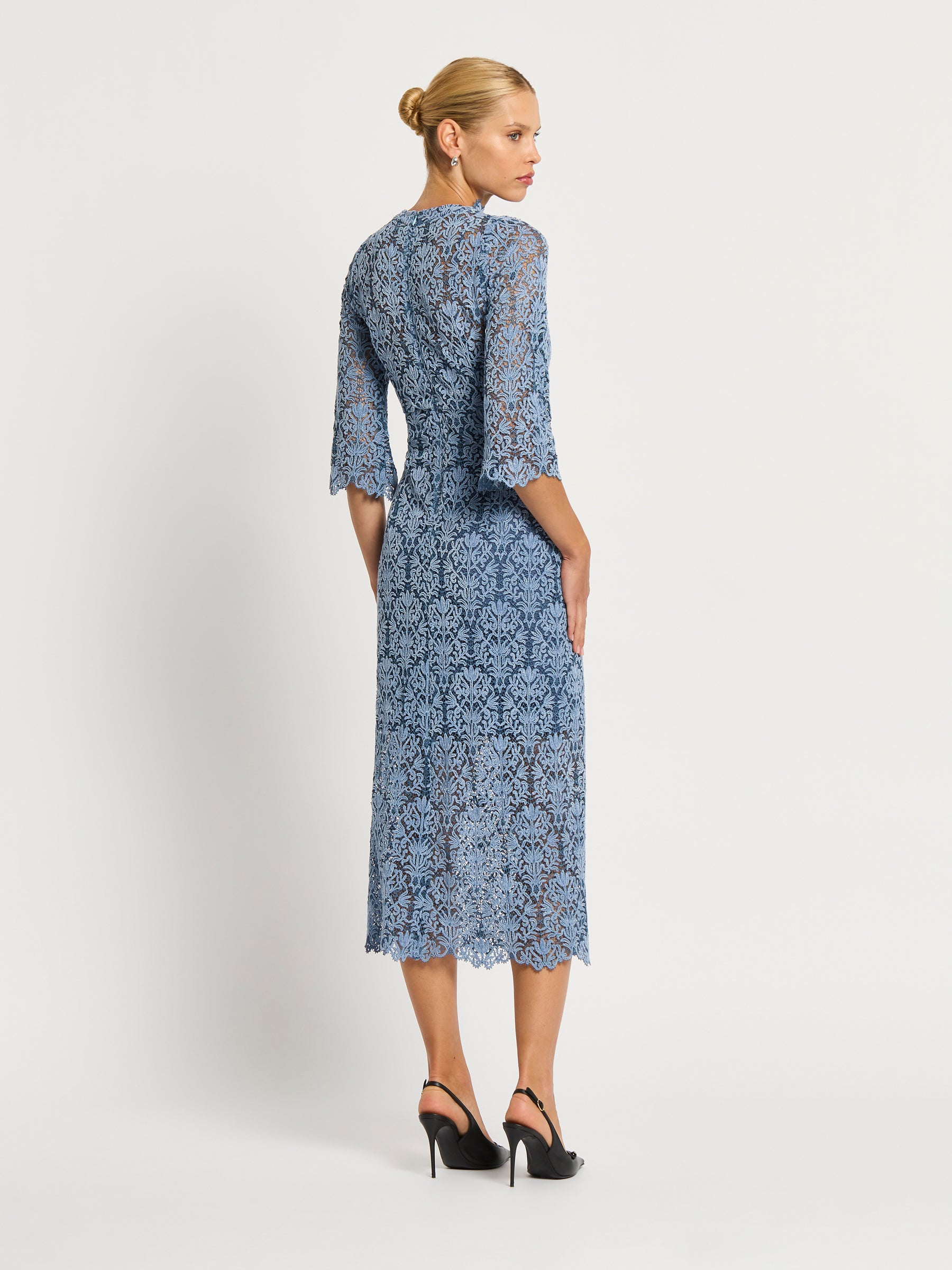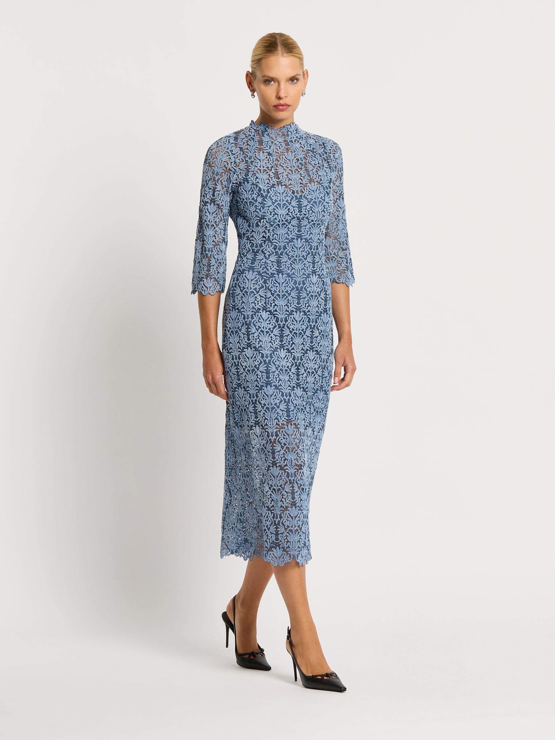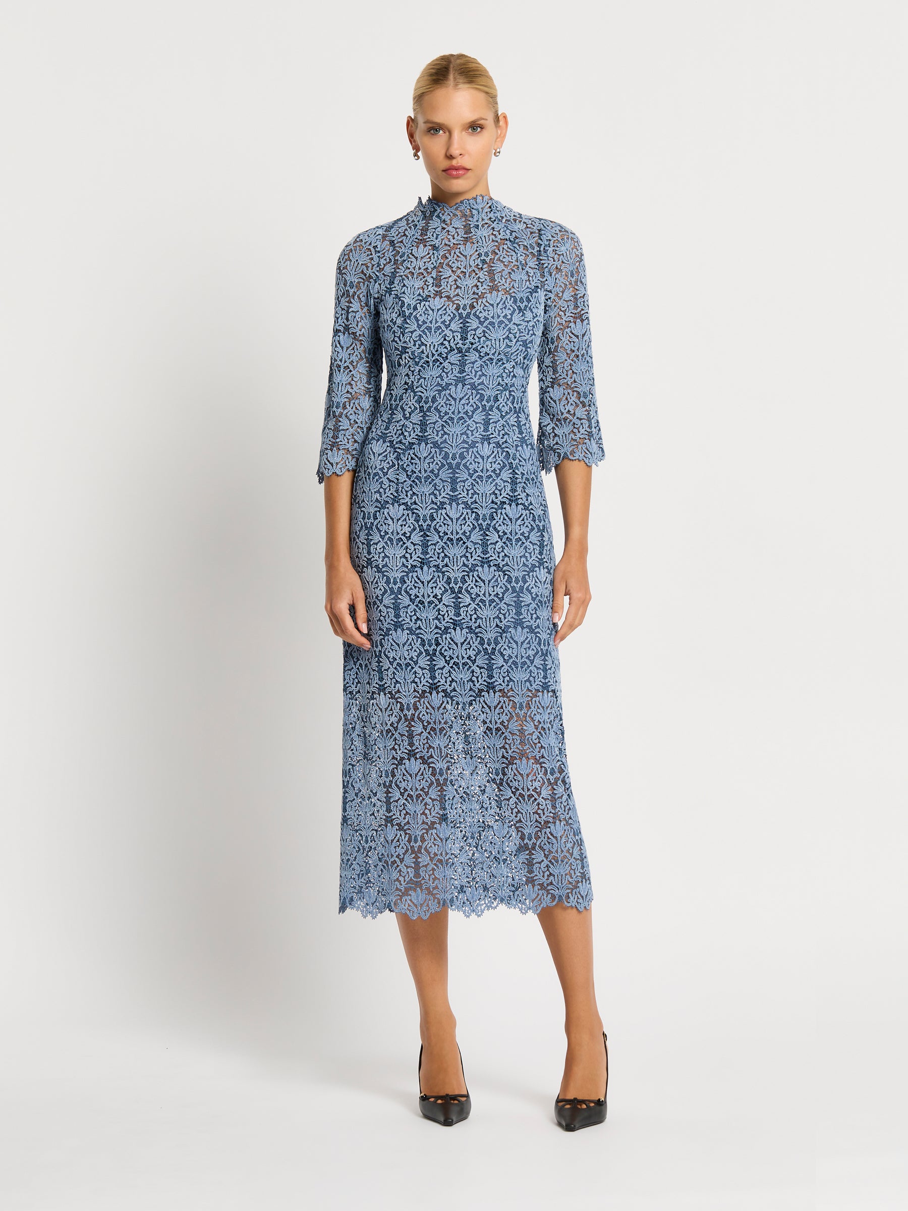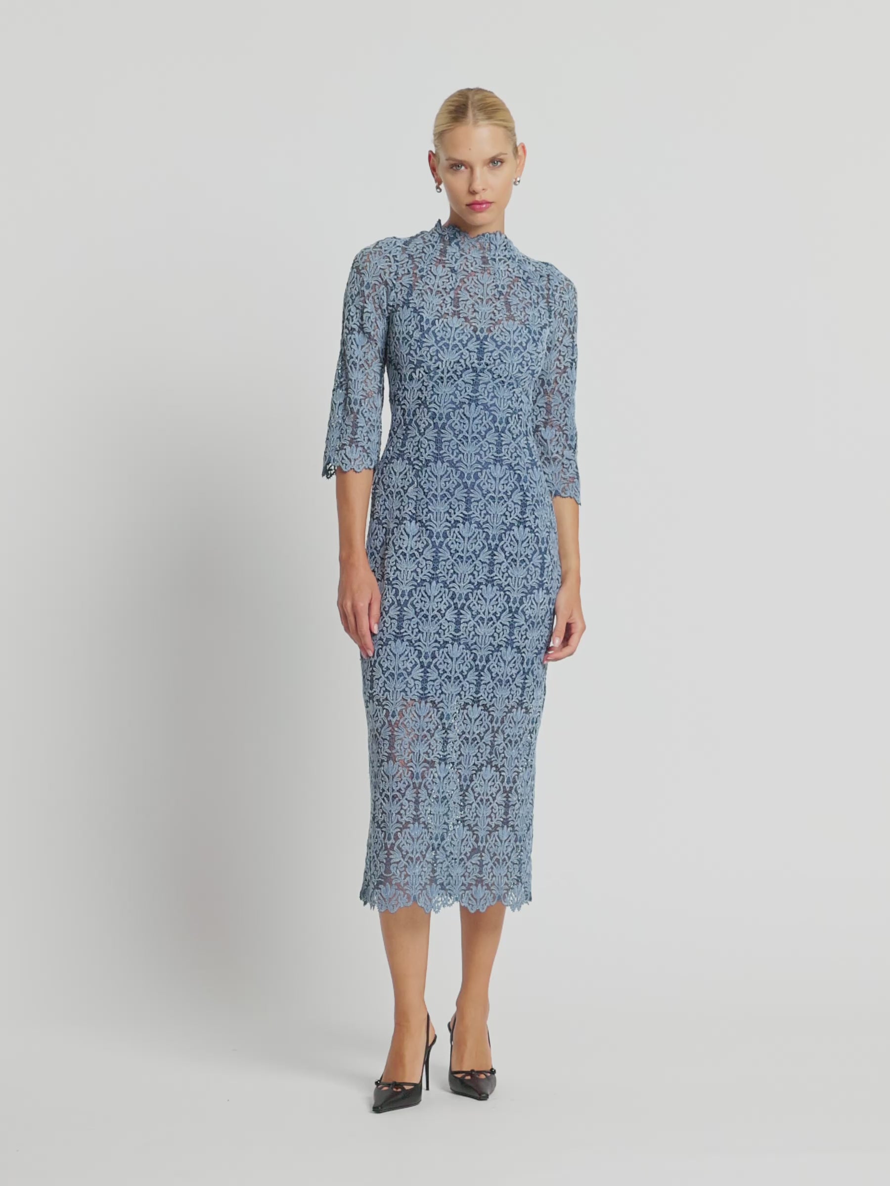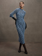 A truly versatile autumn-winter dress, the beautifully intricate embroidered pattern of the Juliette Midi in soft blue two-tone lace is enhanced with a delicate velvet finish. Scallop detailing extends around the high neckline and three quarter length sleeves creating a stunning impression from a classic, figure flattering shape for any day or night event. Comes with a matching jersey slip.