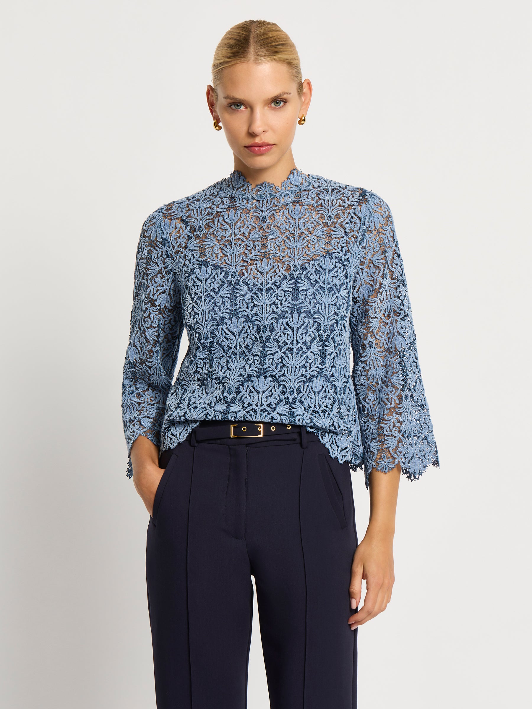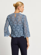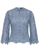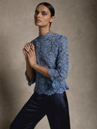 The Juliette Top in a soft blue two-tone lace is the perfect top for your winter wardrobe. The beautifully intricate embroidered pattern is enhanced with a delicate velvet finish, scallop detailing extends around the high neckline and three quarter length sleeves creating a stunning impression for any day event. Comes with a matching jersey slip.