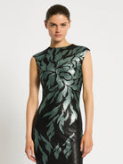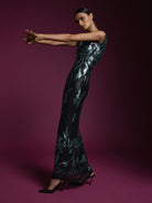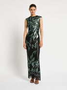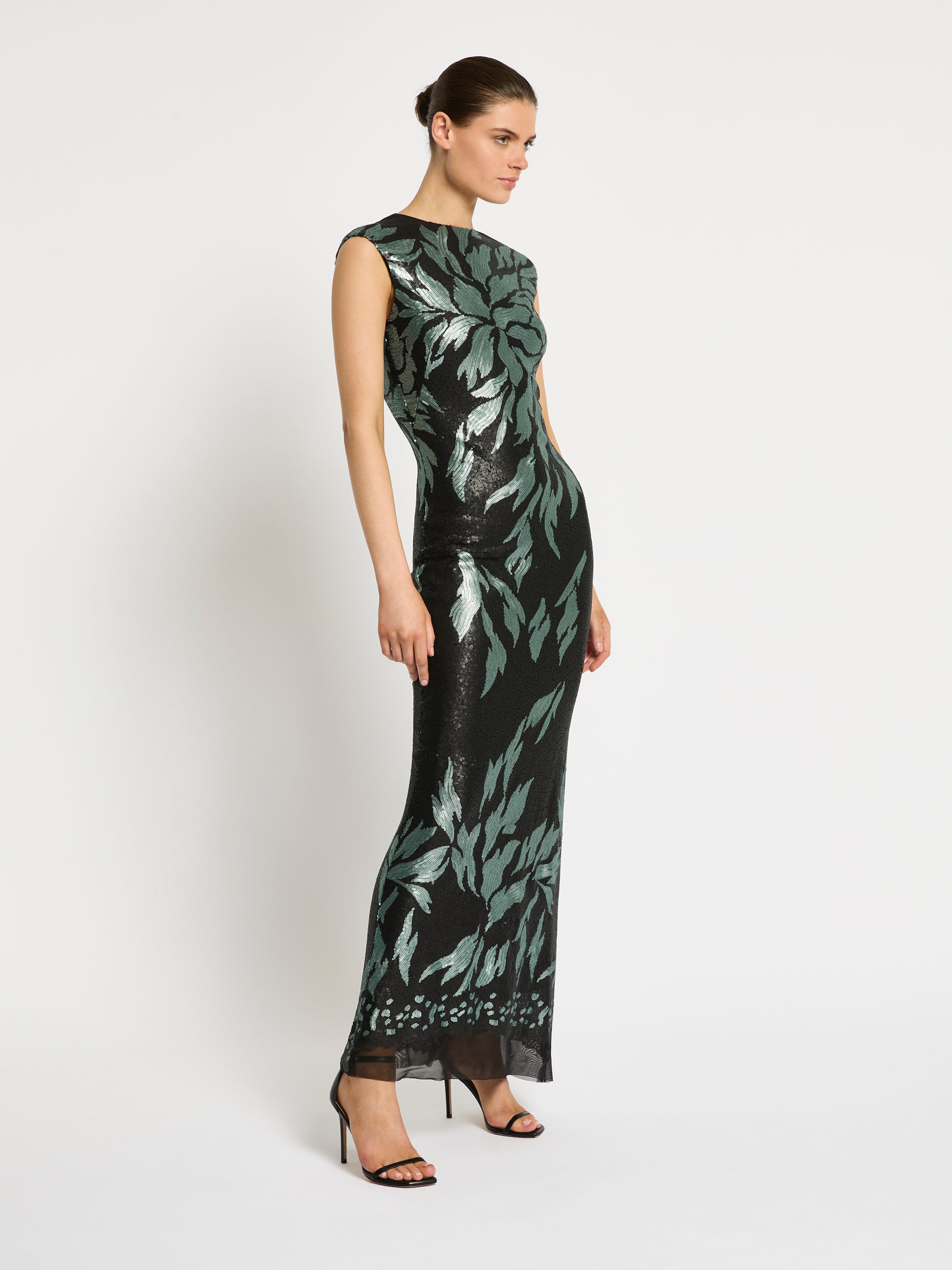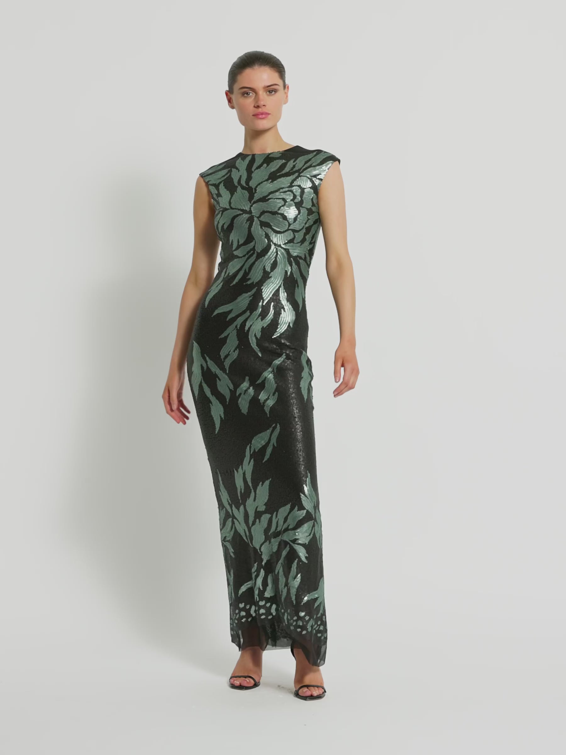 The Larissa Gown has a stunning mint floral design in sequins on stretch mesh which is fitted to the body as a figure flattering silhouette. Featuring a round neckline and cap sleeves, it falls to a slight A-line shape, finishing at maxi length with an open mesh hemline. A sophisticated showstopper for your next formal or black-tie event.