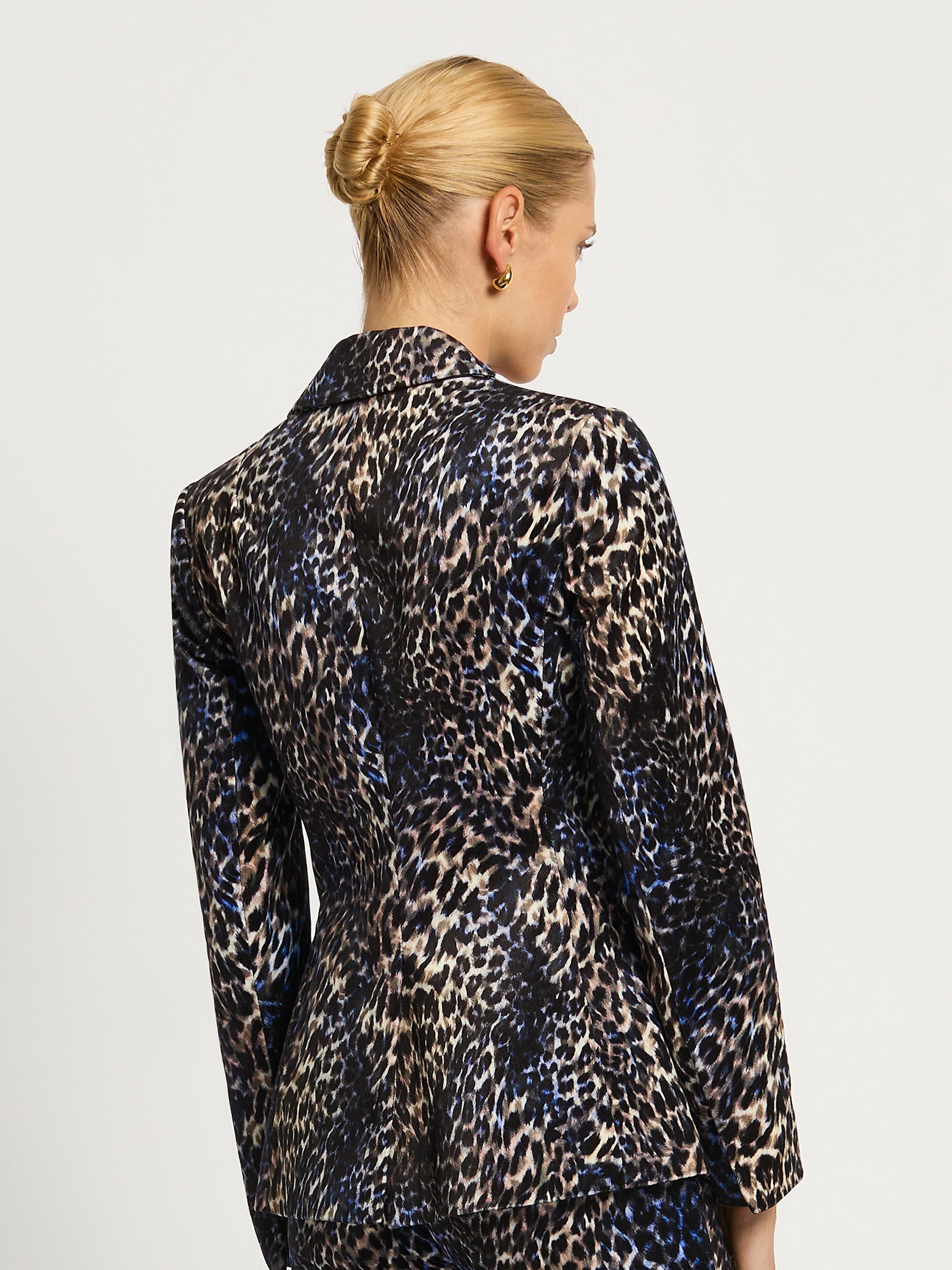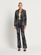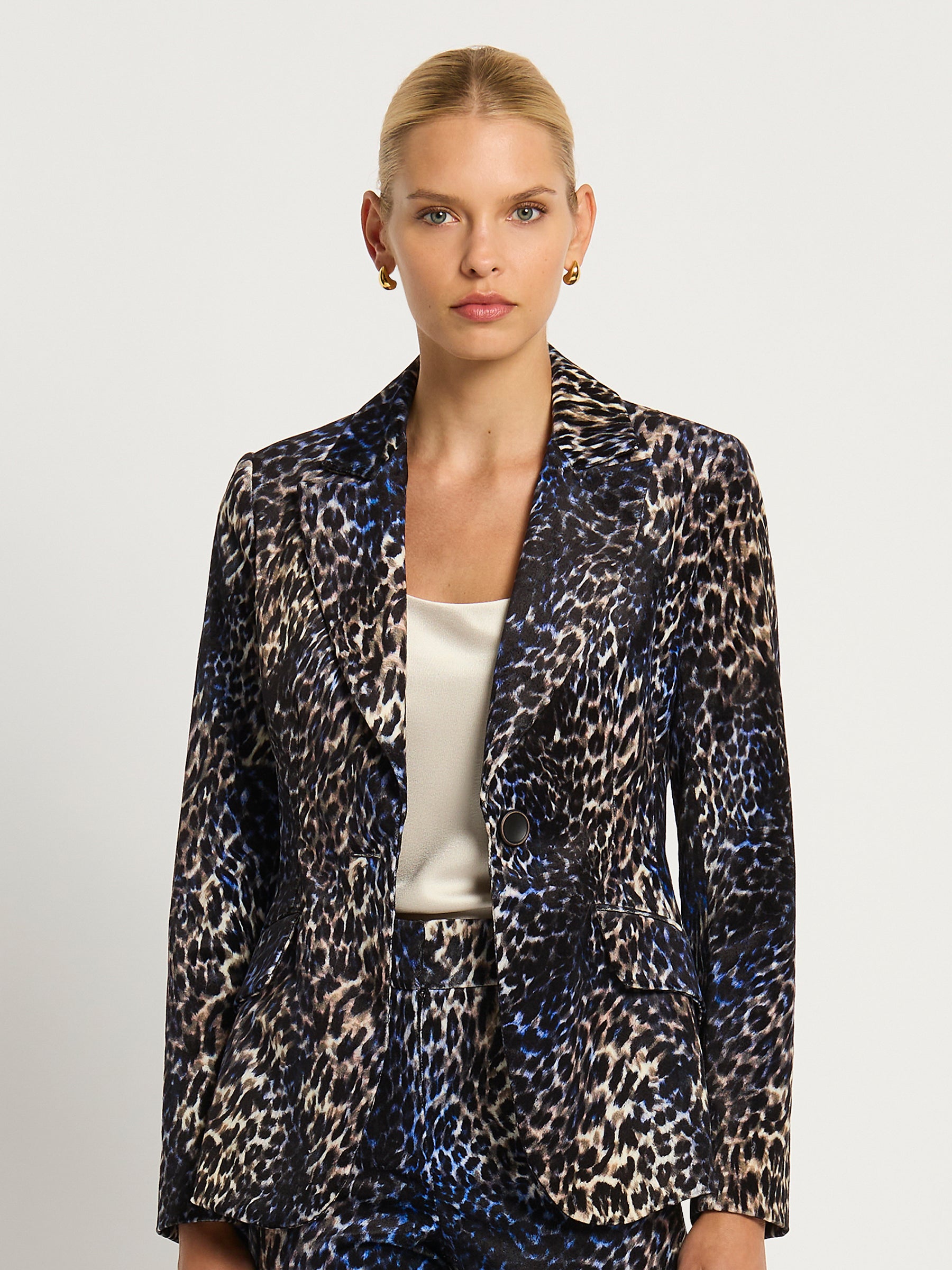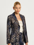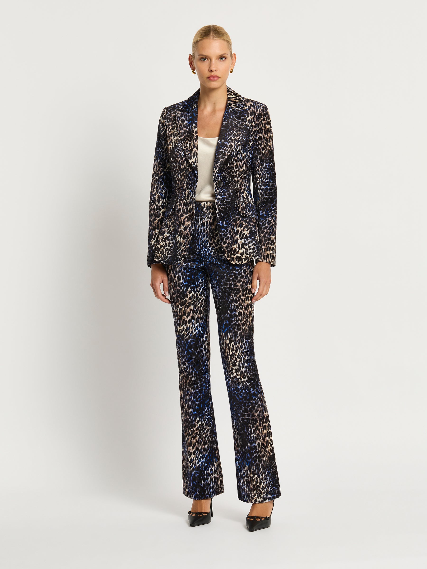 The Leo Blazer is tailored from a stretch velvet in a contemporary leopard print with tones of blue, chocolate and cream. Designed with a slim silhouette with peak lapels and functional jet pockets, features padded shoulders for added structure, creating a beautifully tailored look. The single-breasted design is secured with a button fastening through centre-front and is fully lined with stretch satin to ensure it can be smoothly layered over tops. A timeless piece with versatile styling options to be worn for years to come. Pair yours with the matching Leo Pant for a sophisticated look.