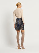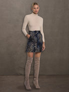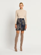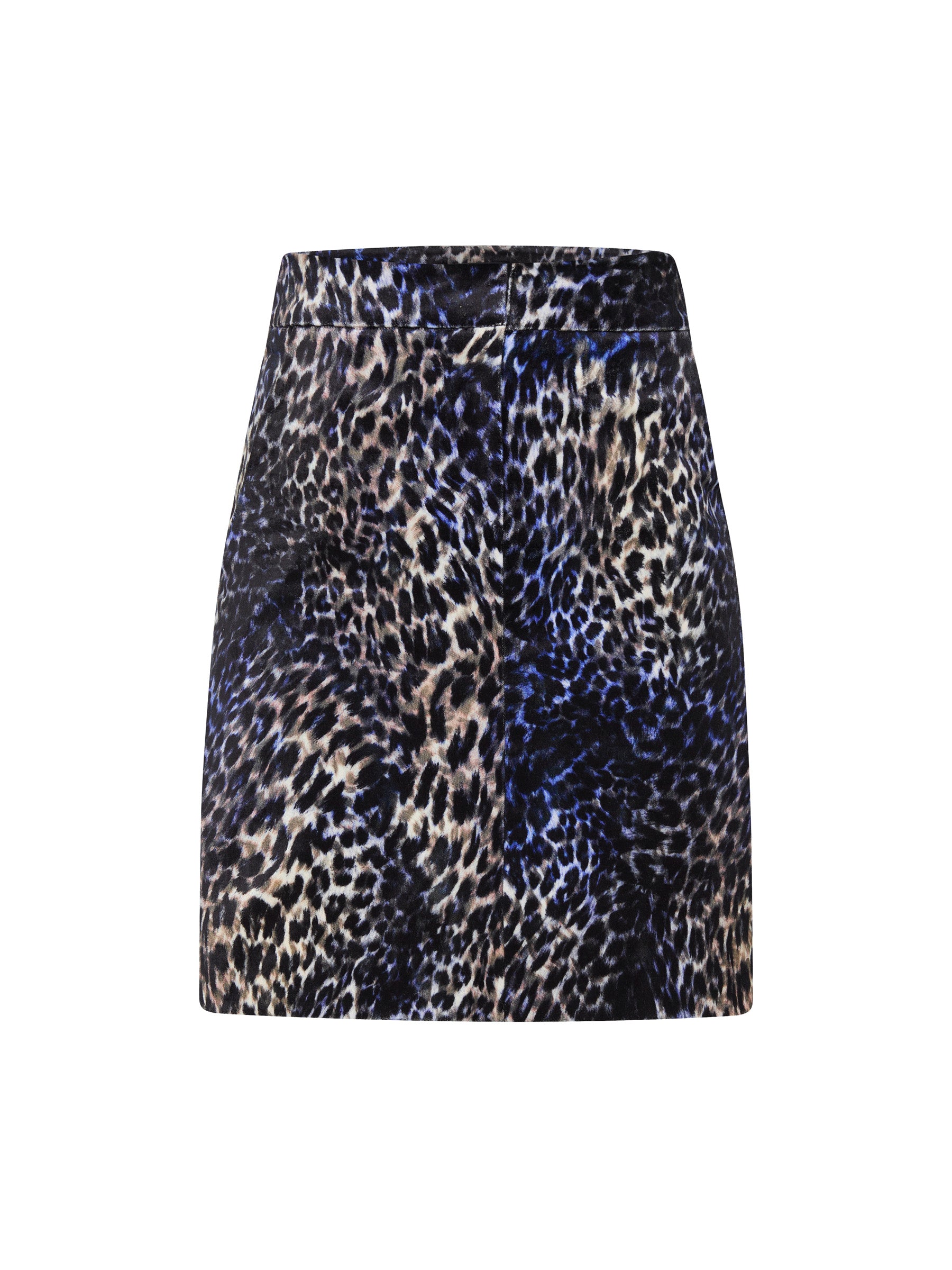 Crafted from a stretch velvet in a contemporary leopard print with tones of blue, chocolate and cream. The Leo Mini Skirt is fitted through the waist and hips for a tailored look with a concealed hook and zip fastening at centre front. The perfect skirt to leave an impression, style yours with the Leo Blazer for a sophisticated look or on its own as a statement piece.