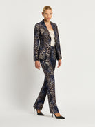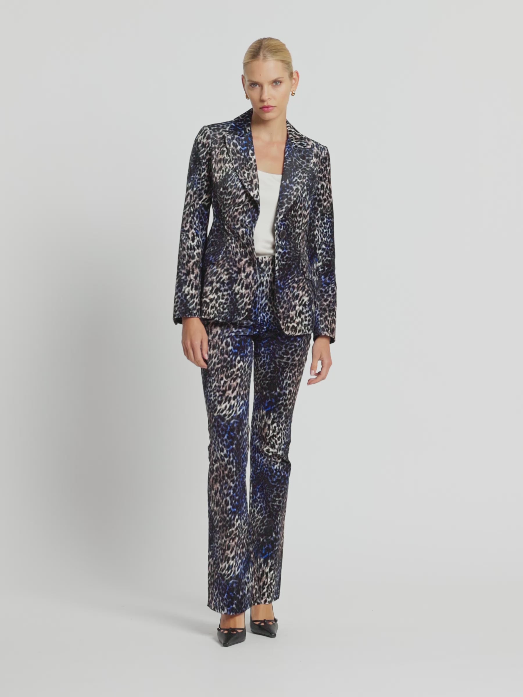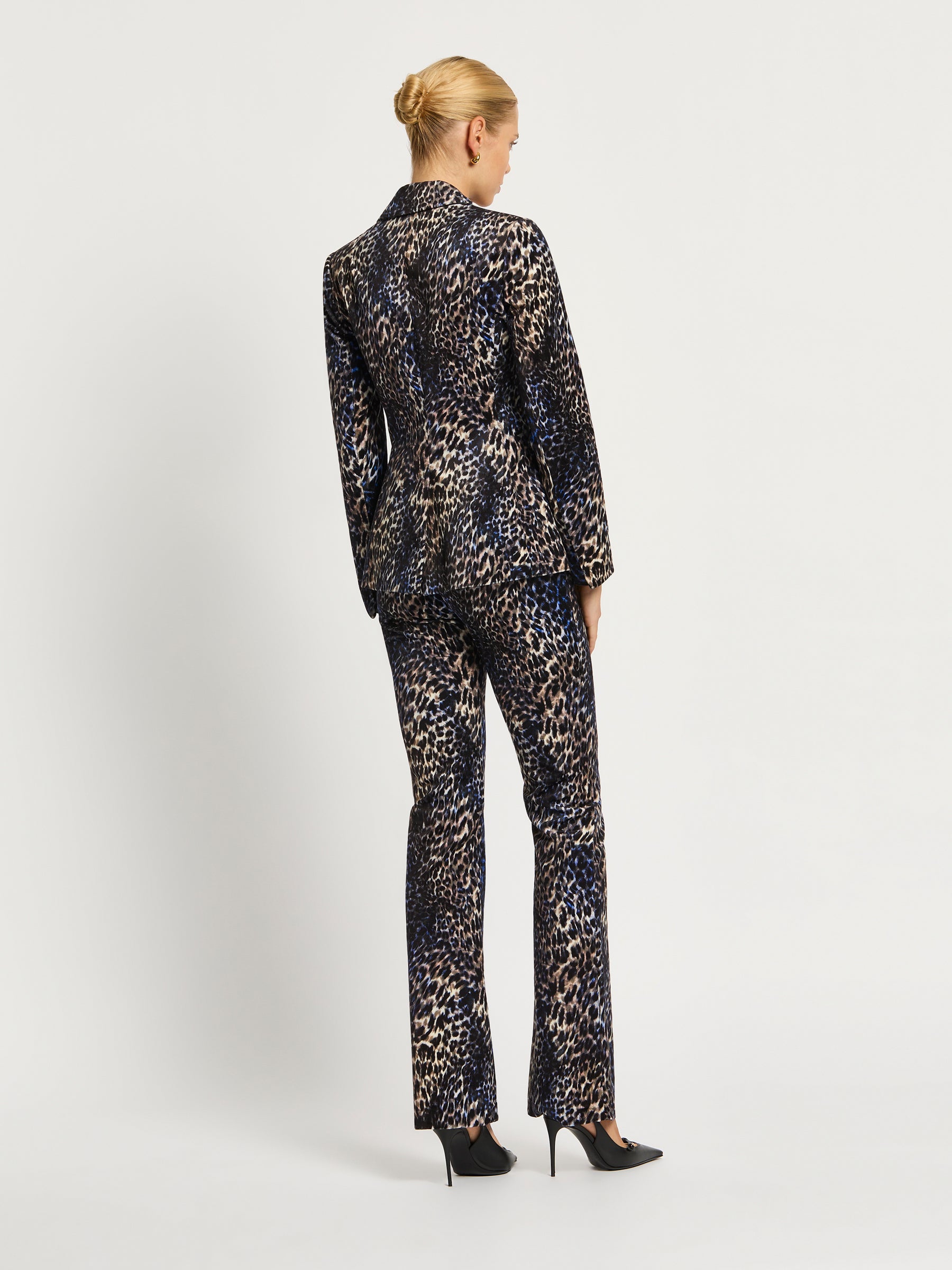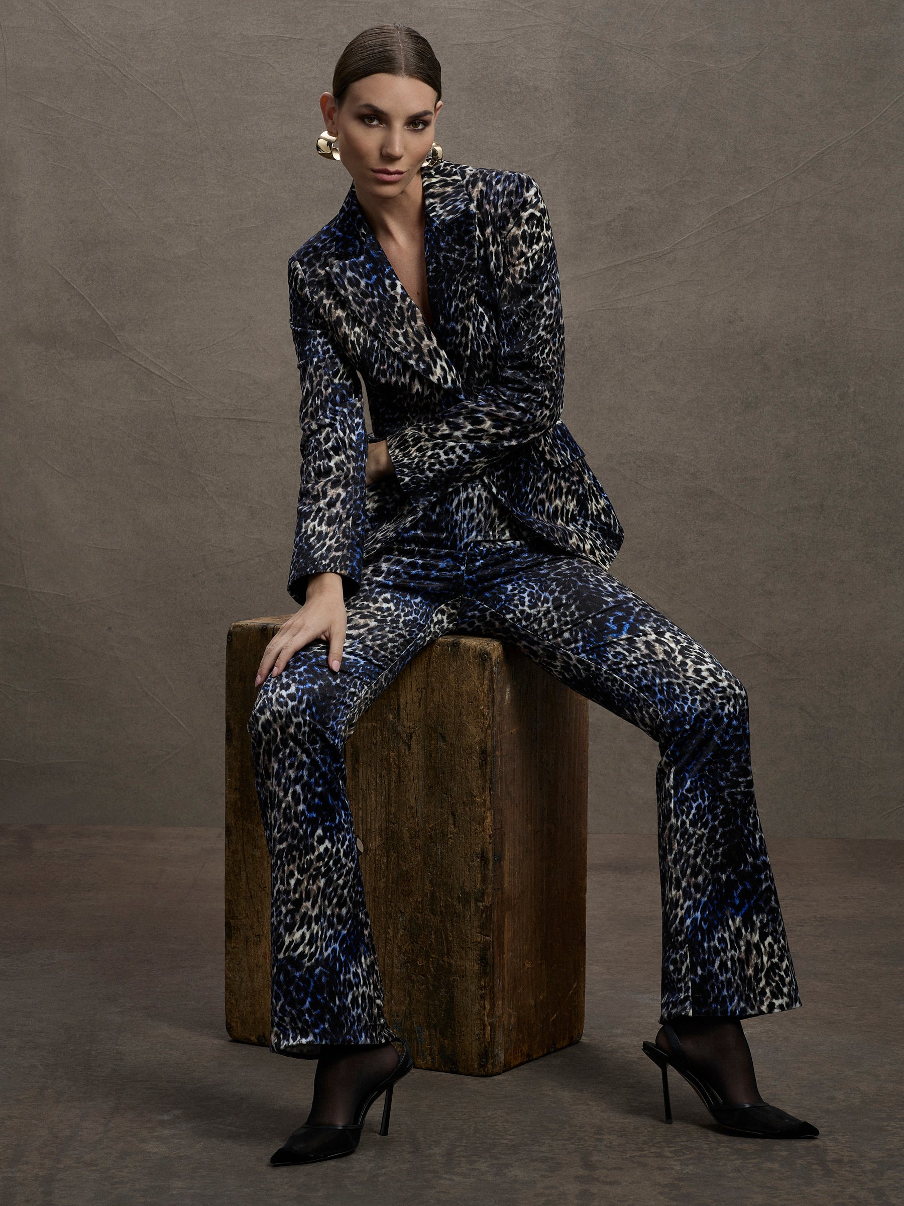 The Leo Pant is crafted from a stretch velvet in a contemporary leopard print with tones of blue, chocolate and cream. This pant features a slight flare hem, front and back welt pockets and a concealed hook and zip fastening at centre front. A versatile pant for any occasion, style yours with the Leo Blazer for a sophisticated look or on its own as a statement pant.