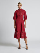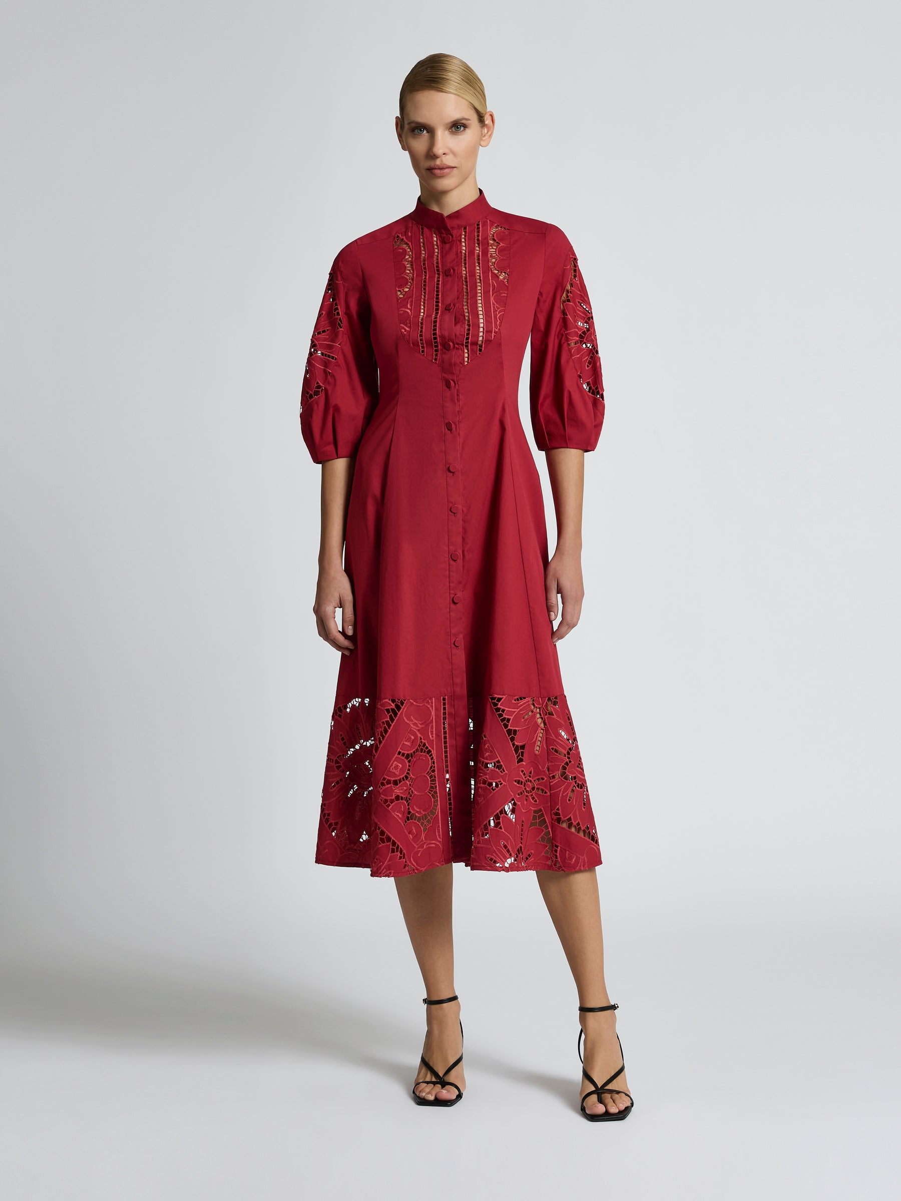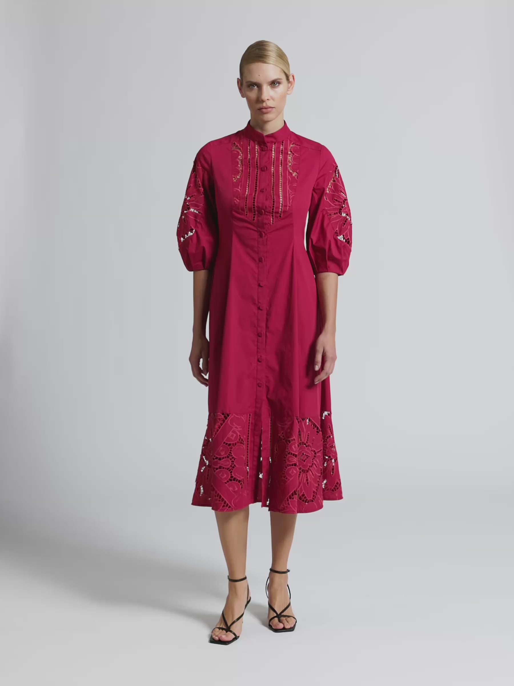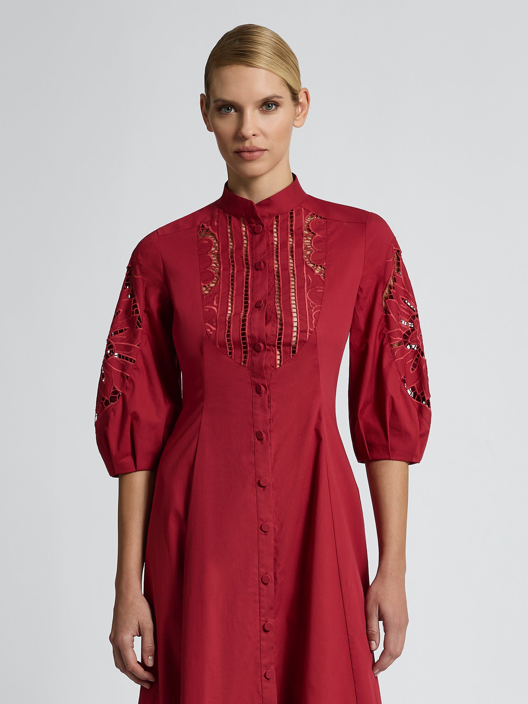 The effortlessly relaxed Letitia Shirt Dress features a cut-out geometric floral design in rich garnet-red on cotton poplin to create texture and dimension. Designed with elbow length sleeves and a flattering shapely silhouette, it gently flares into an A-line skirt detailed with embroidery along the hem. A centre-front covered button closure and discreet side pockets complete the look. Versatile and timeless, this piece transitions seamlessly from work to night with understated charm.