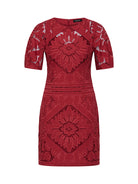 Intricately embroidered with a cut-out geometric floral design in rich garnet-red on cotton poplin that adds texture and dimension. The Letitia Short Dress is a mini shift silhouette, fitted through the body with a round neckline, elbow-length sleeves finishing above the knee. A matching cotton slip is included for effortless layering and comfort.