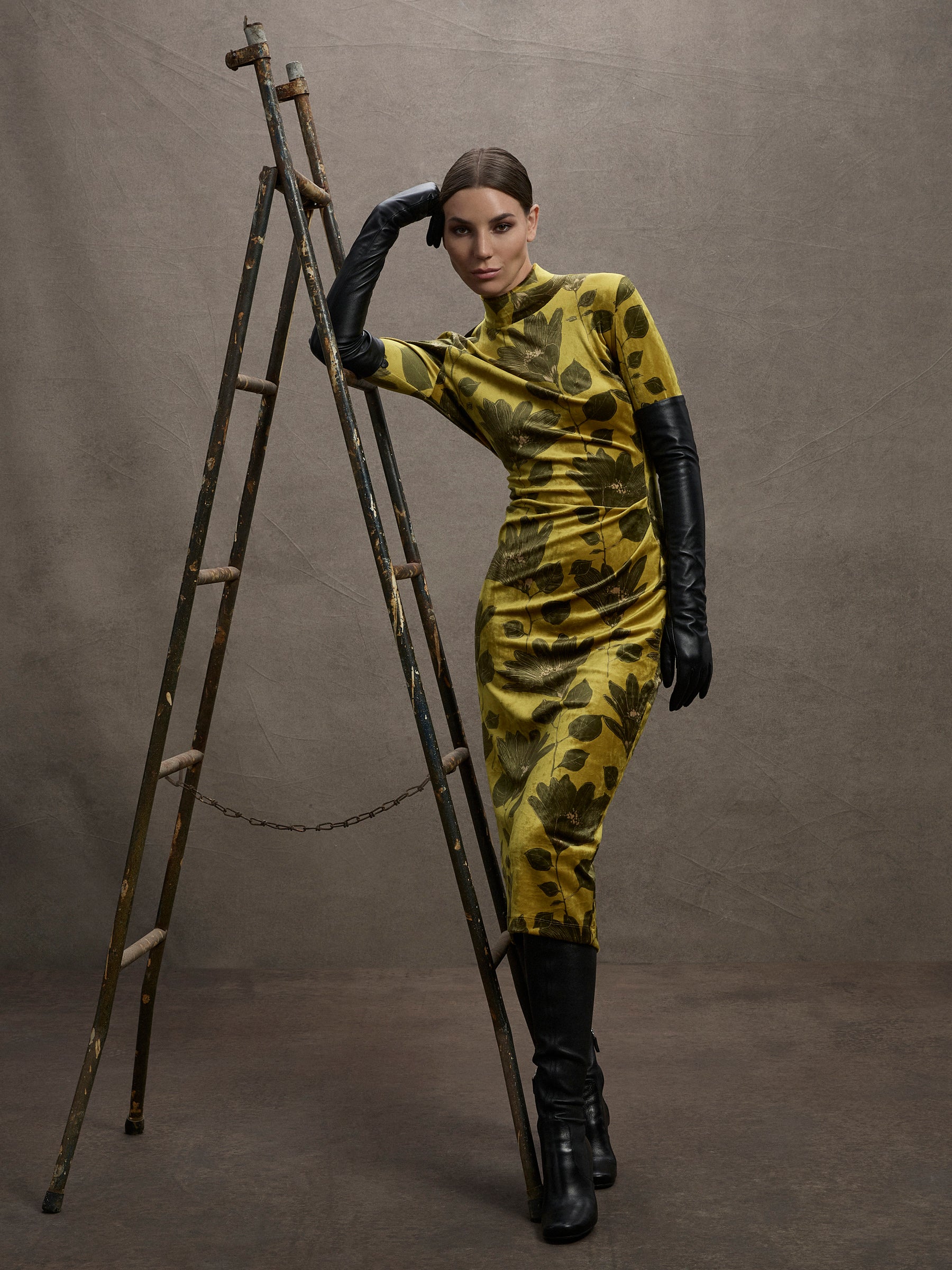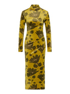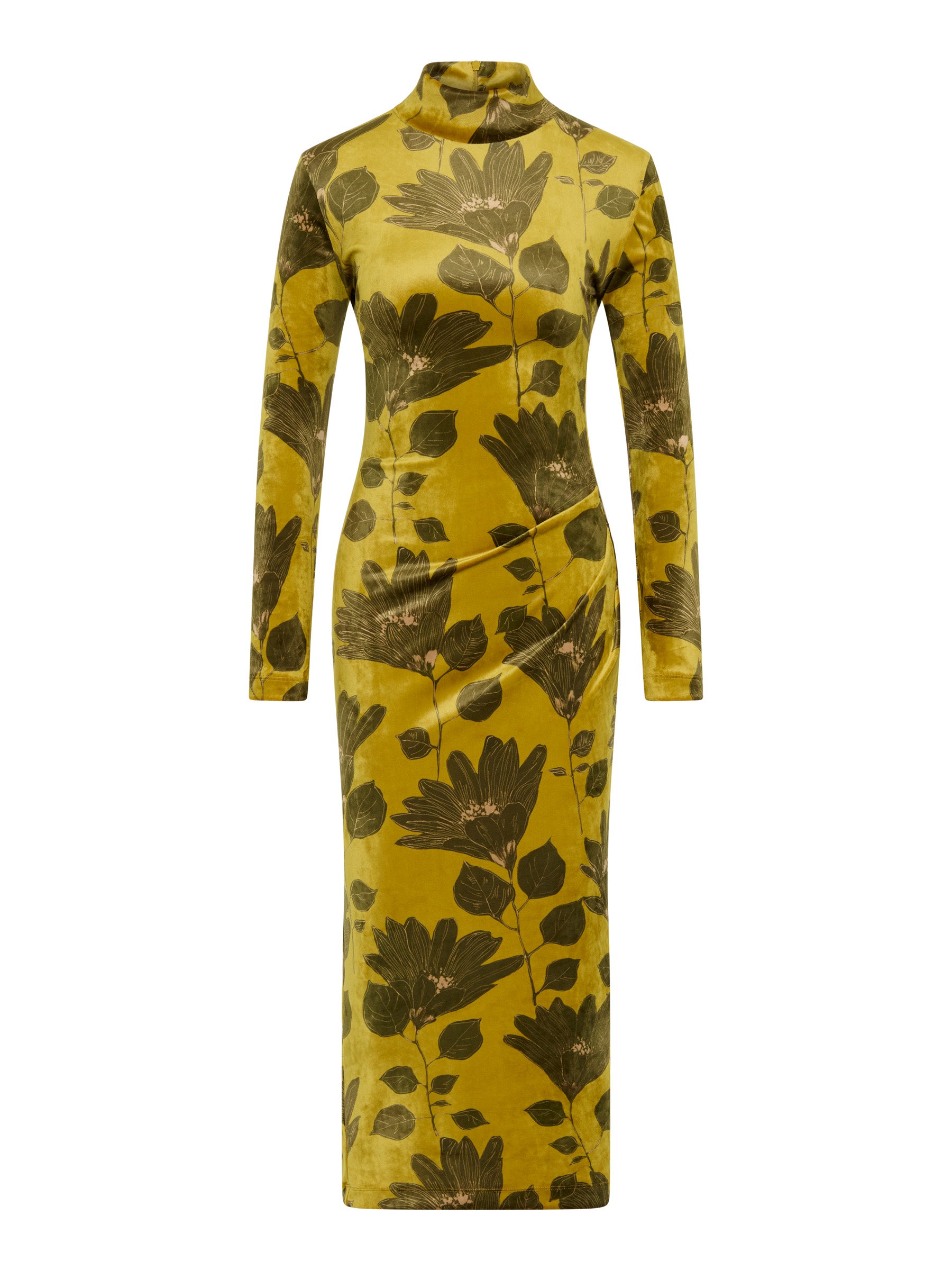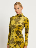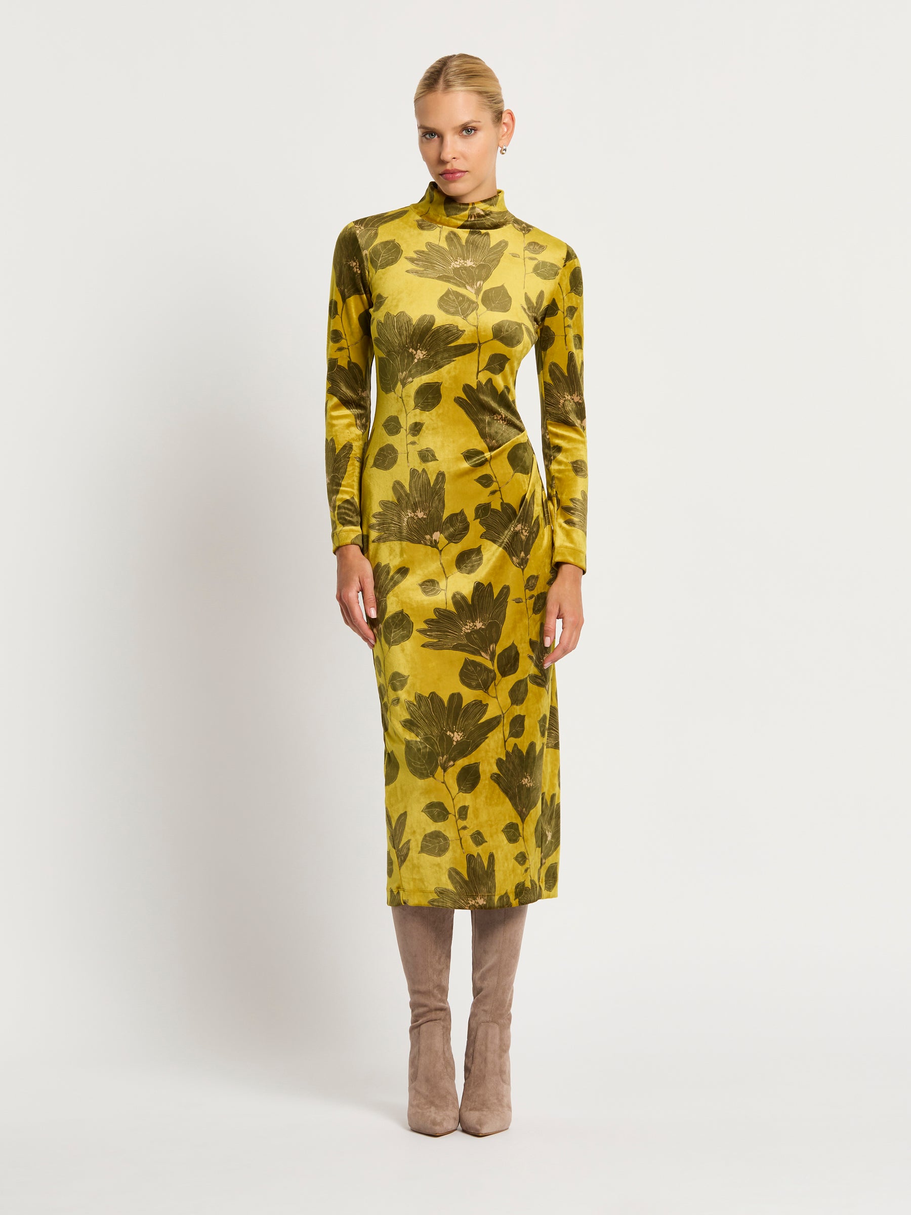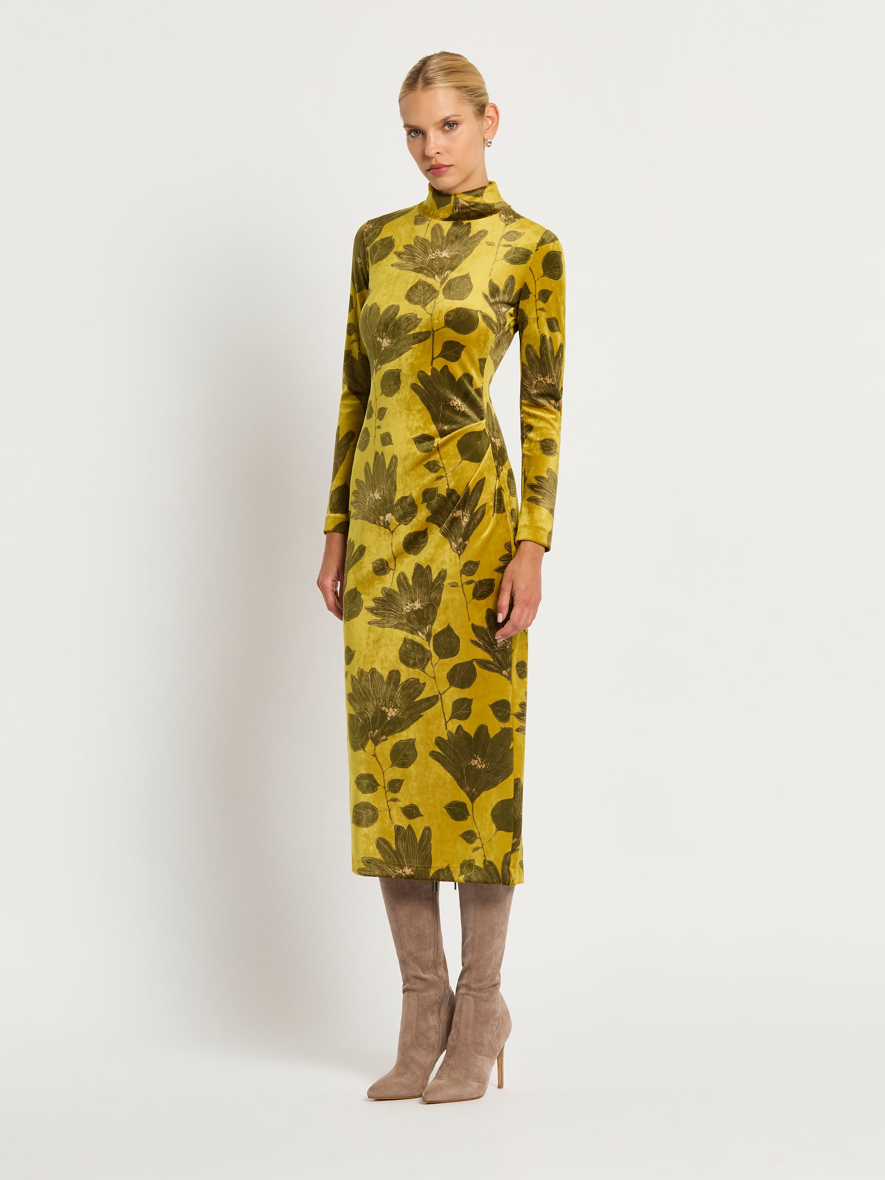 Crafted from rich, ochre coloured stretch velvet with a olive green floral print and camel highlights, the Lindsay Shift has the style and comfort to be the centrepiece of your autumn-winter wardrobe this year. Discrete panelling and tuck detailing through the front creates a shapely flattering silhouette and the long sleeves make this a comfortable yet stunning choice for any day or night.