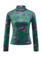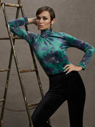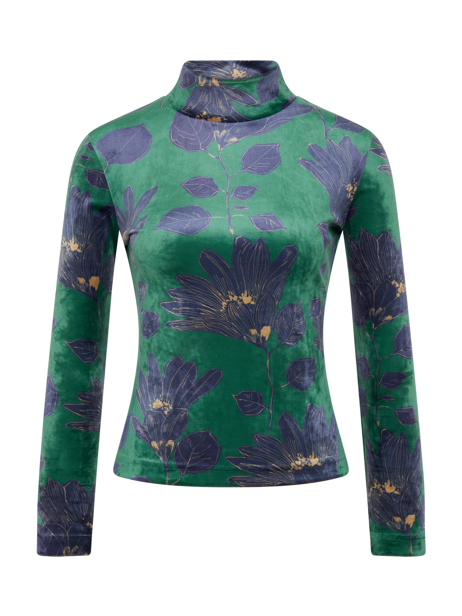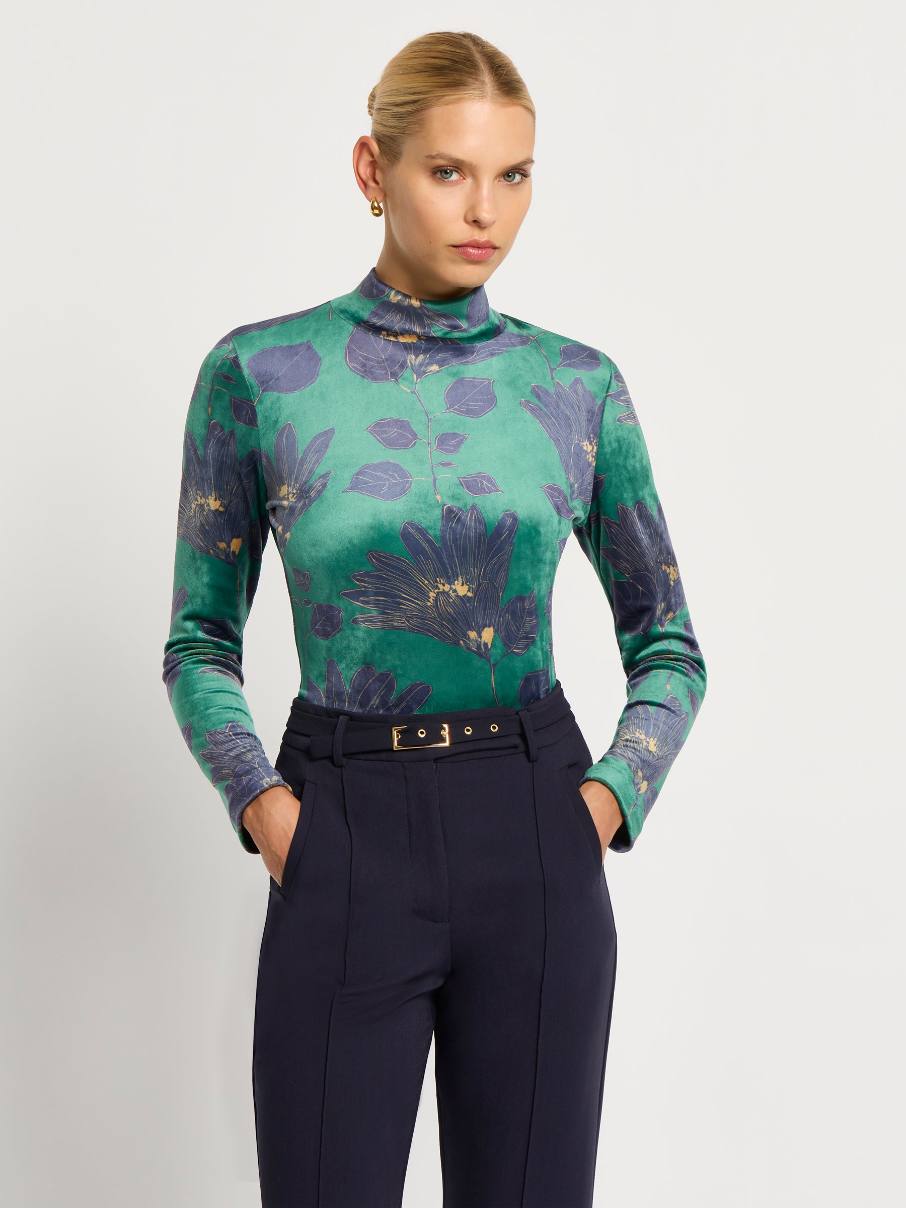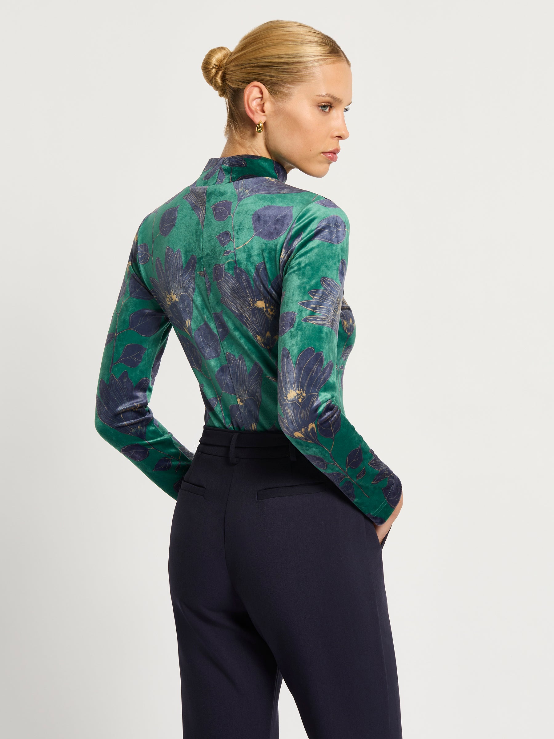 Crafted from rich, jade coloured stretch velvet with a navy floral print and camel highlights, the Lindsay Top has the style and comfort to be a staple in your autumn-winter wardrobe this year. Fitted through the body with a comfortable high neckline and button and loop closures at centre back creating a shapely flattering silhouette. The long sleeves make this a comfortable yet stunning choice for any winter’s day.