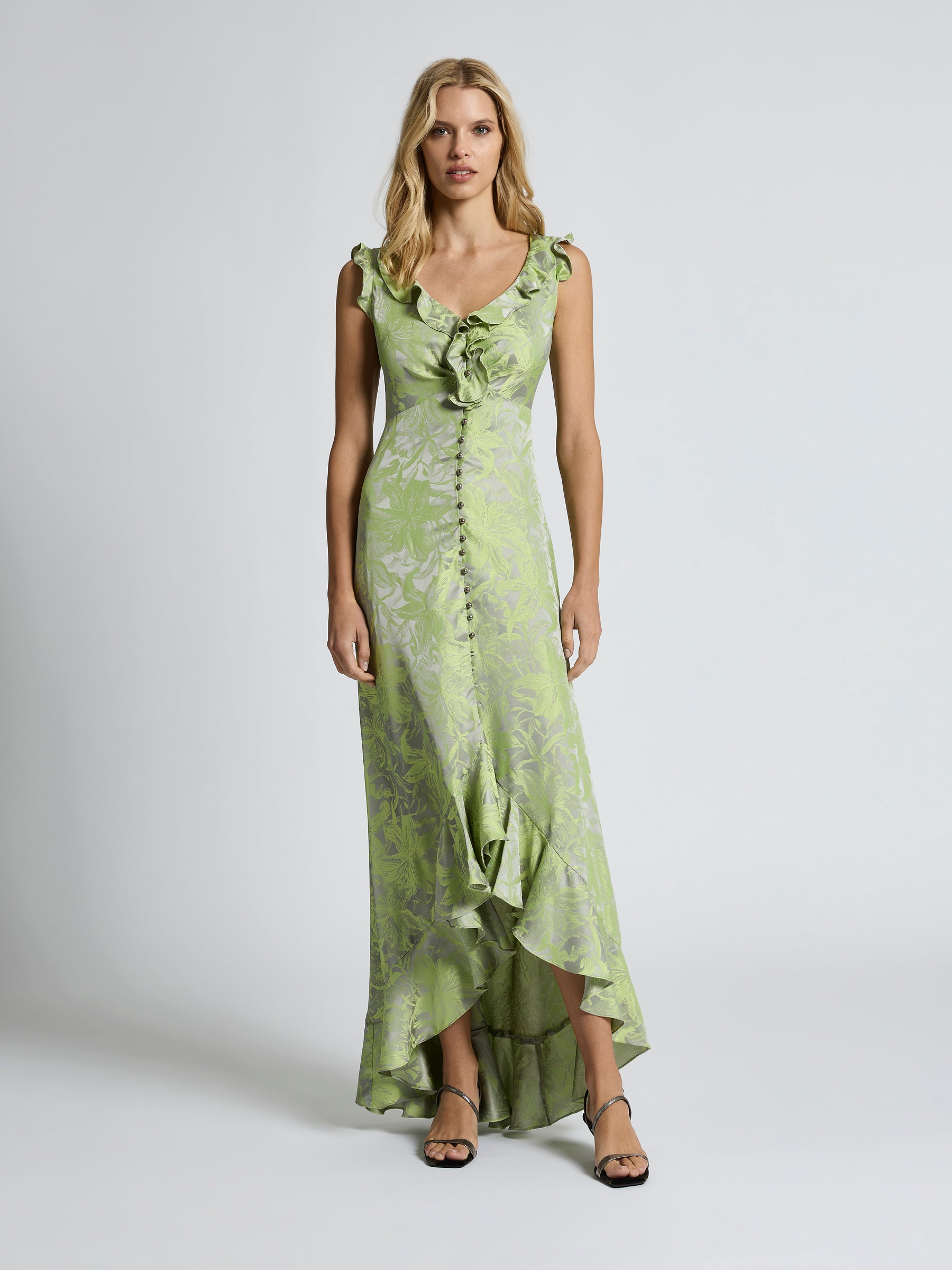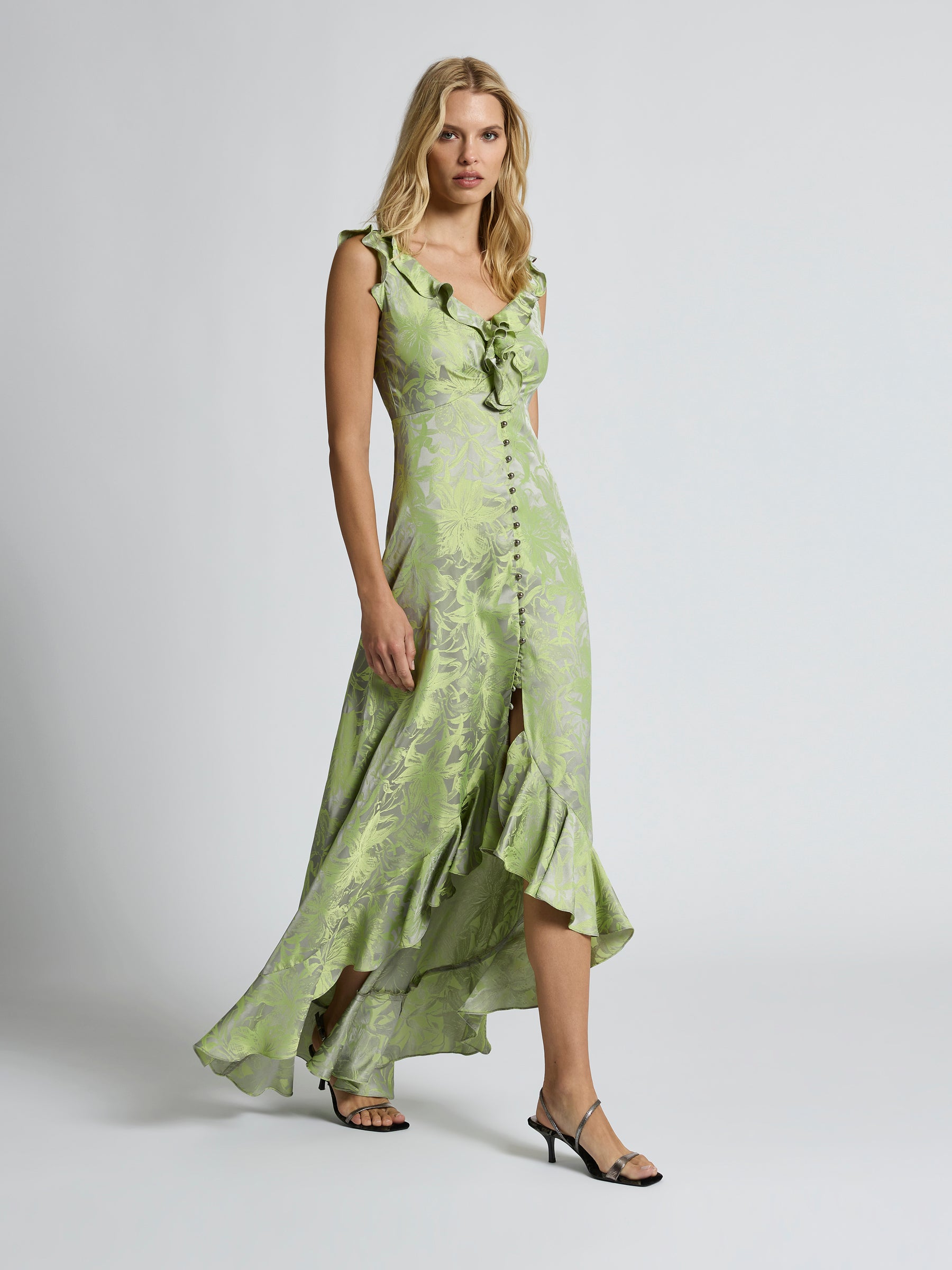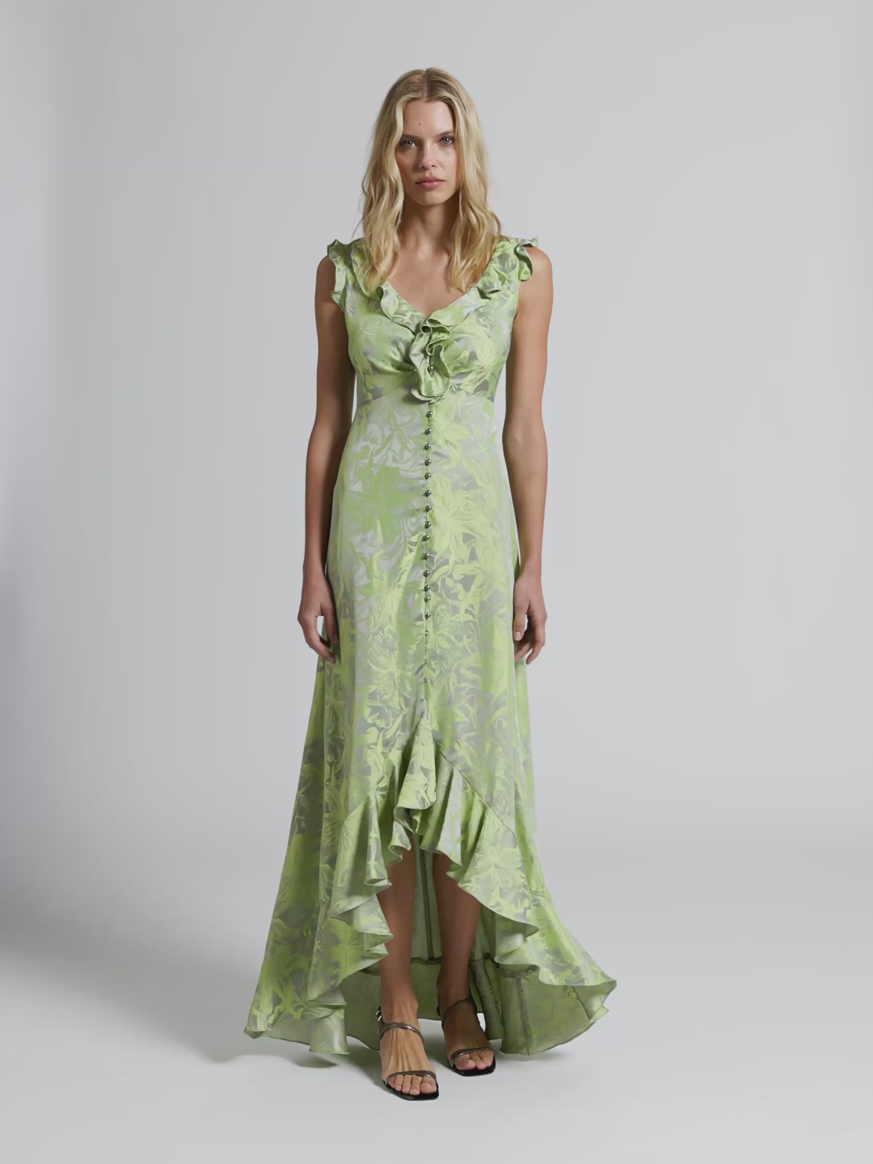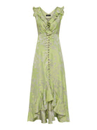 Effortlessly elegant, the Lolita Maxi is crafted from a two-tone draped jacquard with a vibrant citrus floral design on a silver-grey background. Its graceful drape and softly flowing silhouette features a V-neckline with flounce detailing and an under bust seam to sculpt the bodice. Buttoned through the front and flowing to a gentle A-line high low flounce maxi hem, adding a soft, feminine touch to this elevated style. Perfect for garden parties or evening events, the Lolita Maxi will leave an impression at your next event.