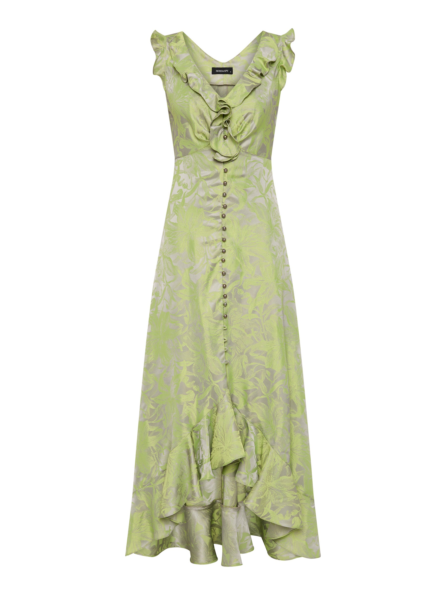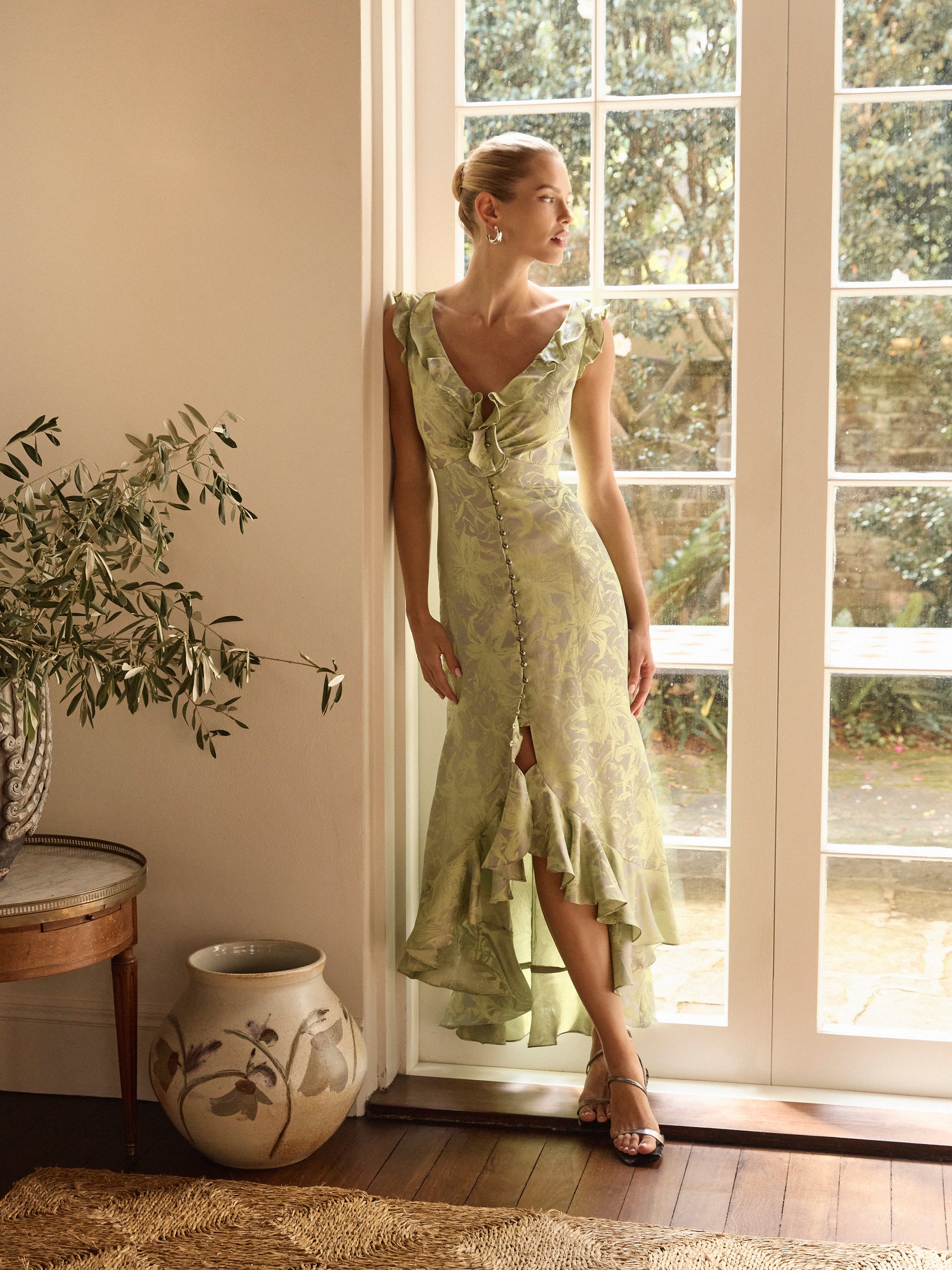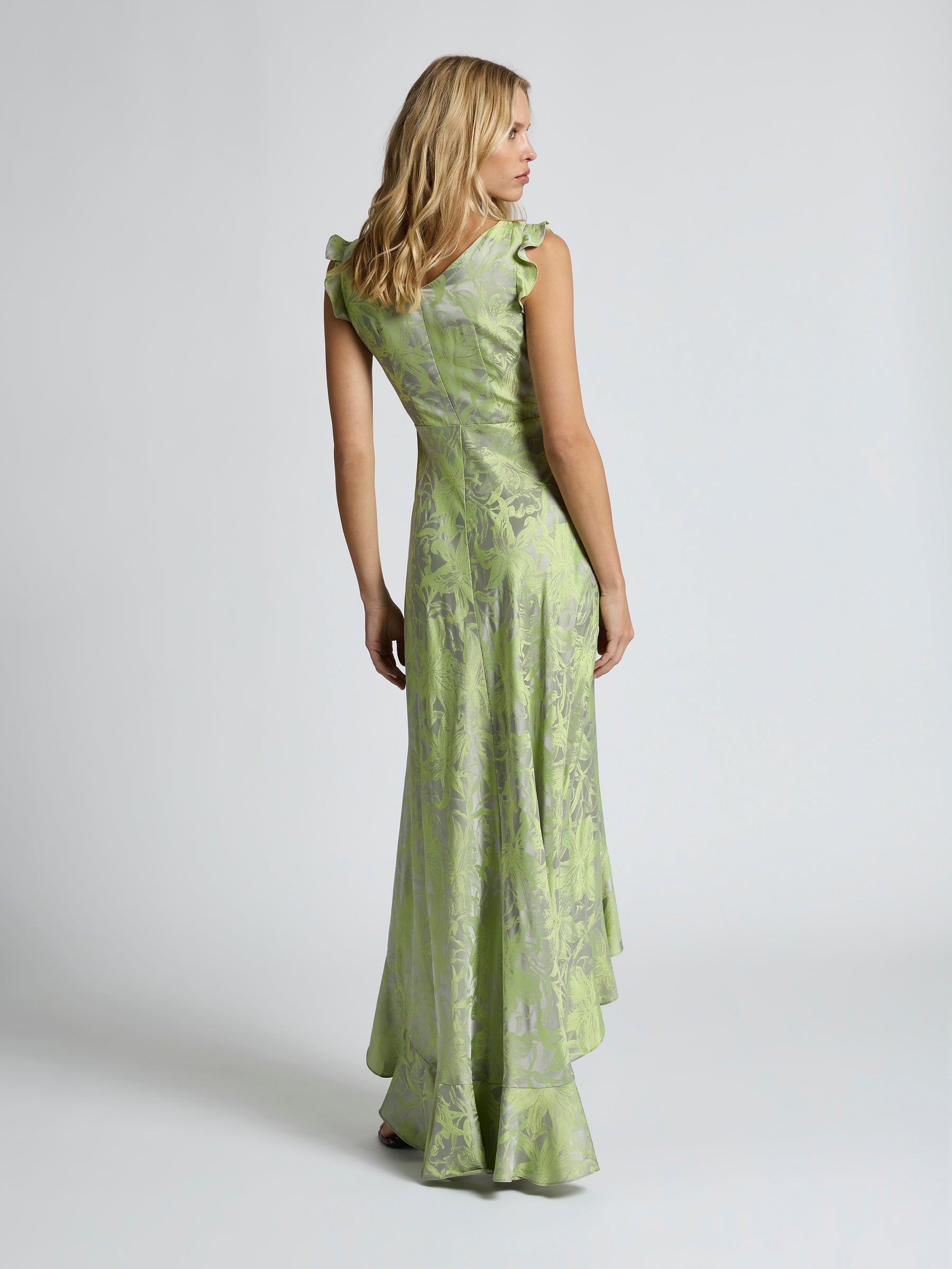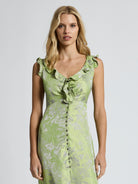 Effortlessly elegant, the Lolita Maxi is crafted from a two-tone draped jacquard with a vibrant citrus floral design on a silver-grey background. Its graceful drape and softly flowing silhouette features a V-neckline with flounce detailing and an under bust seam to sculpt the bodice. Buttoned through the front and flowing to a gentle A-line high low flounce maxi hem, adding a soft, feminine touch to this elevated style. Perfect for garden parties or evening events, the Lolita Maxi will leave an impression at your next event.
