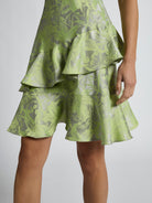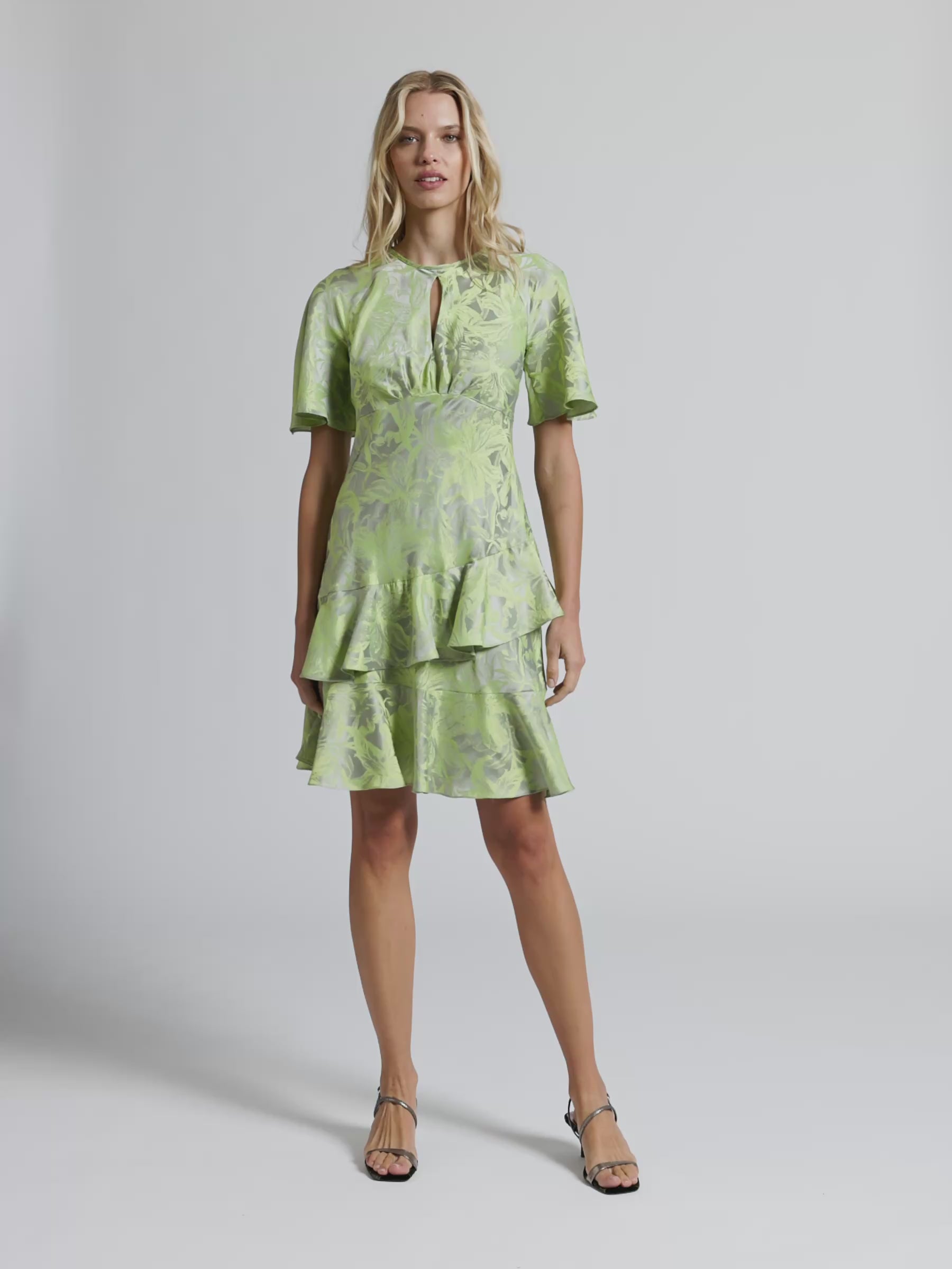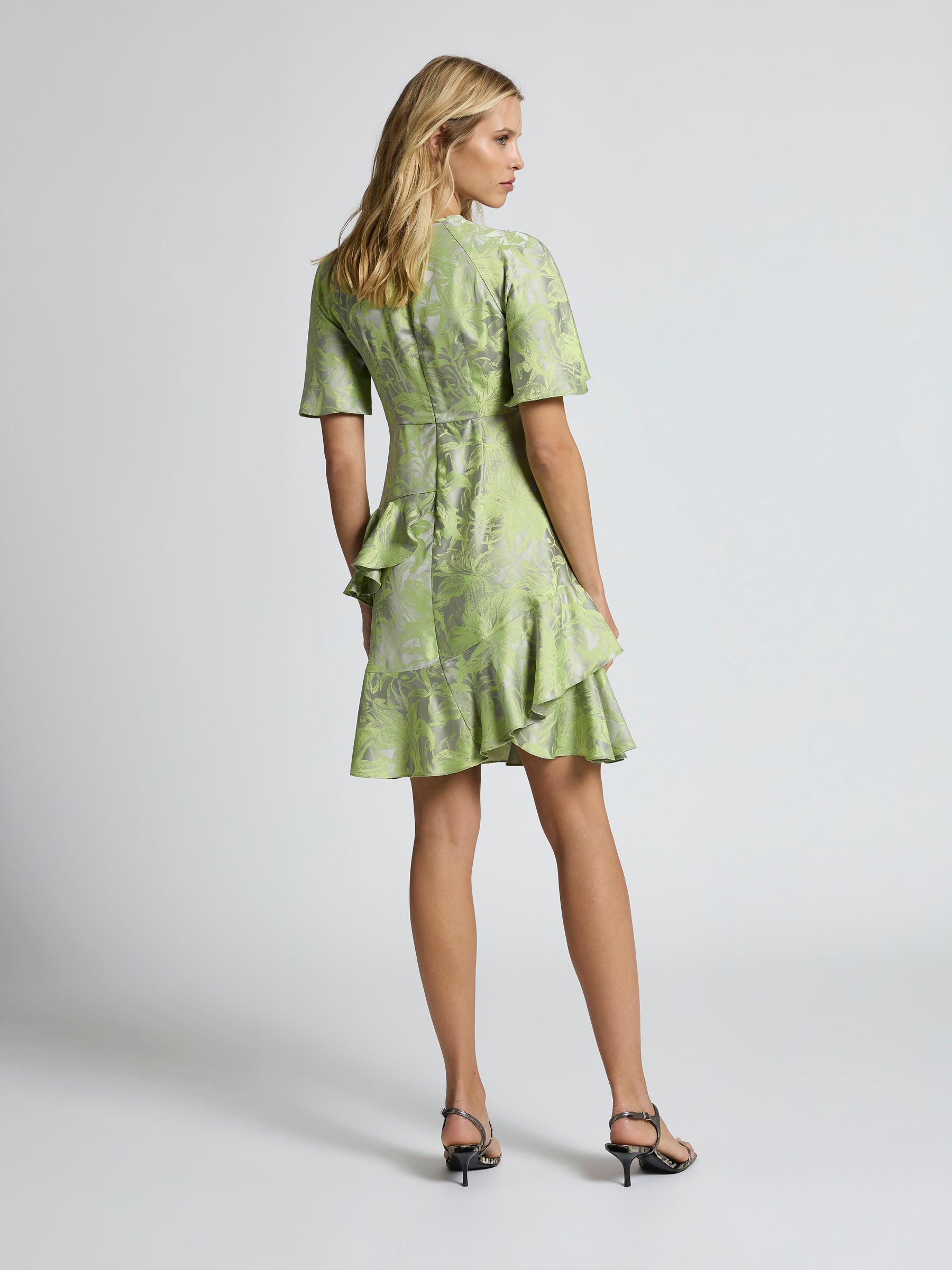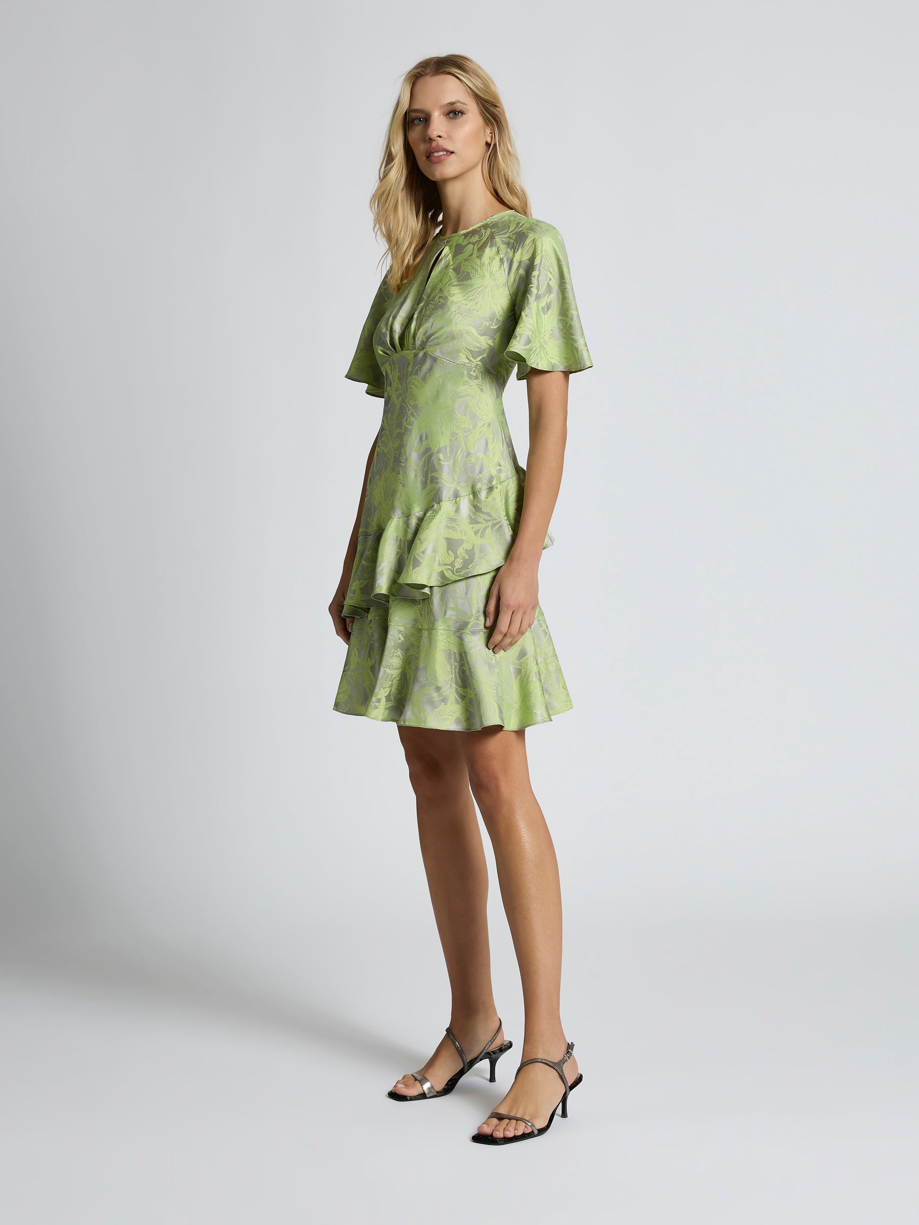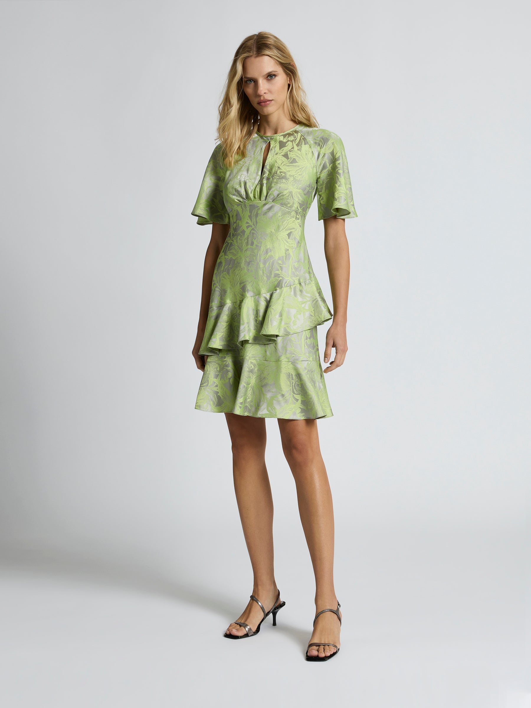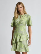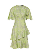 Effortlessly elegant, the Lolita Short Dress is crafted from a two-tone draped jacquard with a vibrant citrus floral design on a silver-grey background. A keyhole neckline and under bust seam sculpt the bodice, flowing to a gentle A-line silhouette. The layered flounce hem and flounce sleeves add a soft, feminine touch to this elevated style. Perfect for garden parties or evening events, the Lolita Short Dress will make a lasting impression.