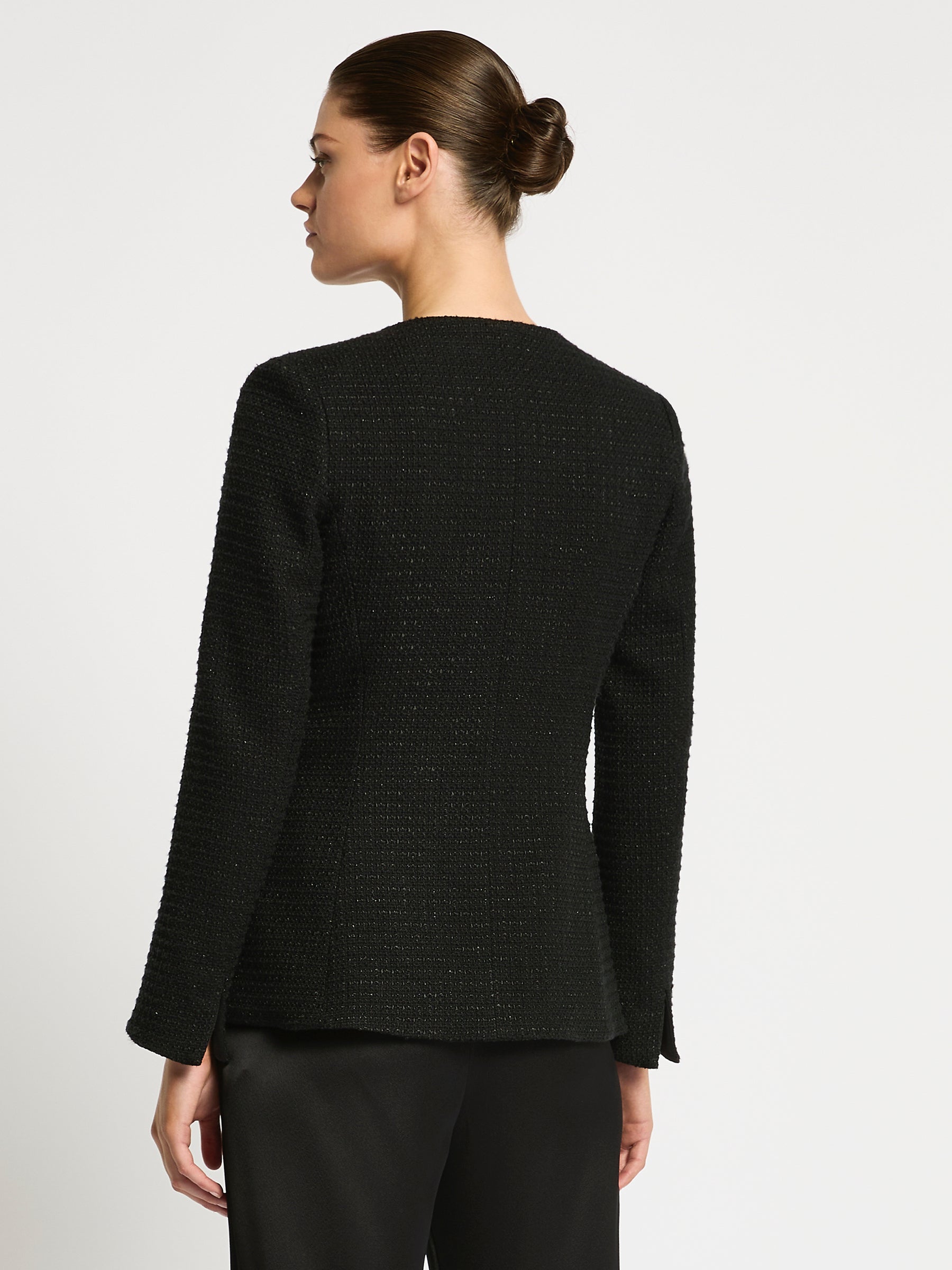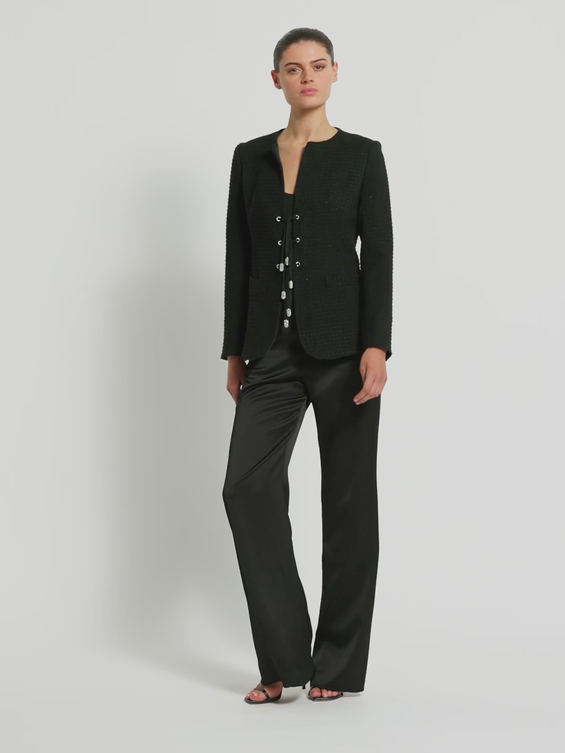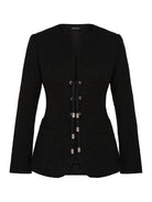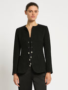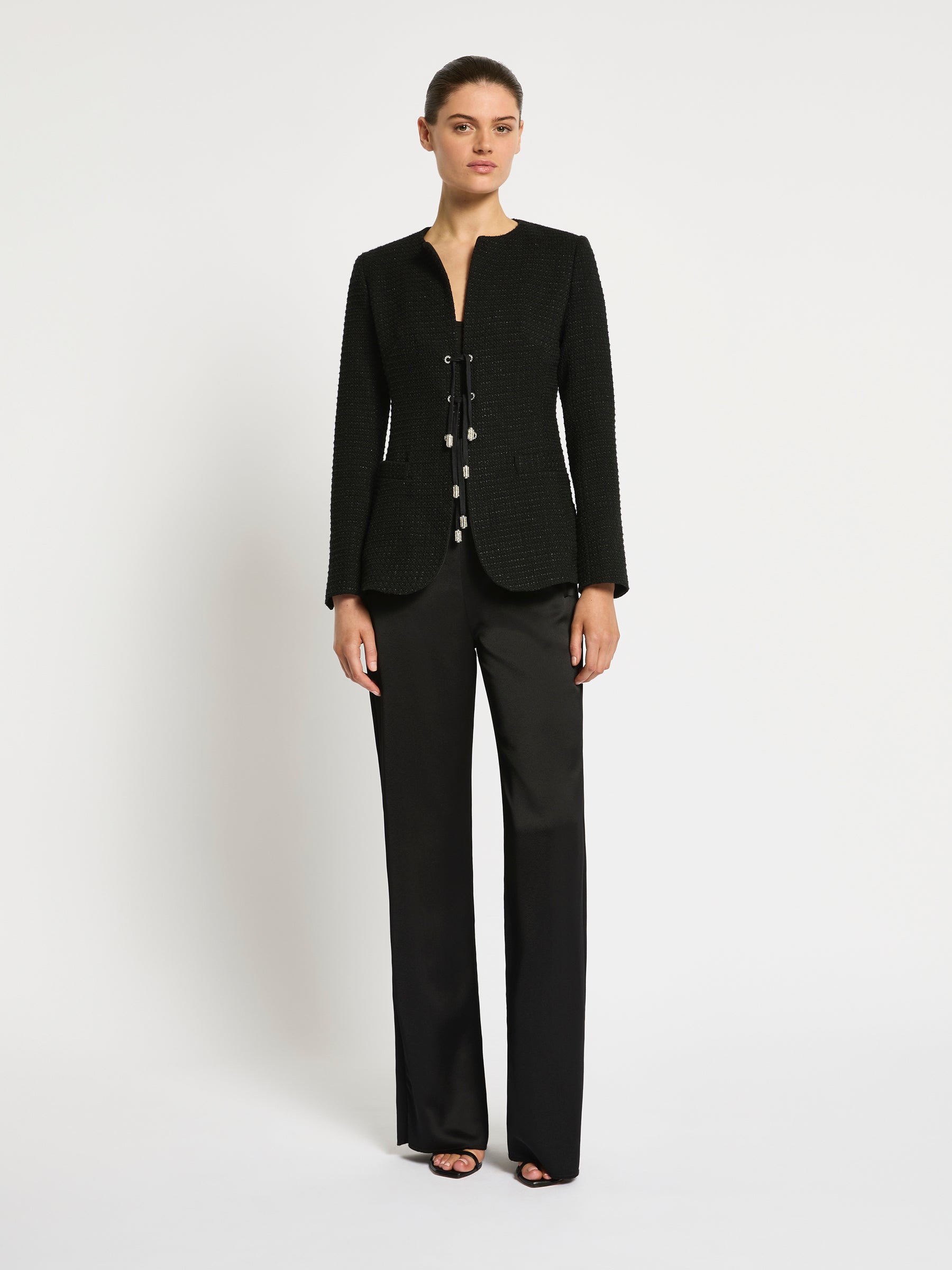 Crafted from an Italian stretch tweed fabrication in a cotton viscose blend, the Luna Jacket is a timeless refined style that will be a favourite in your wardrobe. This statement collarless jacket is fitted through the body with silver diamante eyelets and diamante tie toggles on a cotton draw string, featuring a split on the sleeves and side pockets. Pair the Luna Jacket with the Luna Short or Rachel Pant for a sophisticated look.