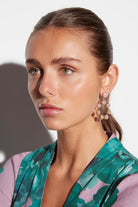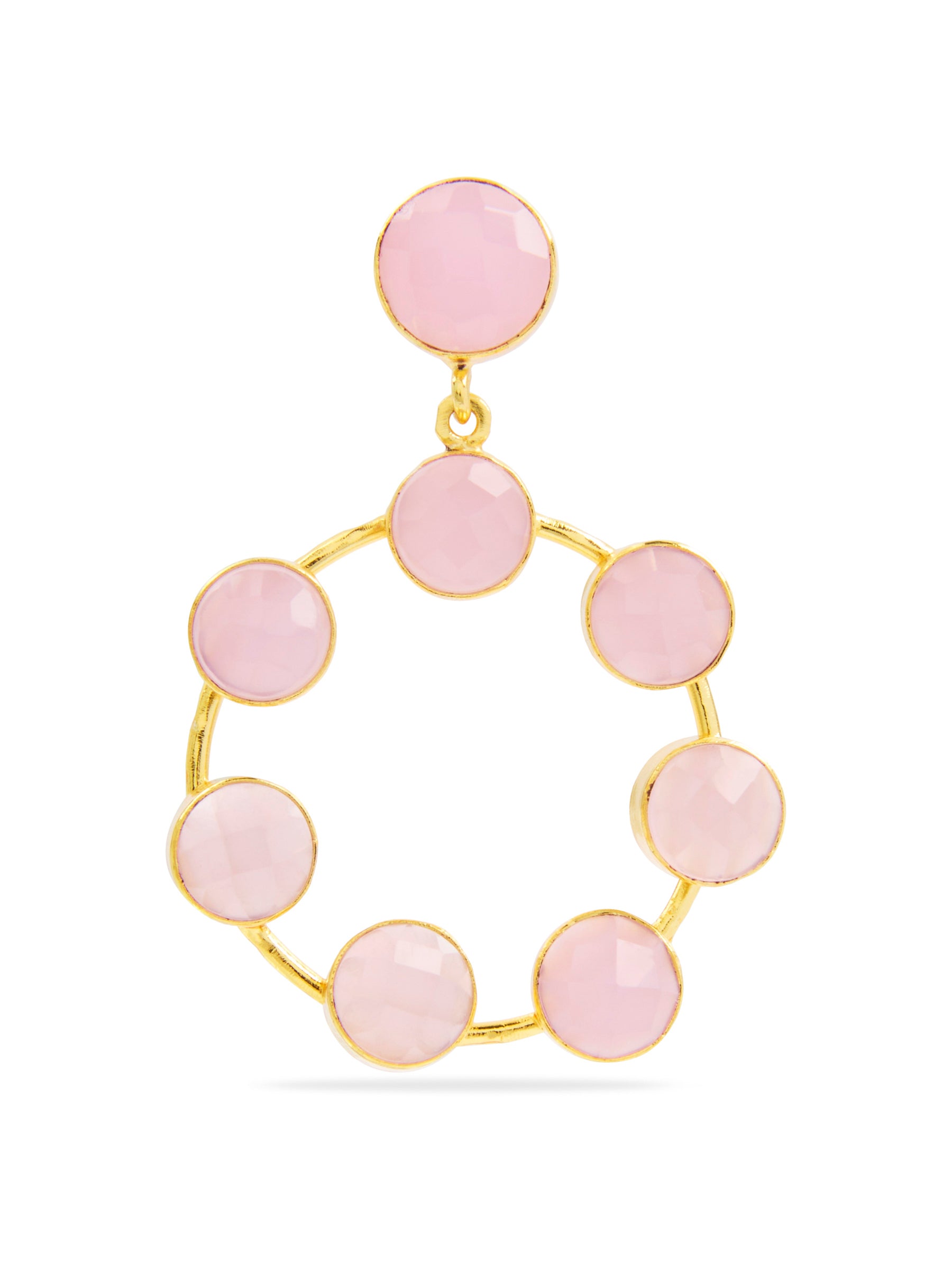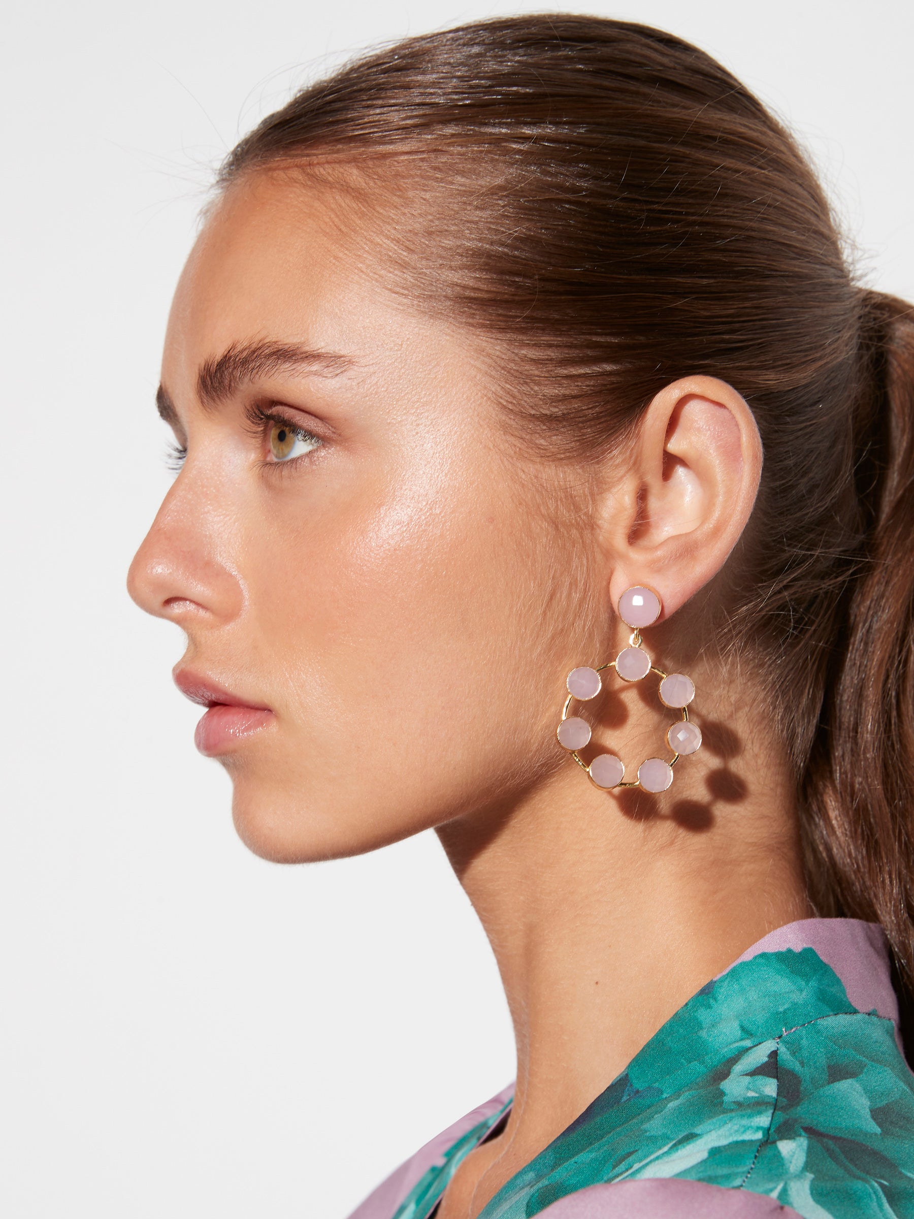 The Lydia Earring is hand made from semi-precious natural stones with brass metal. These round drop earrings feature eight round purple amethyst stones individually encased, with a stud back for pierced ears.