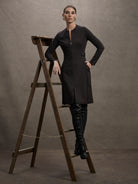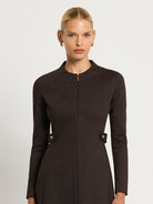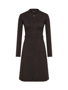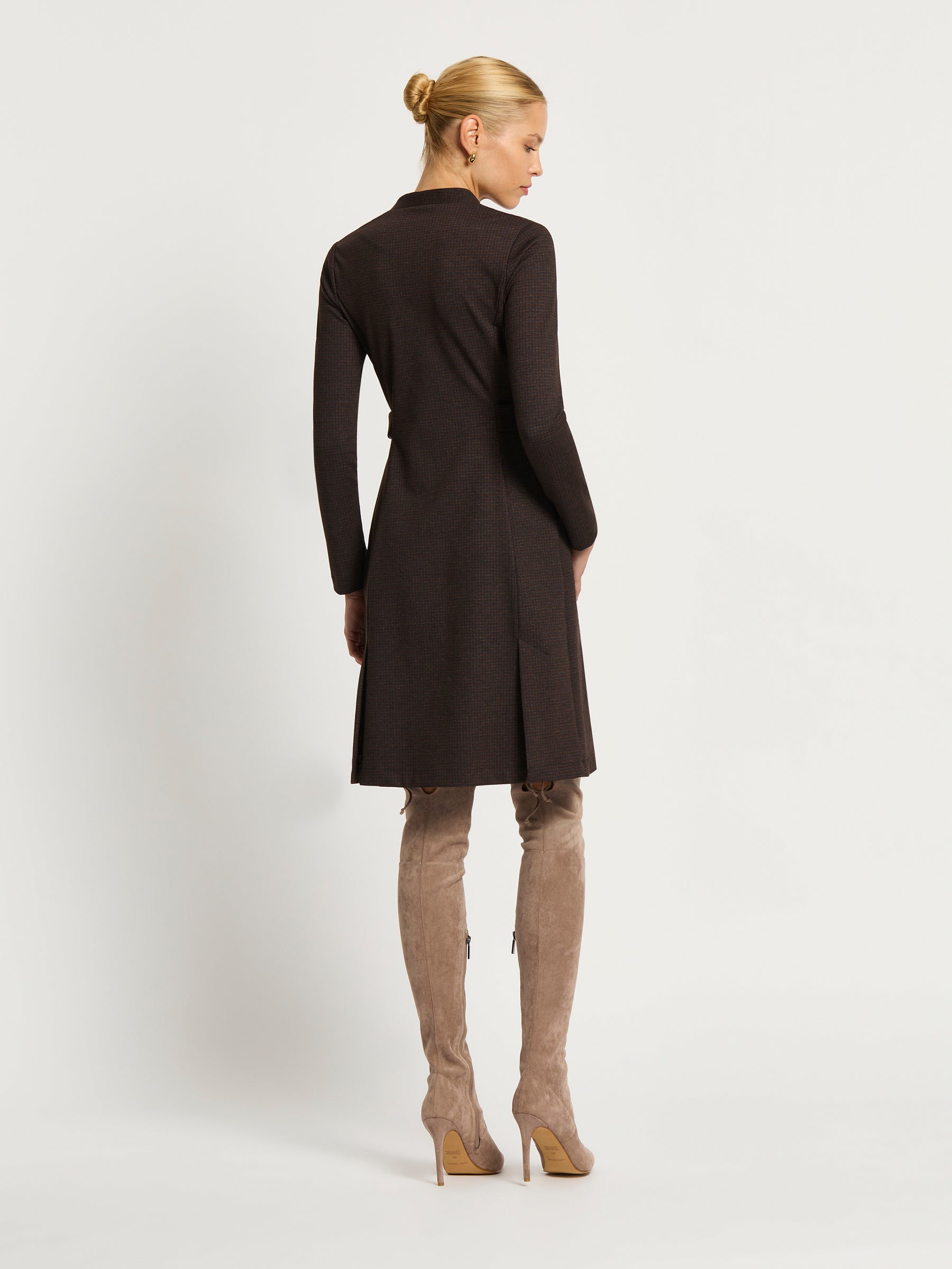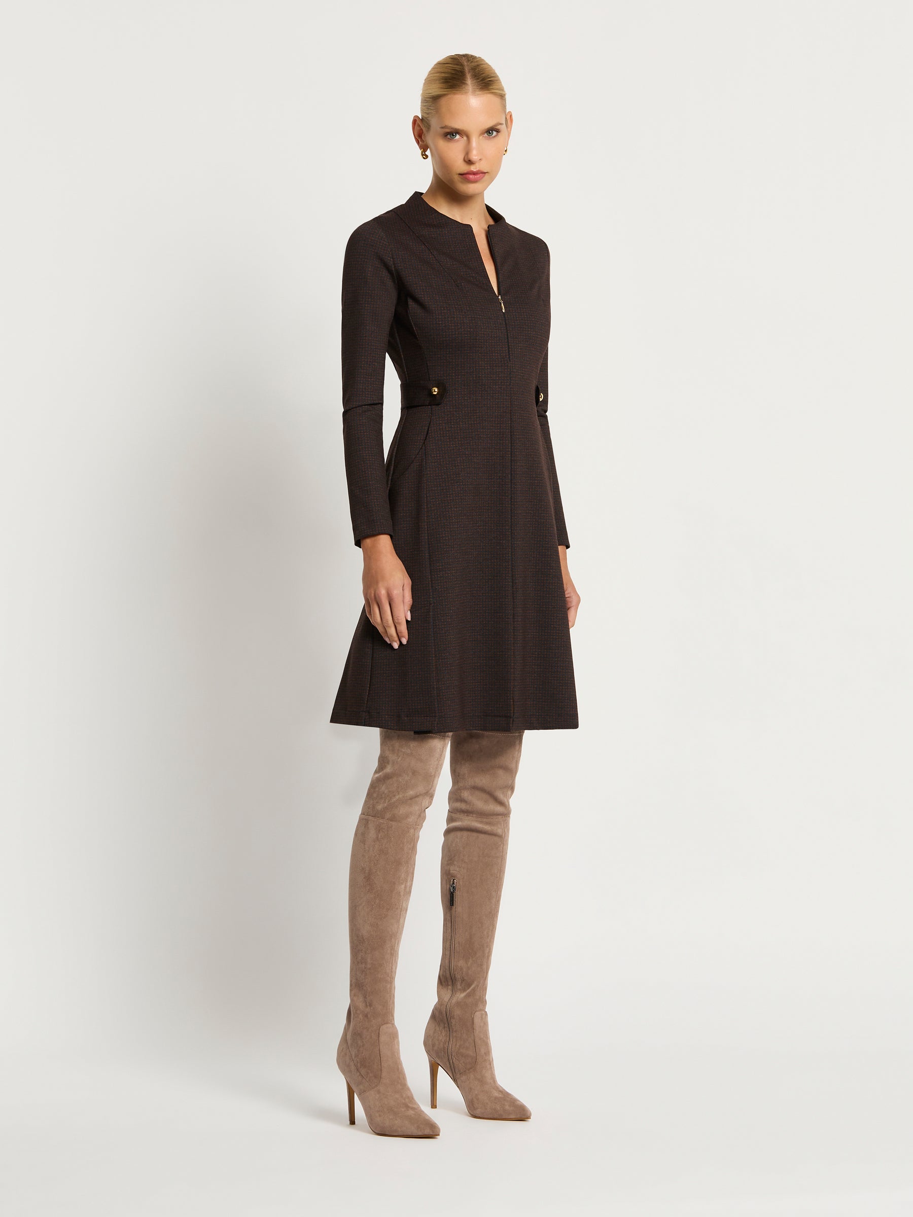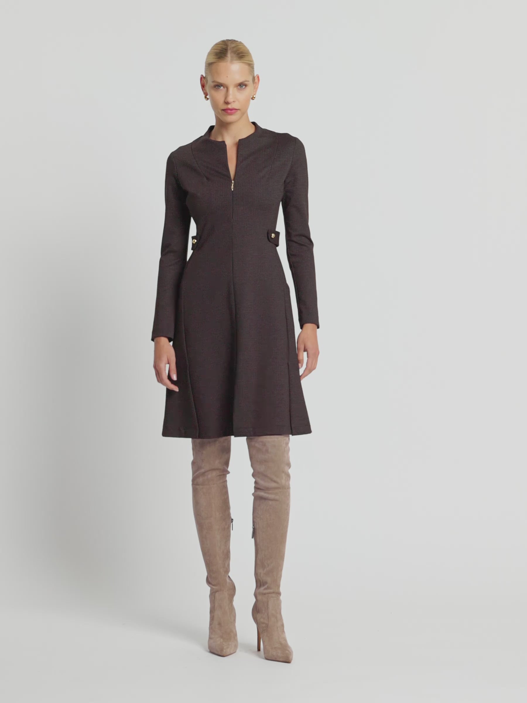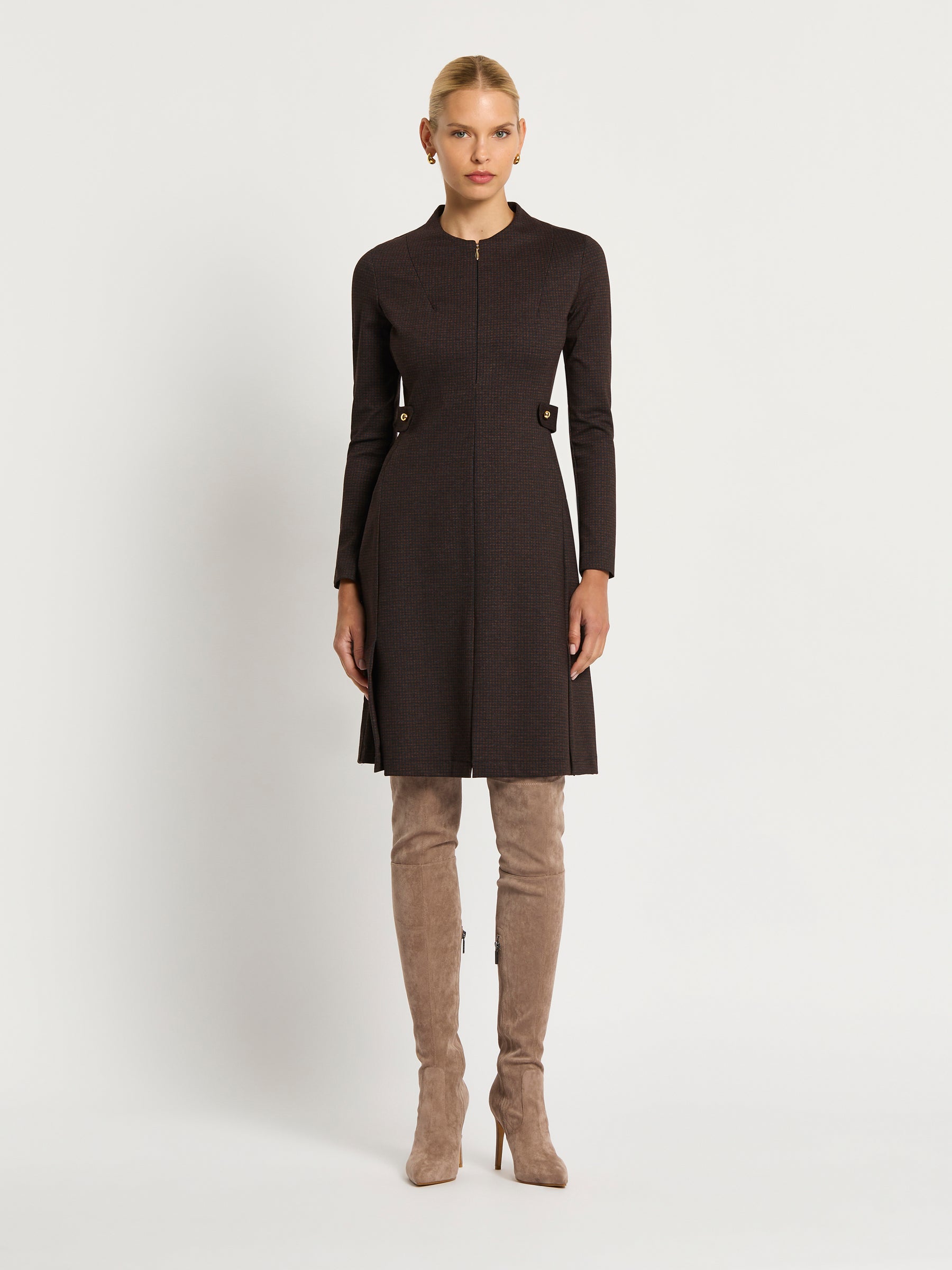 The Madison Dress has a chocolate and navy fine check printed onto a stretch Ponte, featuring a round neck with a gold concealed centre front zip and gold button detail on the waist tabs. Features a centre front split with pleats at the hem and side panel pockets, falling to an A-Line silhouette. The Madison Dress is the perfect blend of comfort and elegance for day or night.