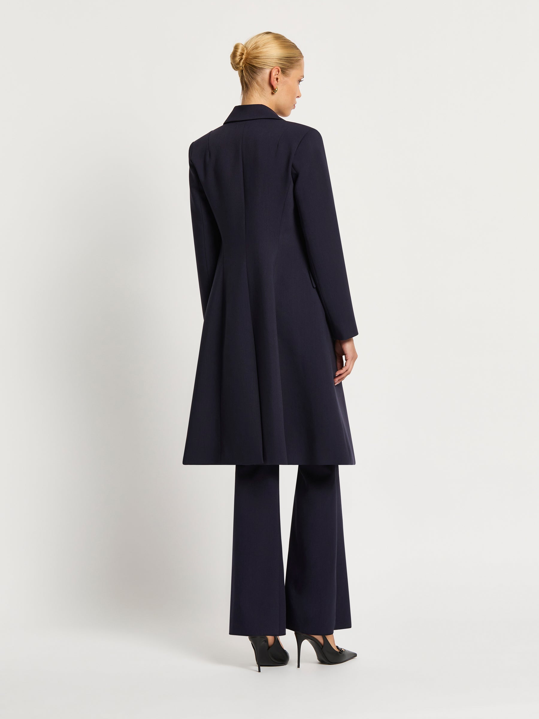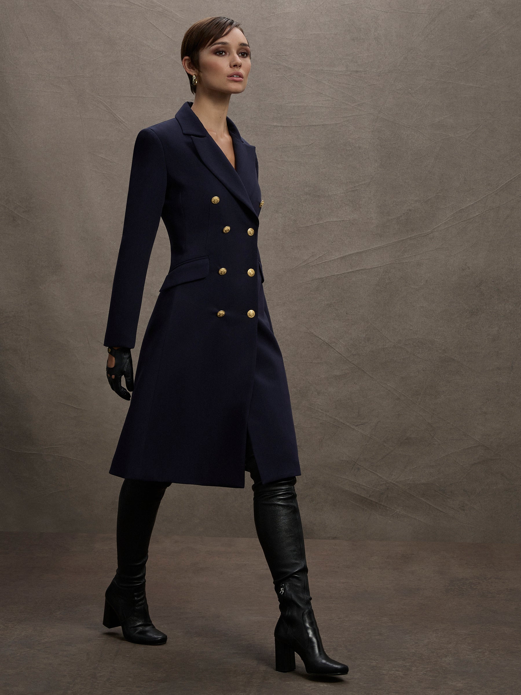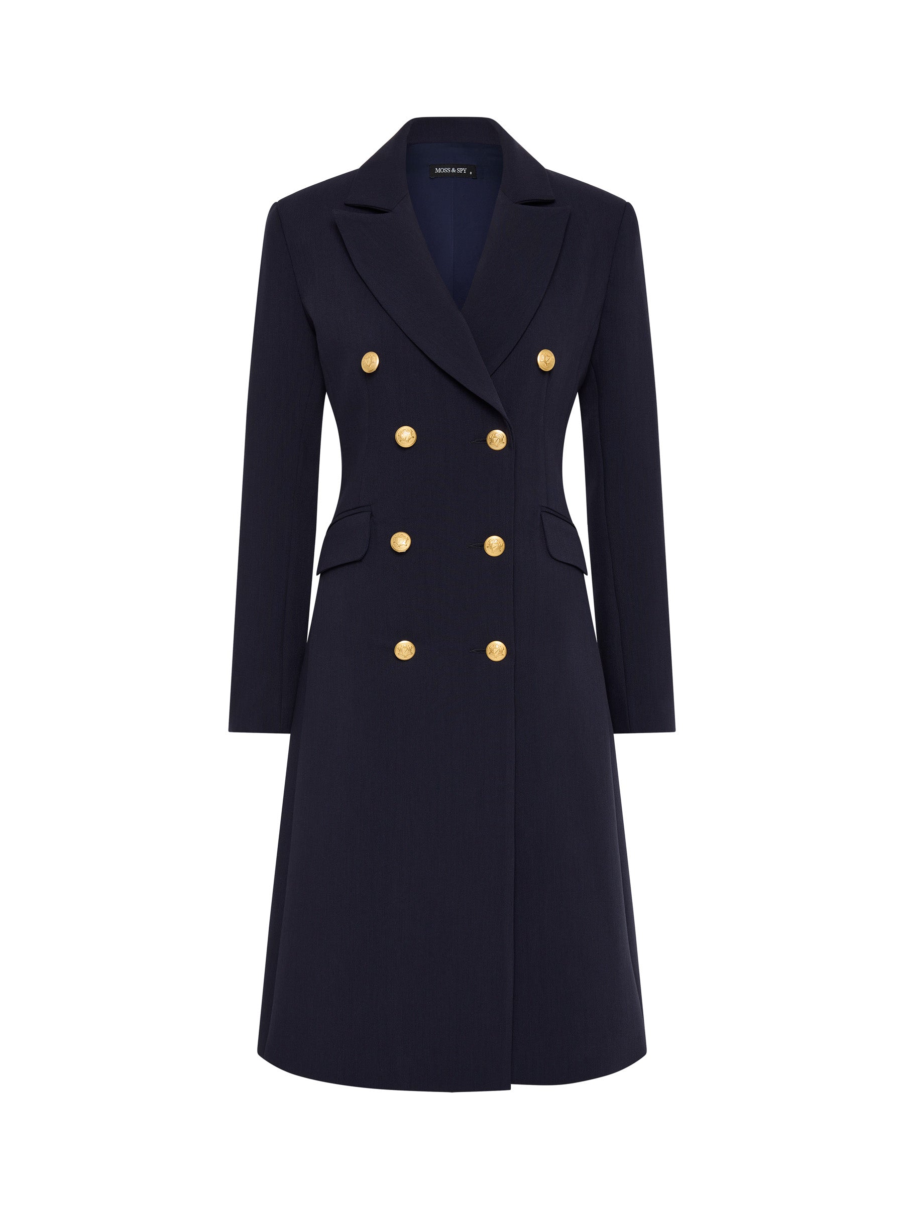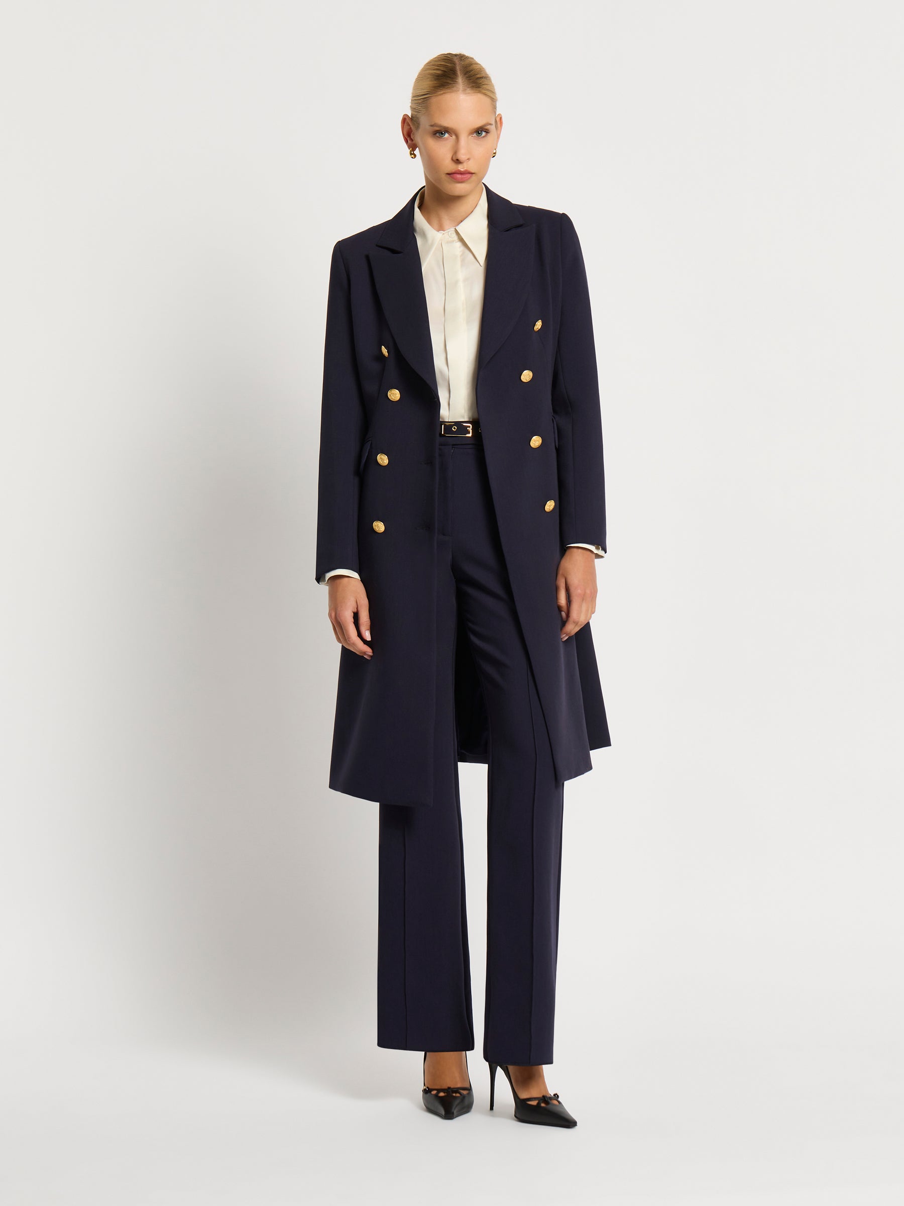 Classically tailored in rich indigo stretch-suiting and enhanced with gold crest buttons, the Morgan Double Breasted Long Jacket will make a strong, feminine statement at any event. It is fully lined in stretch satin with figure flattering panelling, shoulder pads, and jet pockets. Match it perfectly with the Morgan Pant or Morgan Skirt for a formal look. Or pair it with your favourite jeans for a striking, casual look.