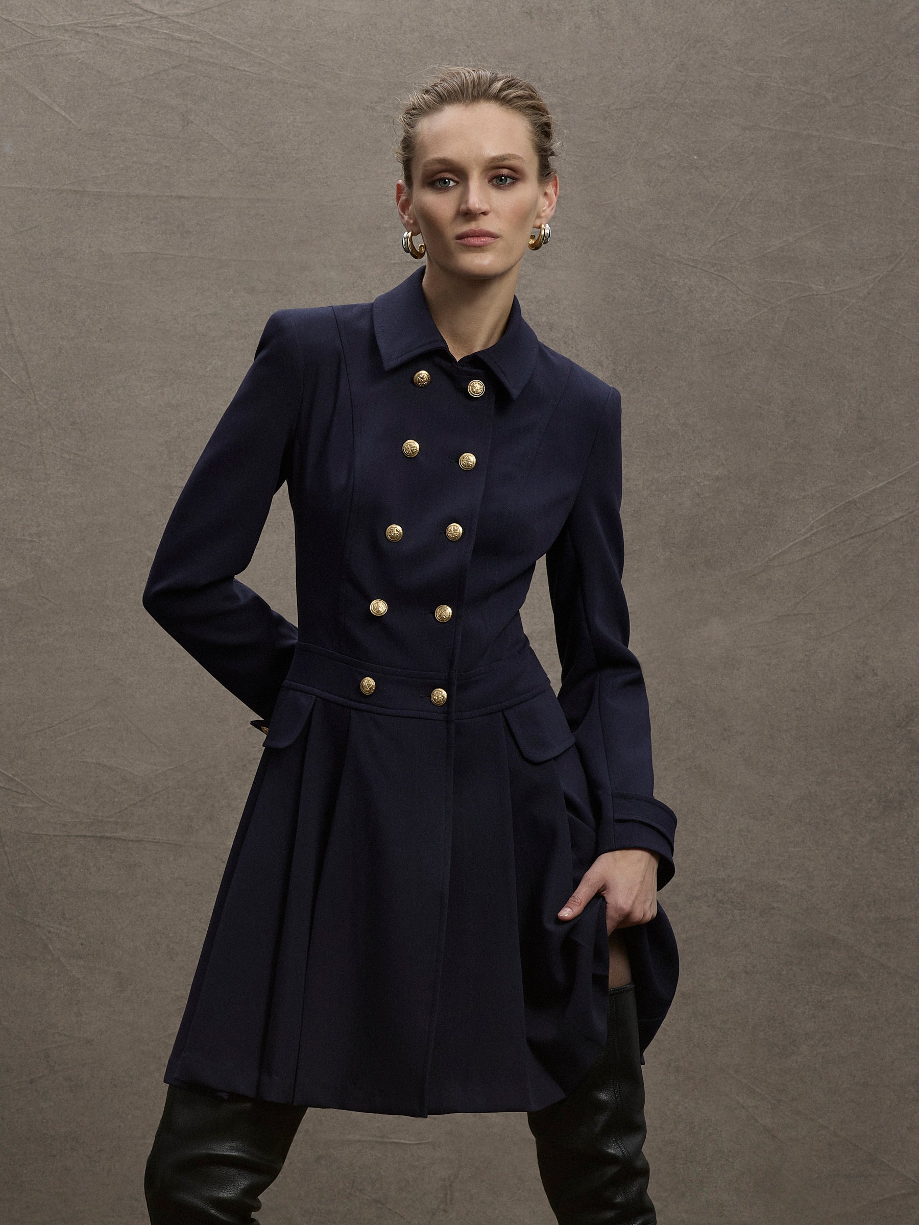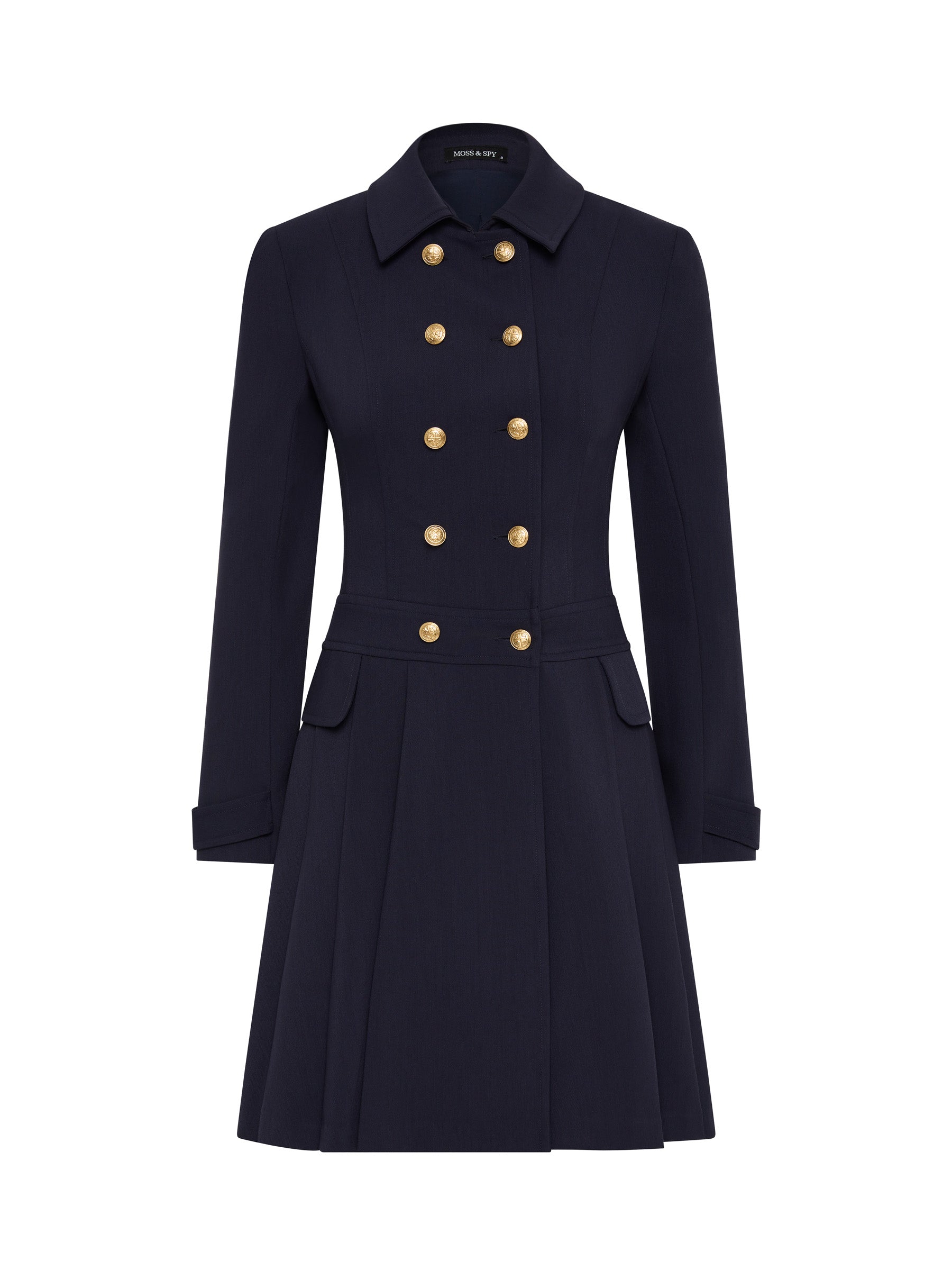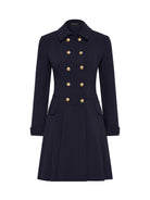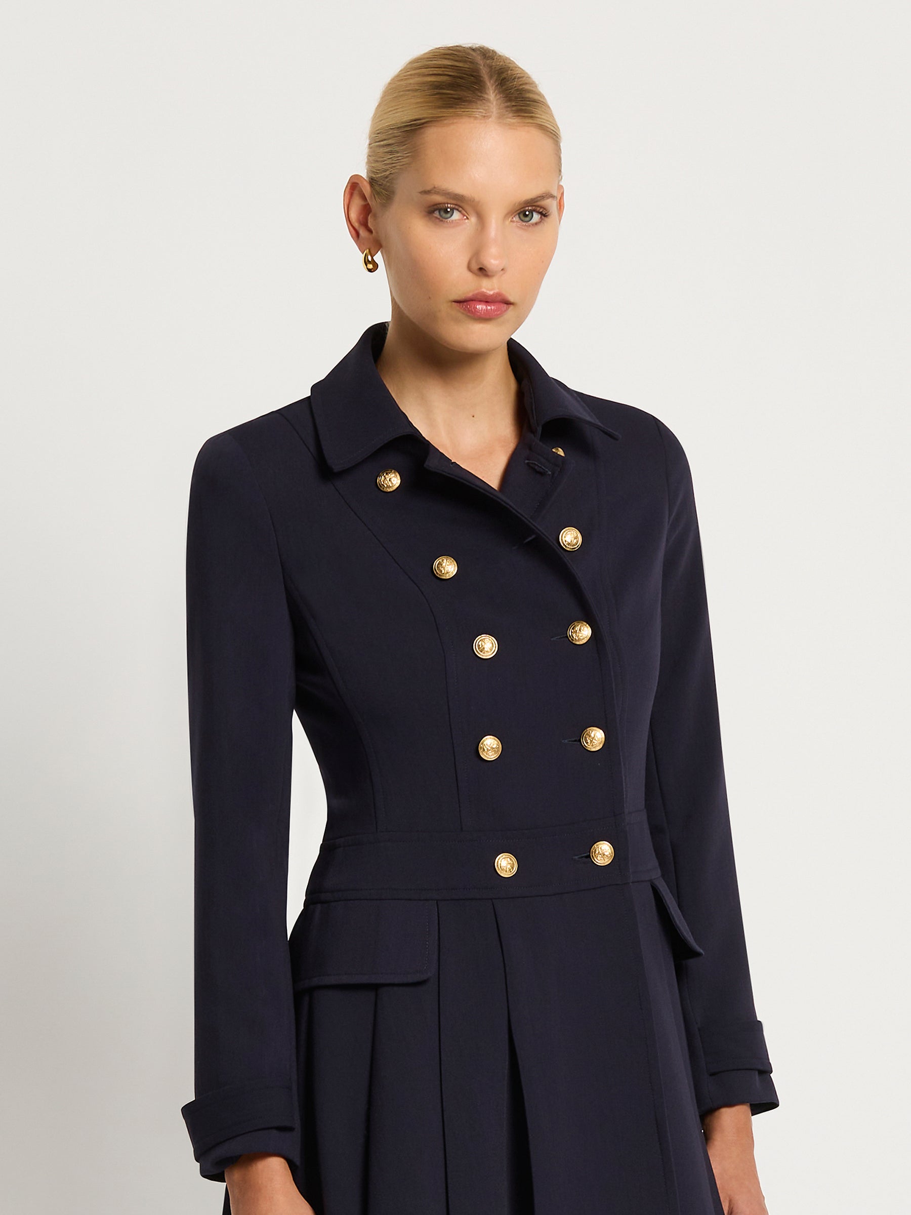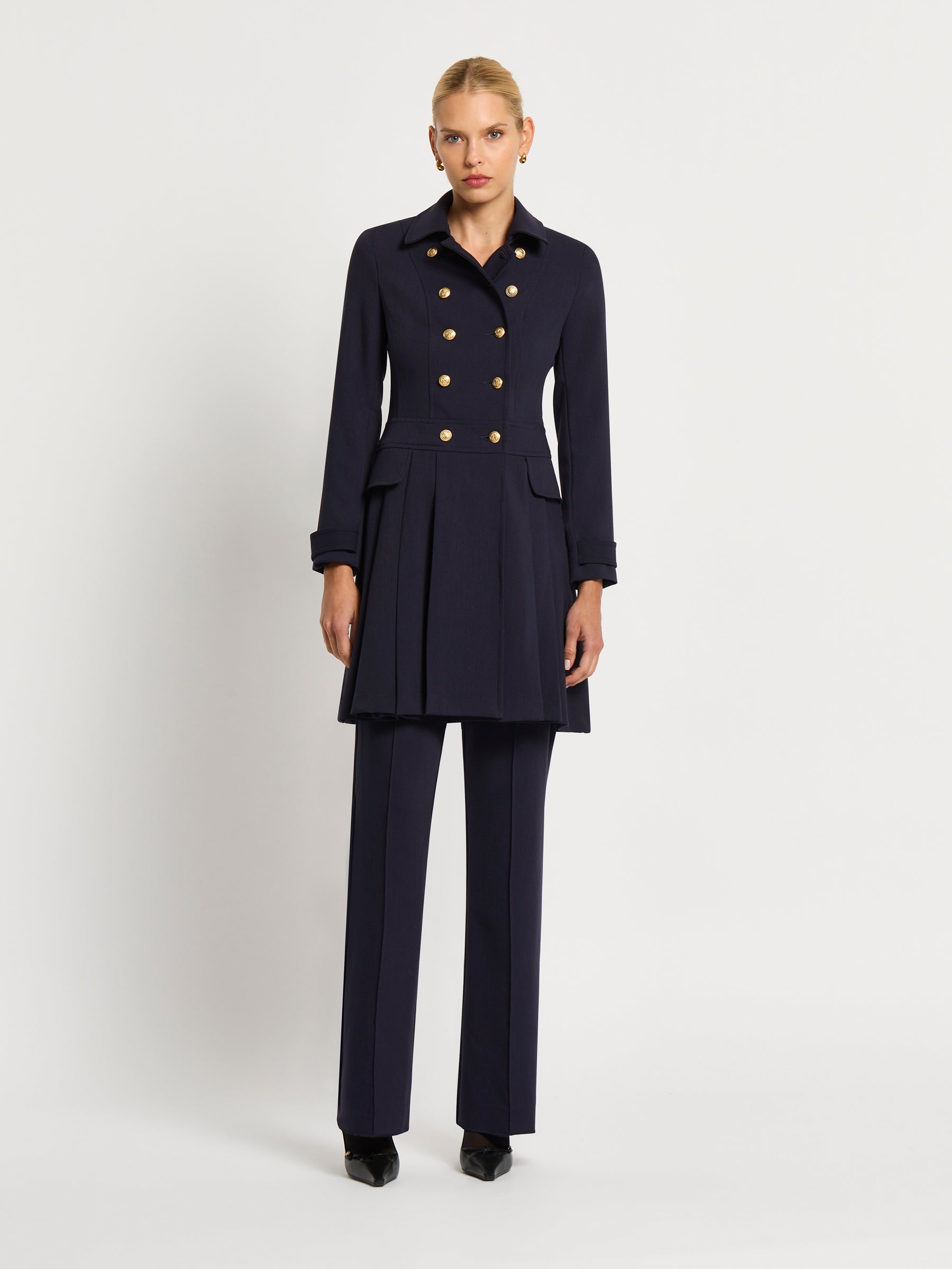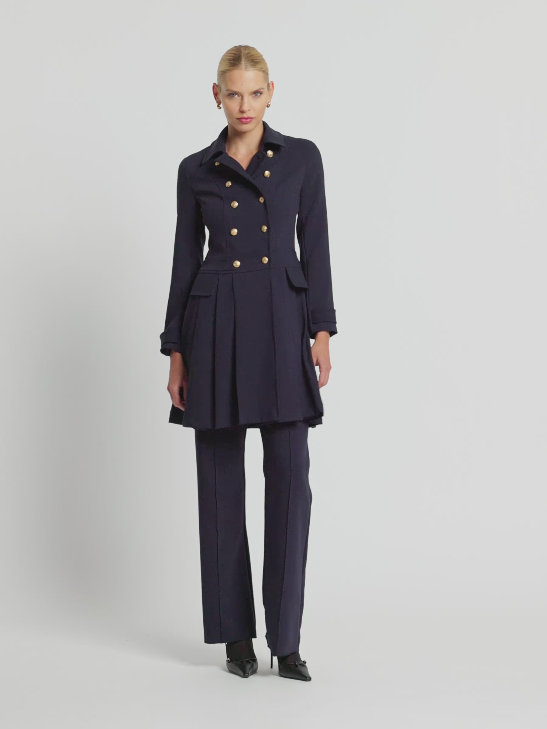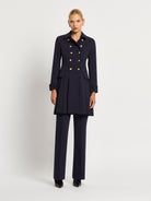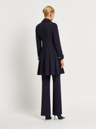 The distinctive double breasted design of the Morgan Pleated Coat Dress in rich indigo stretch suiting is enhanced by two rows of gold crest buttons, wide collar and shoulder pads giving it a stylish, slightly retro feel. The wide pleats and detailing around the waistband and cuffs add to the contemporary, feminine look. A timelessly sophisticated style that looks stunning worn with knee-high boots or paired perfectly with the Morgan Pant.