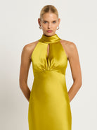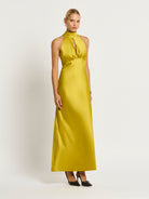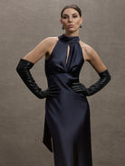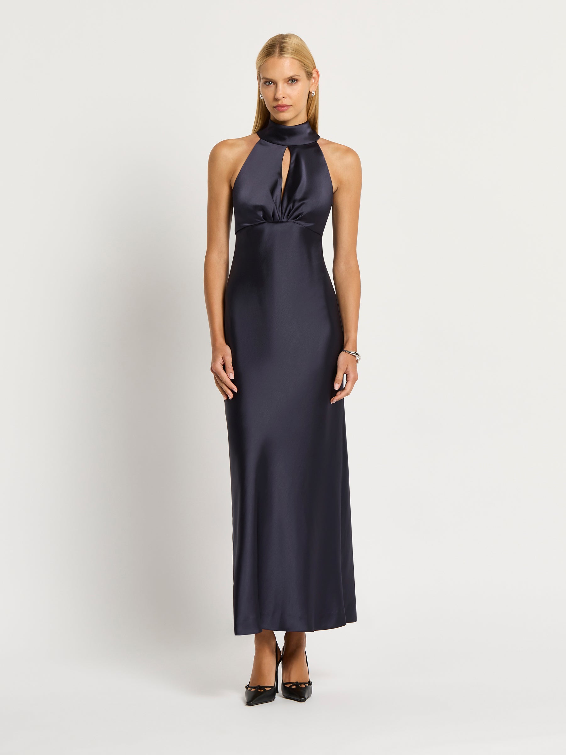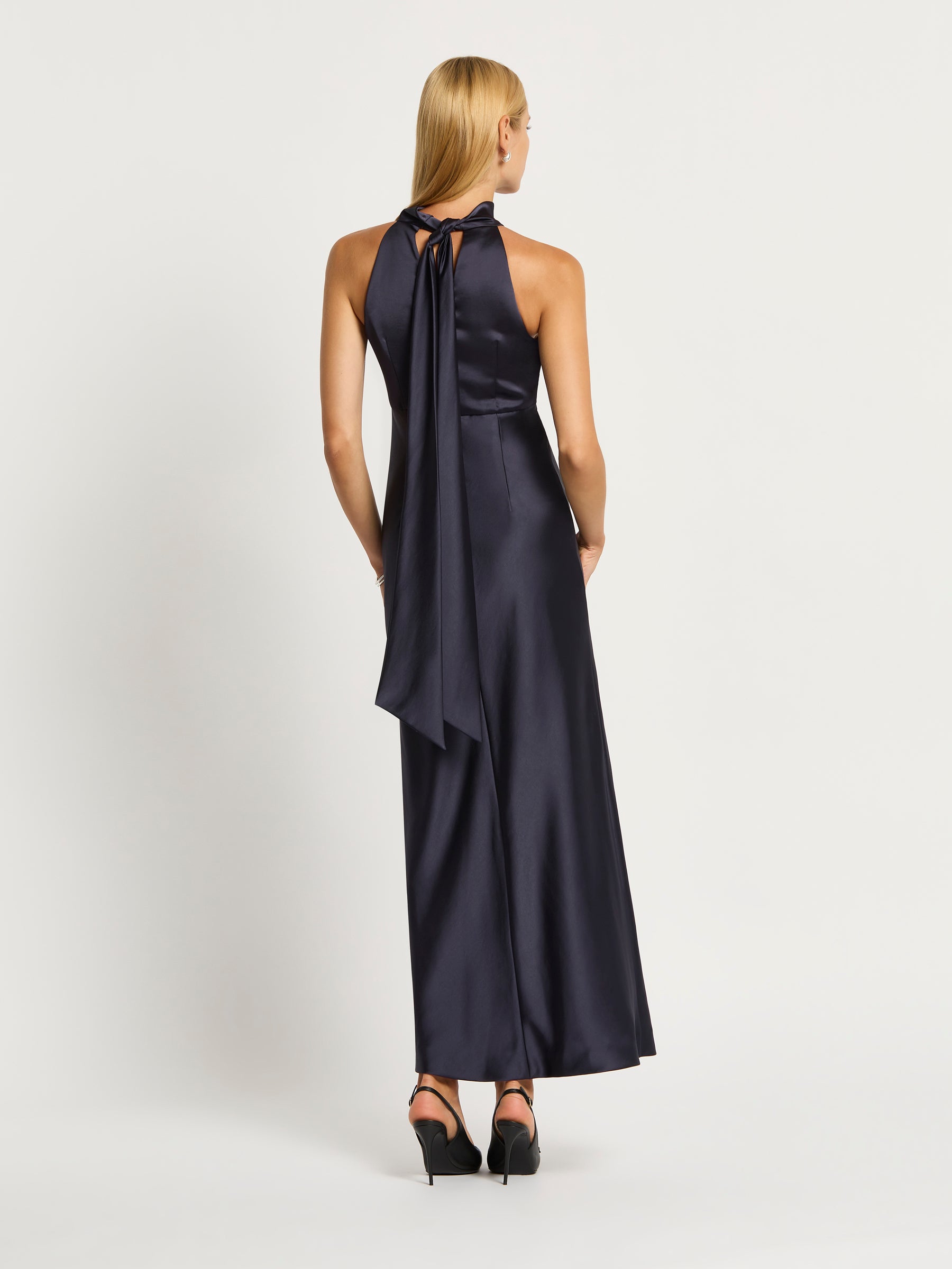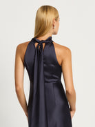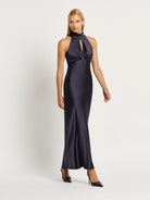 The rich midnight-navy sateen of the Nicola Gown creates a luxuriously elegant look for your next cocktail or black-tie event. Fitted through the bodice with an under bust seam and keyhole opening, the midweight sateen drapes beautifully to a full-length hem with a slight A-line silhouette. Long ties at the centre back add a unique style that makes this a stand-out gown that can be paired with designer shoes, gloves or other accessories.