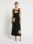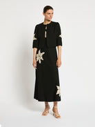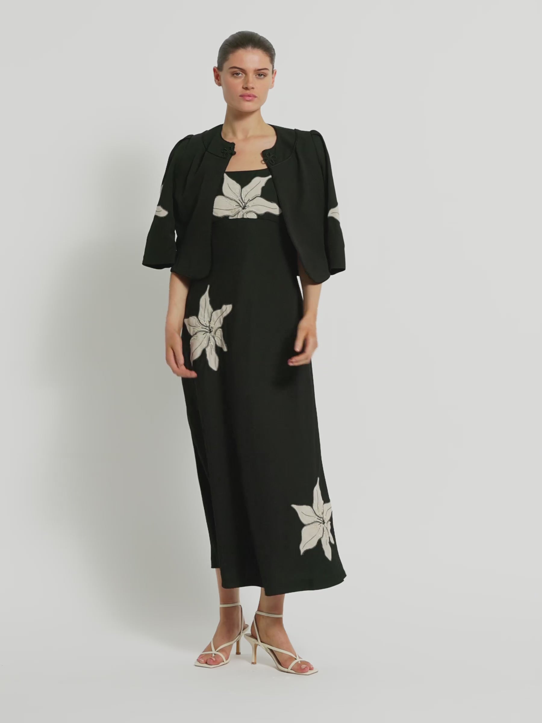 Elegant and versatile with a classic silhouette, the Nikita Midi is designed to effortlessly transition from daytime occasions to evening events. Featuring cream toned floral embroidered appliqué and delicate beaded motifs on black linen viscose, it has a squared neckline and an under bust seam falling to a slight A-line silhouette. The Nikita Midi is cut on the bias to allow for a slight flare, fully lined in a stretch satin and features a centre back invisible zipper, for a refined, feminine finish.