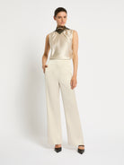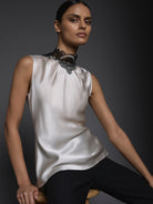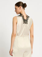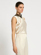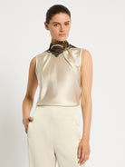 Crafted from a luxurious 100% silk satin for a lightweight and refined feel, the Nina Top is a timeless wardrobe staple. Cut in a flattering bias cut silhouette falling to a relaxed fit, features a scallop lace high neckline and back V-neckline with button and loop closures at centre back. The Nina Top effortlessly transitions from day to evening, pair with tailored pants for a sophisticated look.