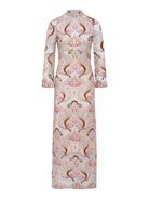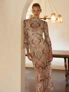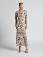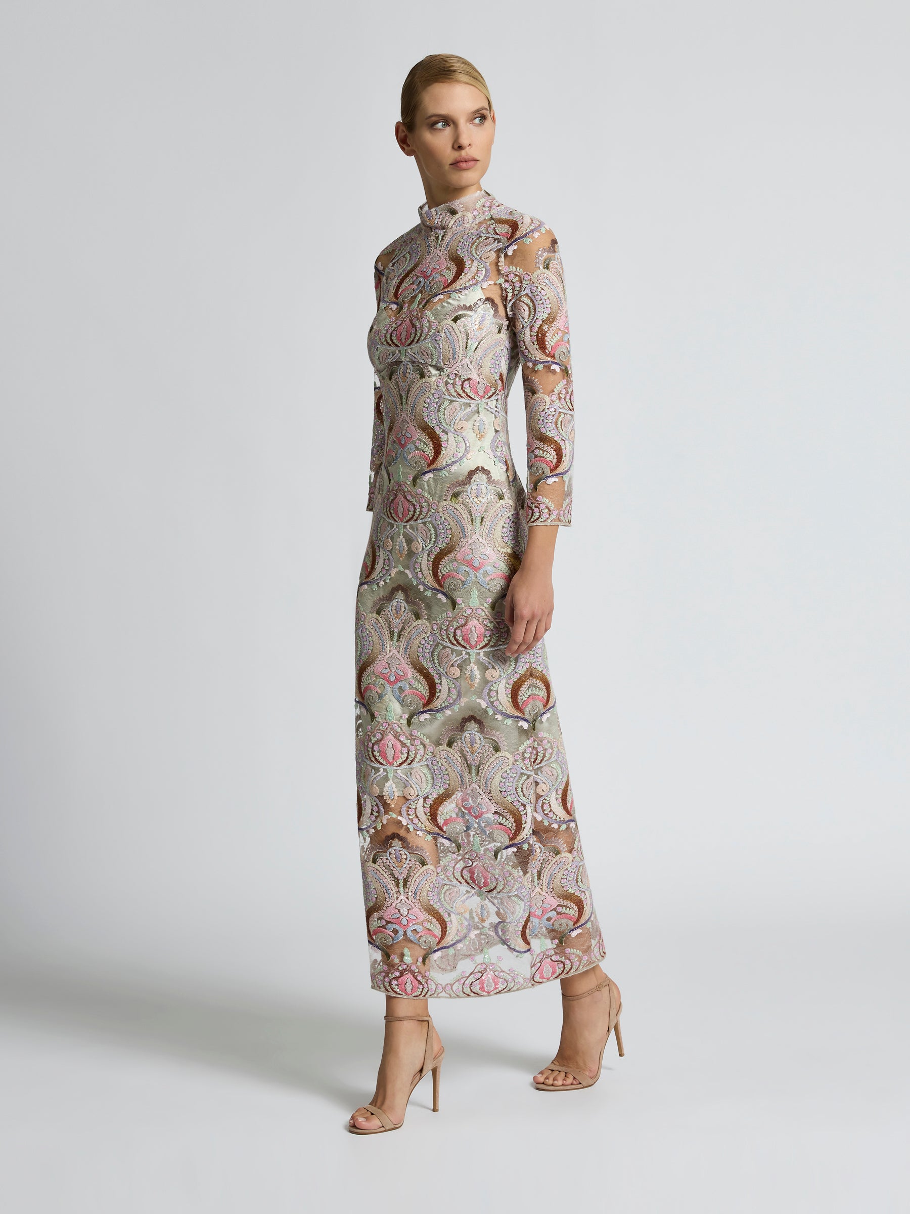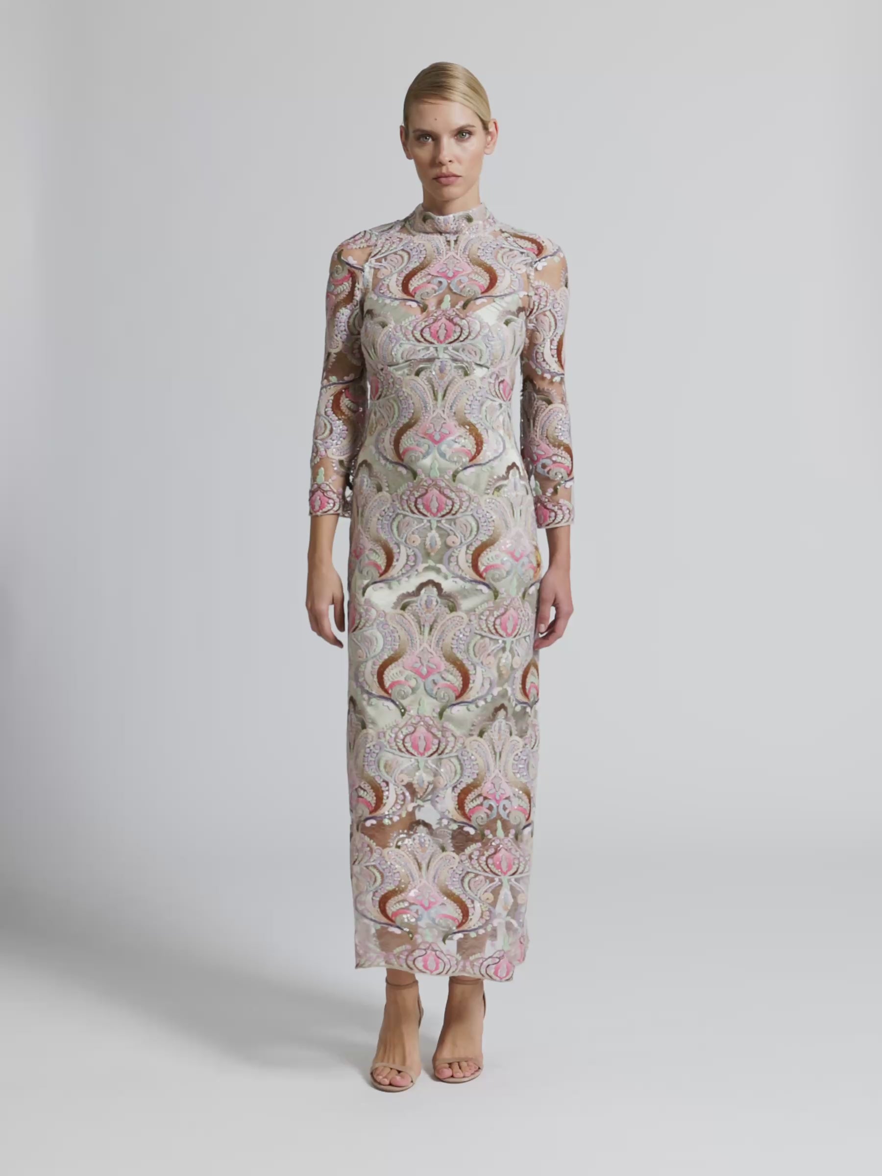 Elegantly sophisticated, this intricately embroidered classic shift features pastel tones of pink, lavender, gold and sage green in a baroque inspired design, embellished with clear sequins on a sheer mesh overlay. Fitted through the body with a high neckline and three-quarter length sleeves; the lightweight mesh offers subtle transparency to the sage green satin slip and open contrast at the neckline and sleeves. The Paloma Midi will leave a lasting impression at your next formal event. Comes with a soft sage green satin slip.