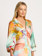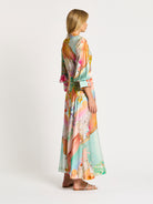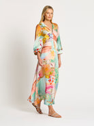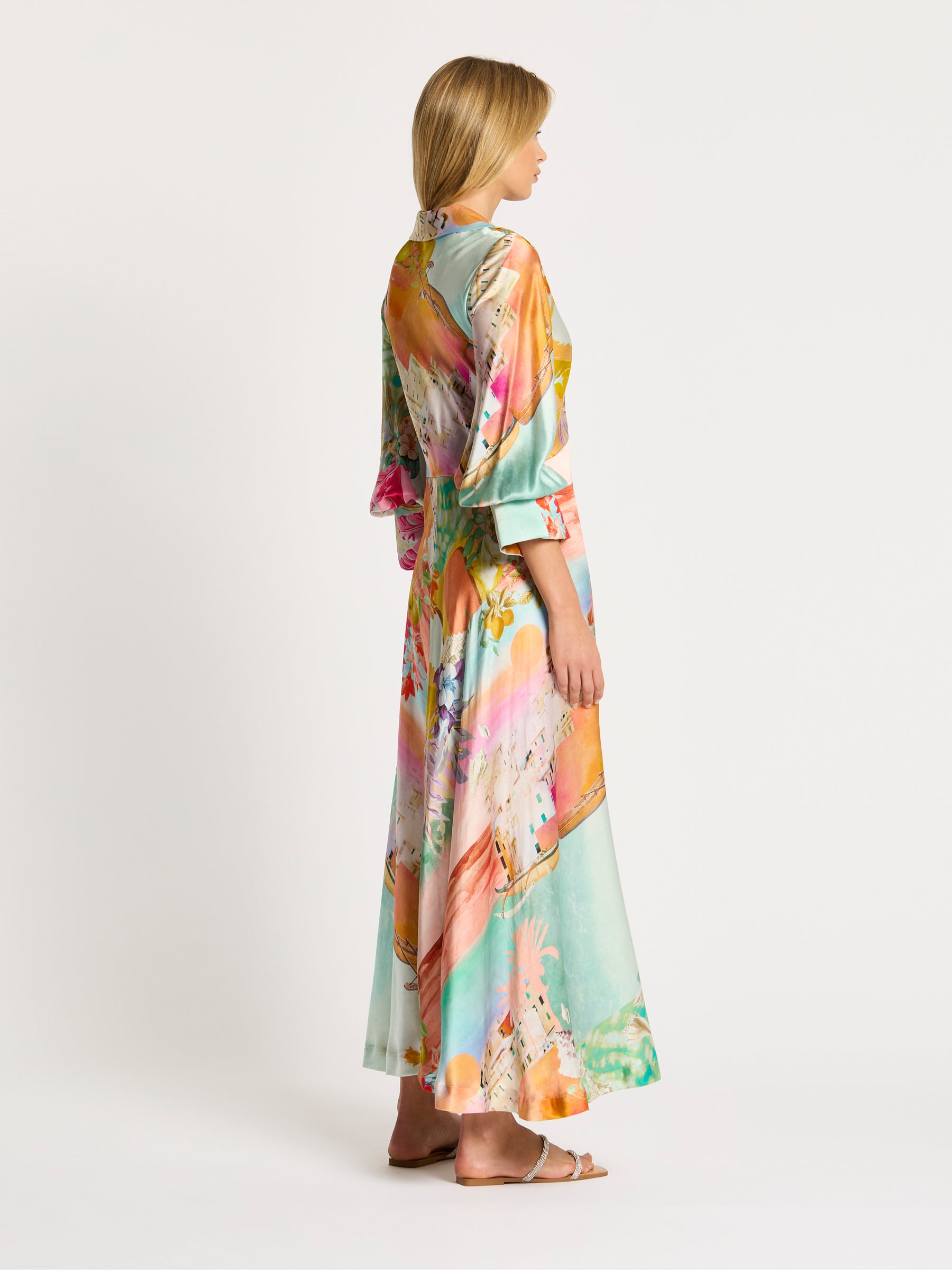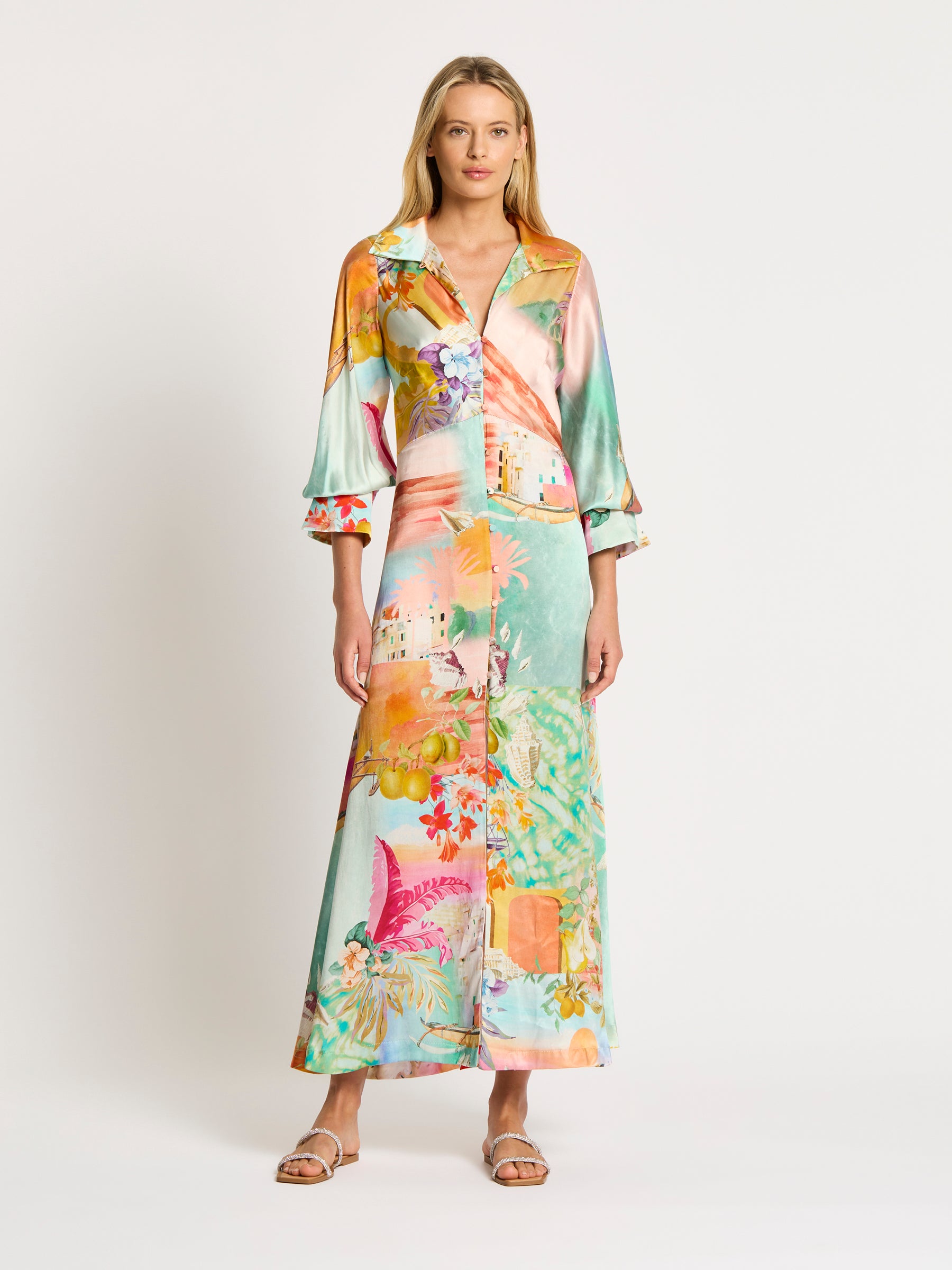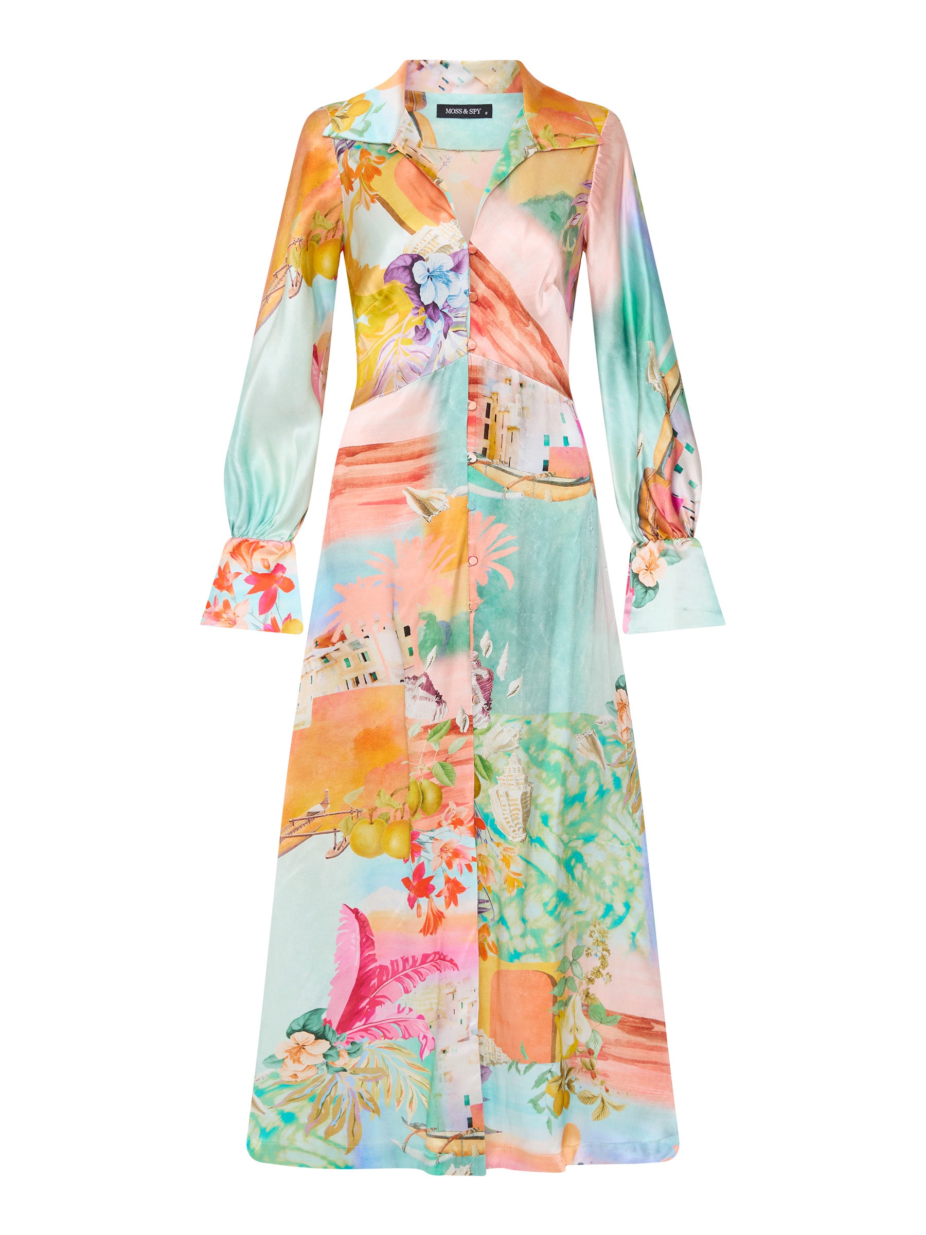 Enjoy the look and feel of a European summer in the exclusive silk blend coastal print of the Paradise Shirt Dress. With a gently fitted under-bust and waist and a bias-cut A-line hem finishing maxi length, the button front opens to a split just above the knee. It also features a shirt collar with the option to be worn as a V-neck or closed at the shirt collar with a key-hole opening. A truly versatile summer dress, it can be worn day to night, and looks perfect with heels or flats.