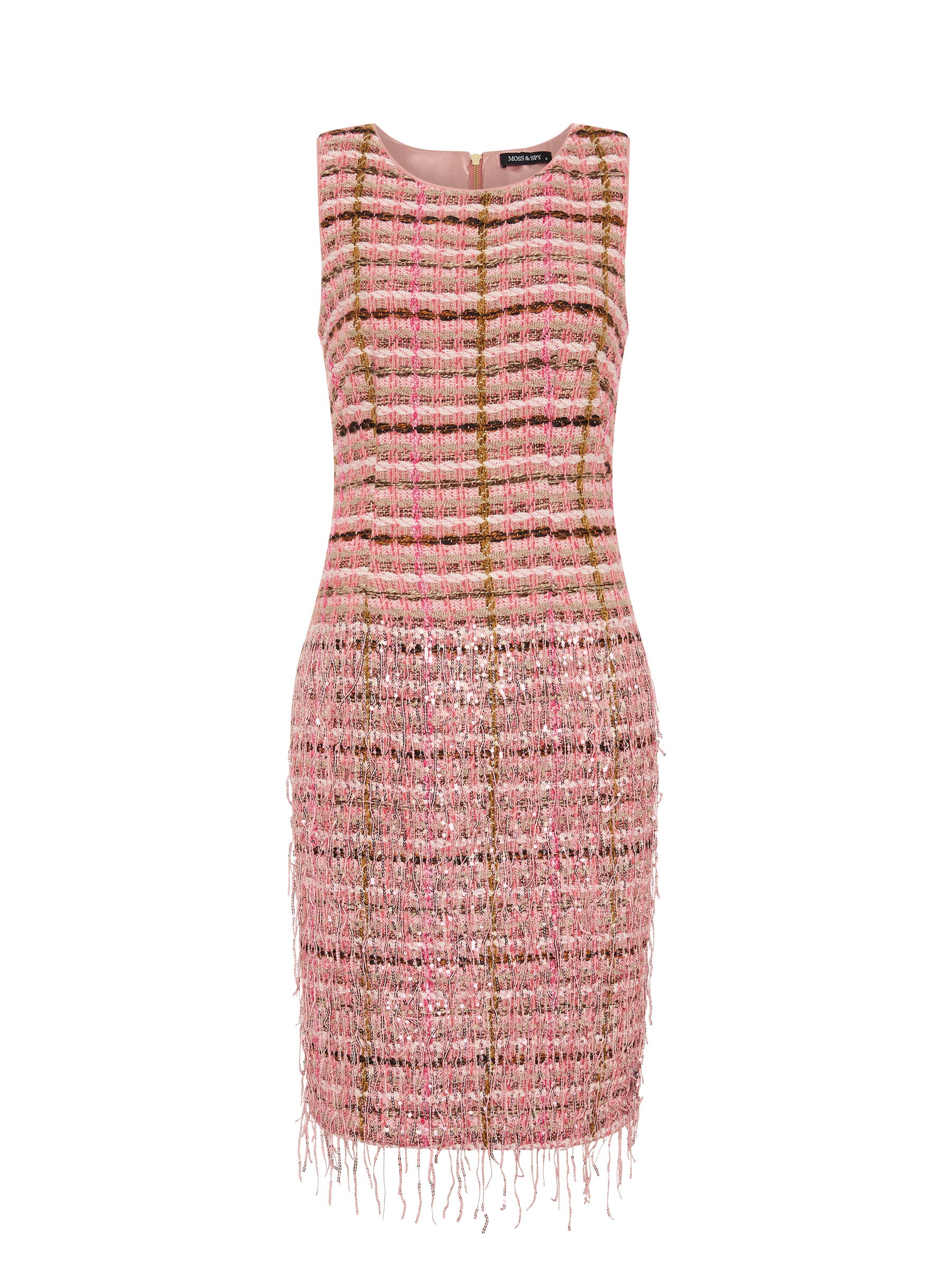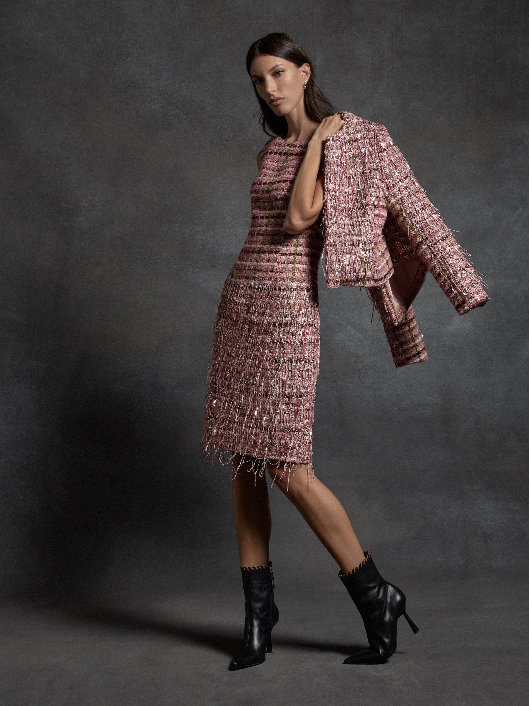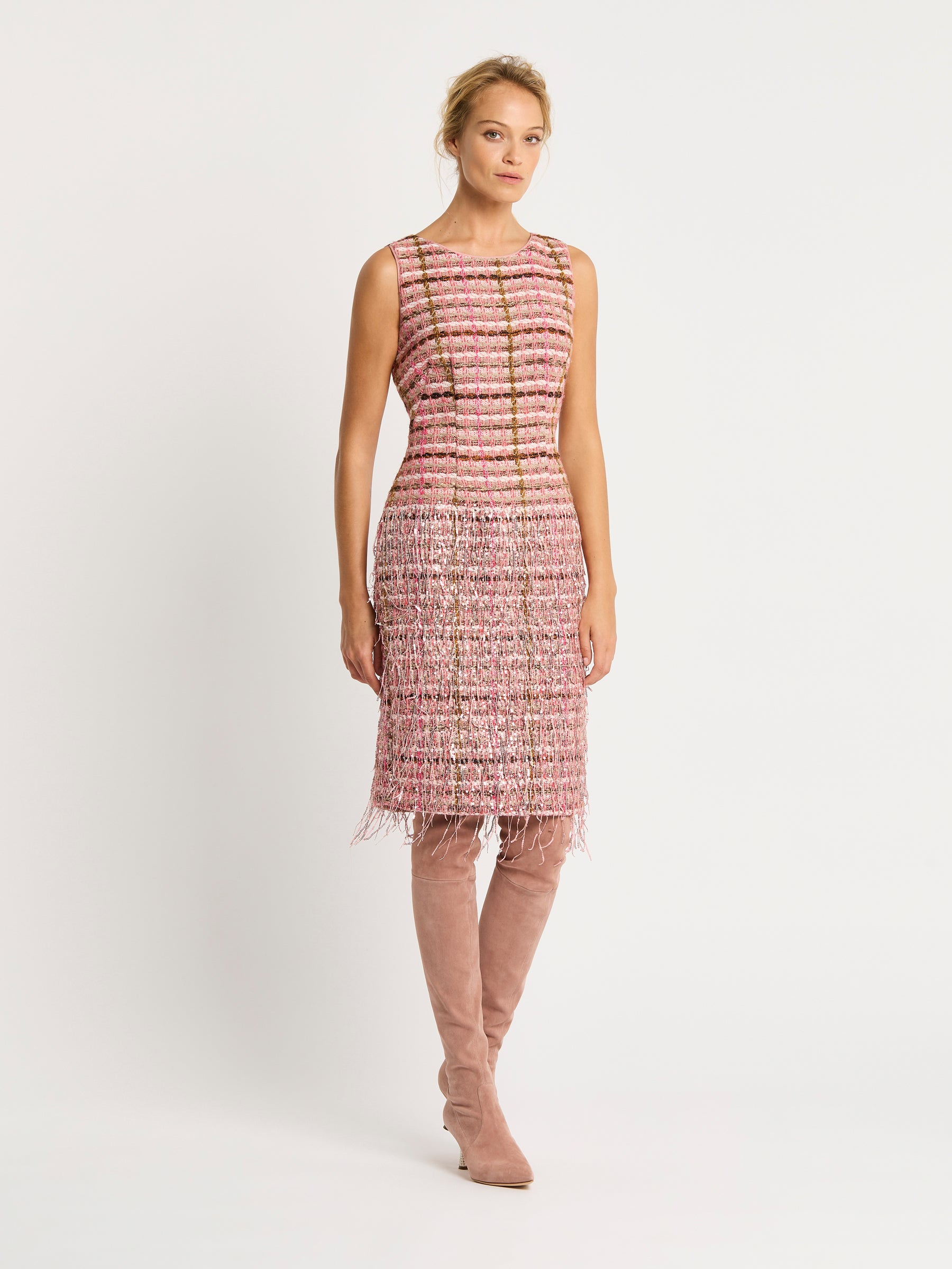 Crafted from a beautifully textured tweed in camel and pink check tones, the Paris Shift has a classic round neck and is elaborately decorated with sequined fringing through the skirt area woven into the tweed. Trimmed with matching piping around the neck and armholes, this perfectly tailored shift evokes Parisian style and glamour. Wear on its own or team with the Paris Jacket for any cocktail or evening event.