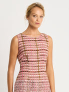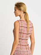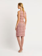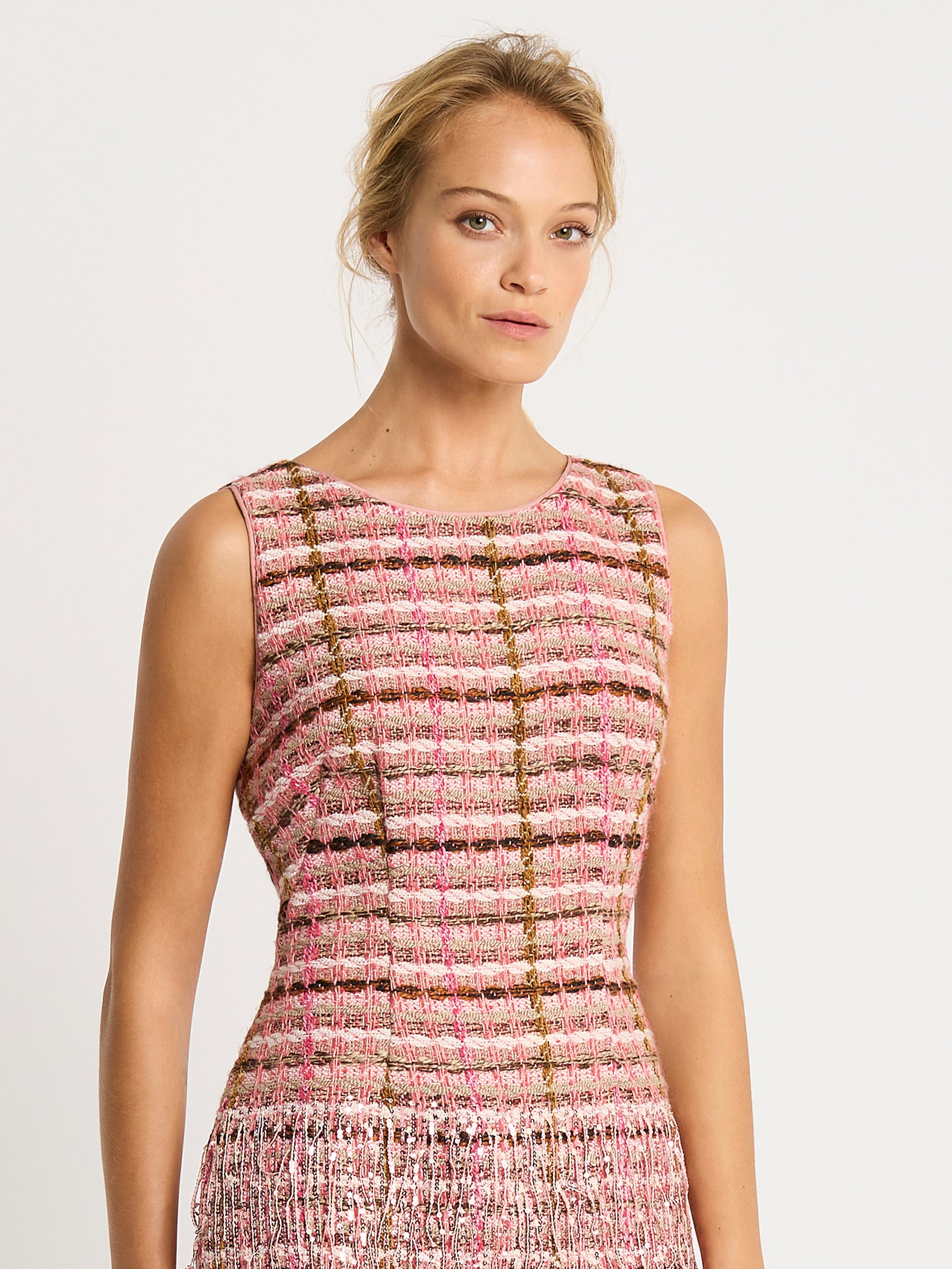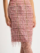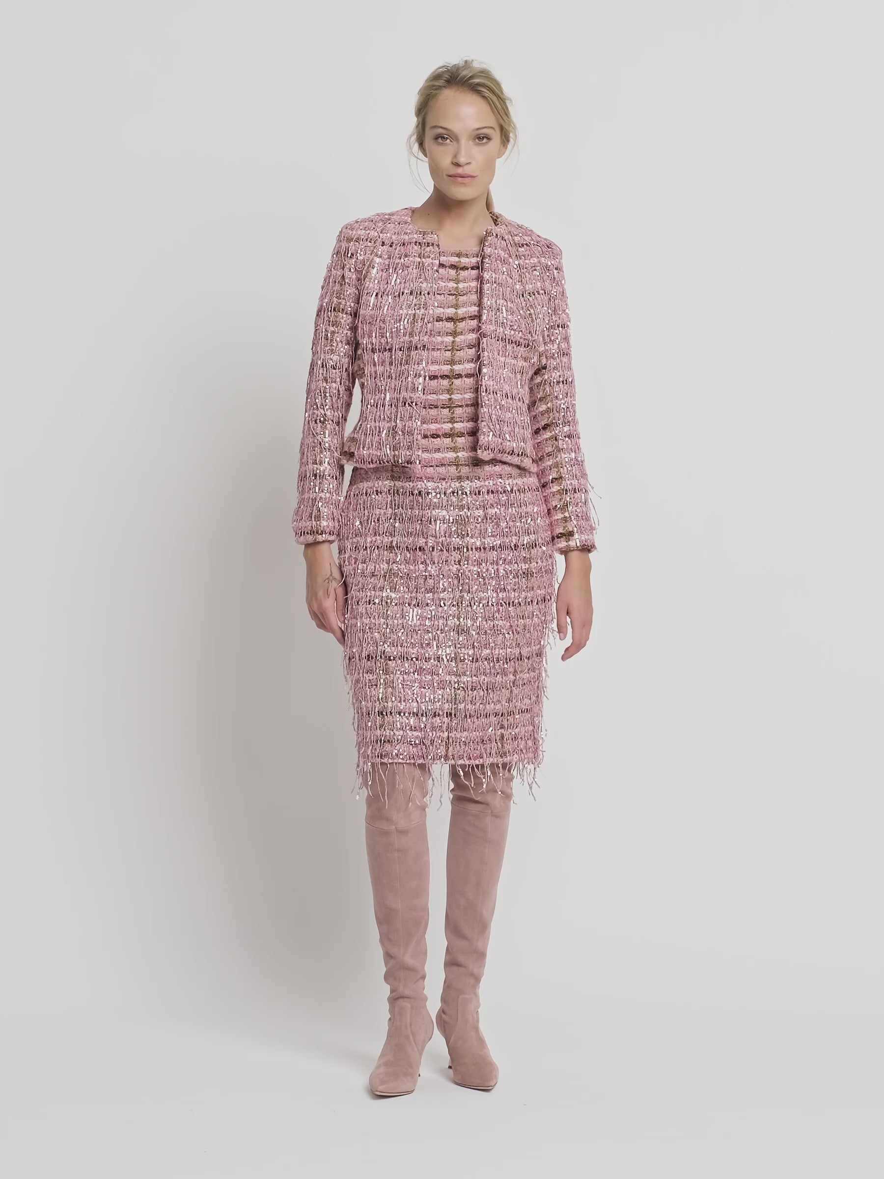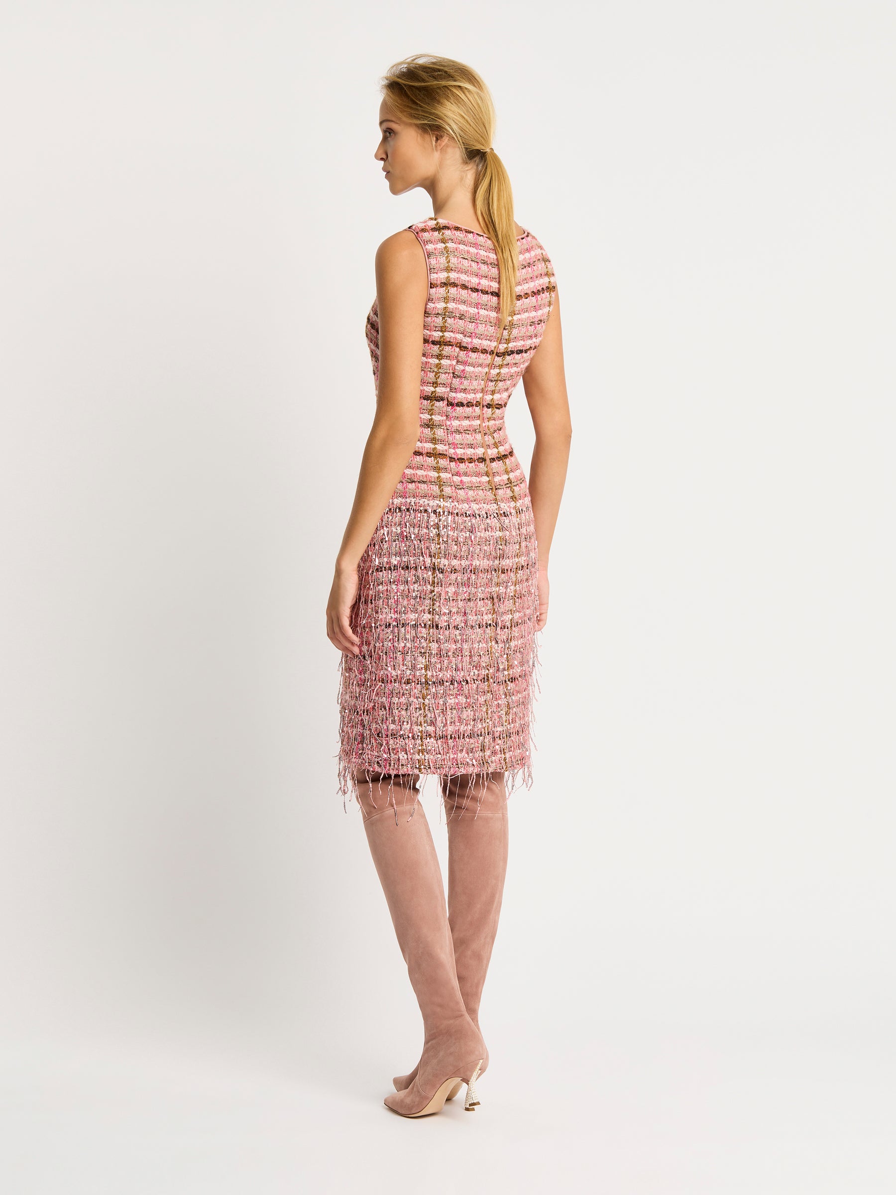 Crafted from a beautifully textured tweed in camel and pink check tones, the Paris Shift has a classic round neck and is elaborately decorated with sequined fringing through the skirt area woven into the tweed. Trimmed with matching piping around the neck and armholes, this perfectly tailored shift evokes Parisian style and glamour. Wear on its own or team with the Paris Jacket for any cocktail or evening event.