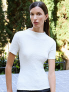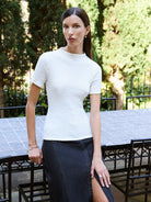 The Pippa Top is a made from a shirred knit fabrication that stretches onto the body for a figure flattering silhouette. This easy to wear, pull on T top is the perfect wardrobe essential for all year round.