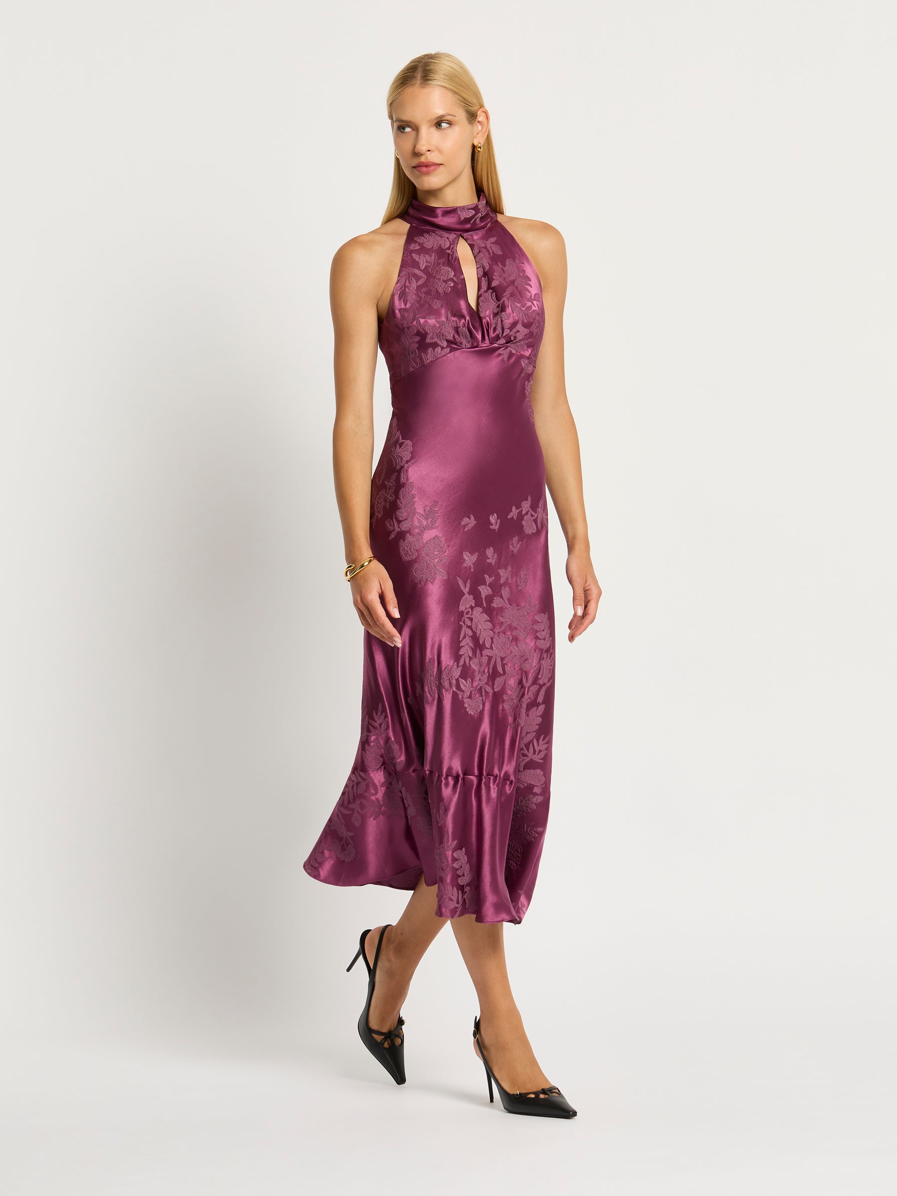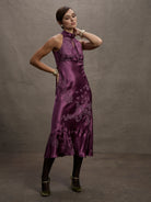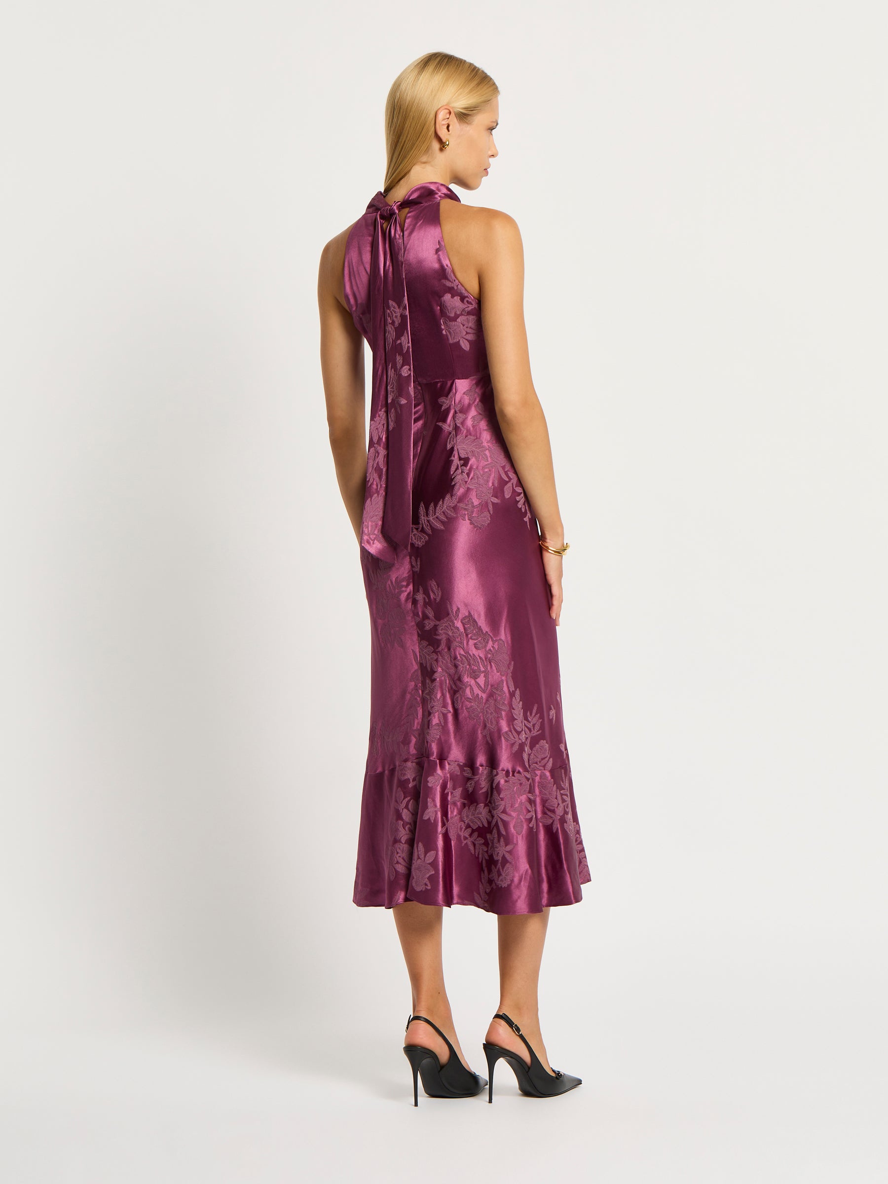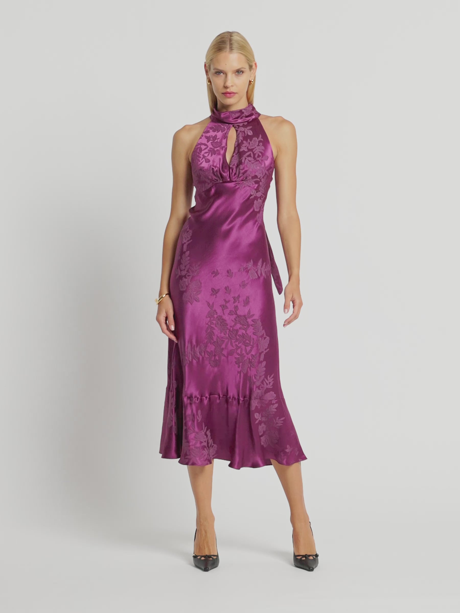 The subtle, yet striking floral motifs of the Primrose Sleeveless in a silk blend jacquard will leave a lasting impression at your next cocktail party or special event. Choose from either rich plum or royal blue to add to your trans-seasonal wardrobe. Fitted through the bodice with a cut away armhole, under bust seam and keyhole opening it secures with adjustable ties at centre back and falls to an A-line flounce hem, finishing at mid-calf.