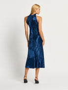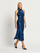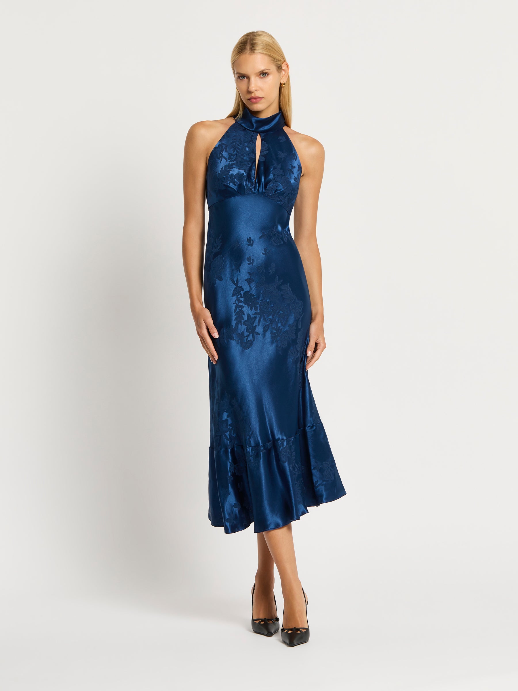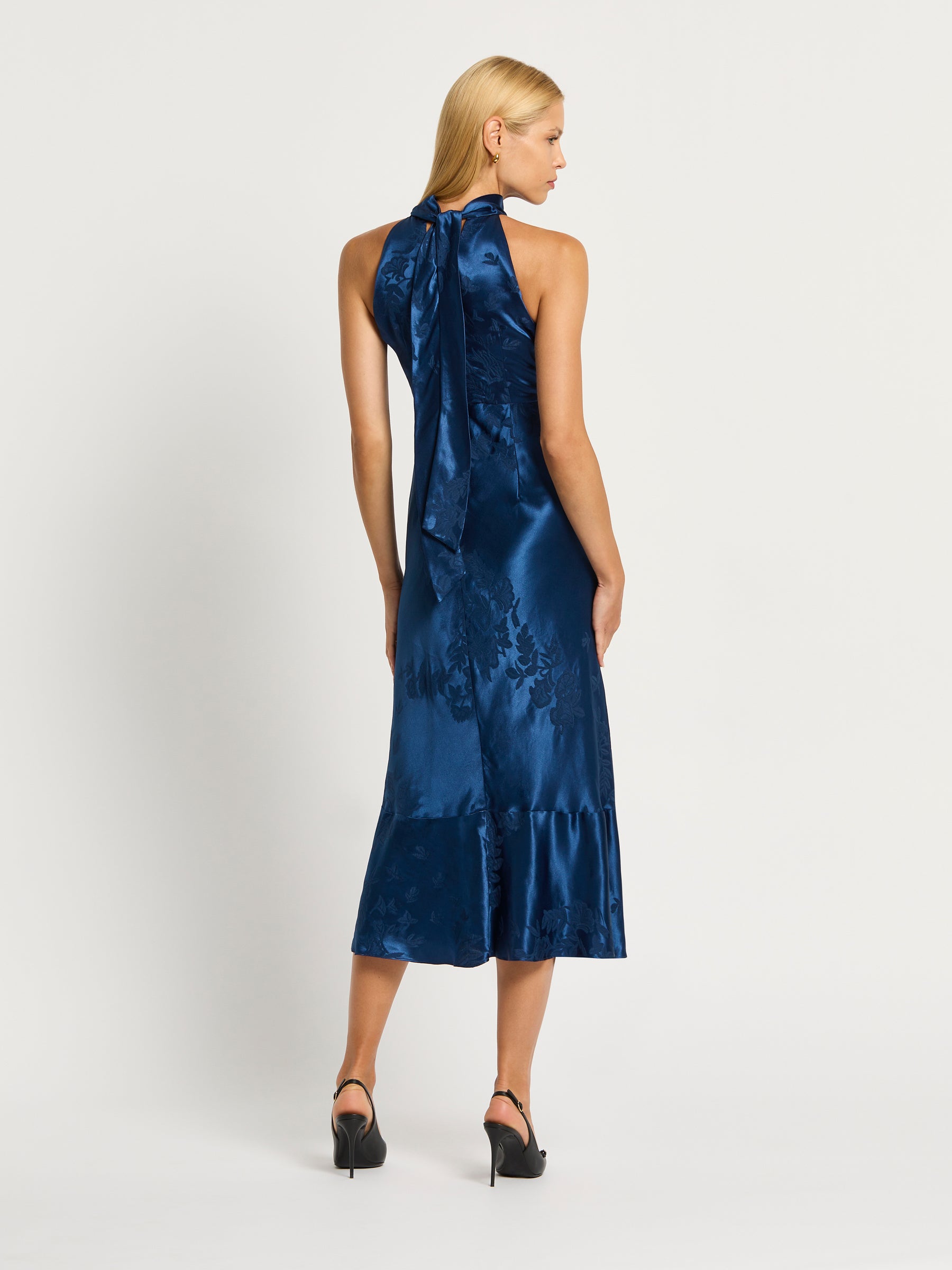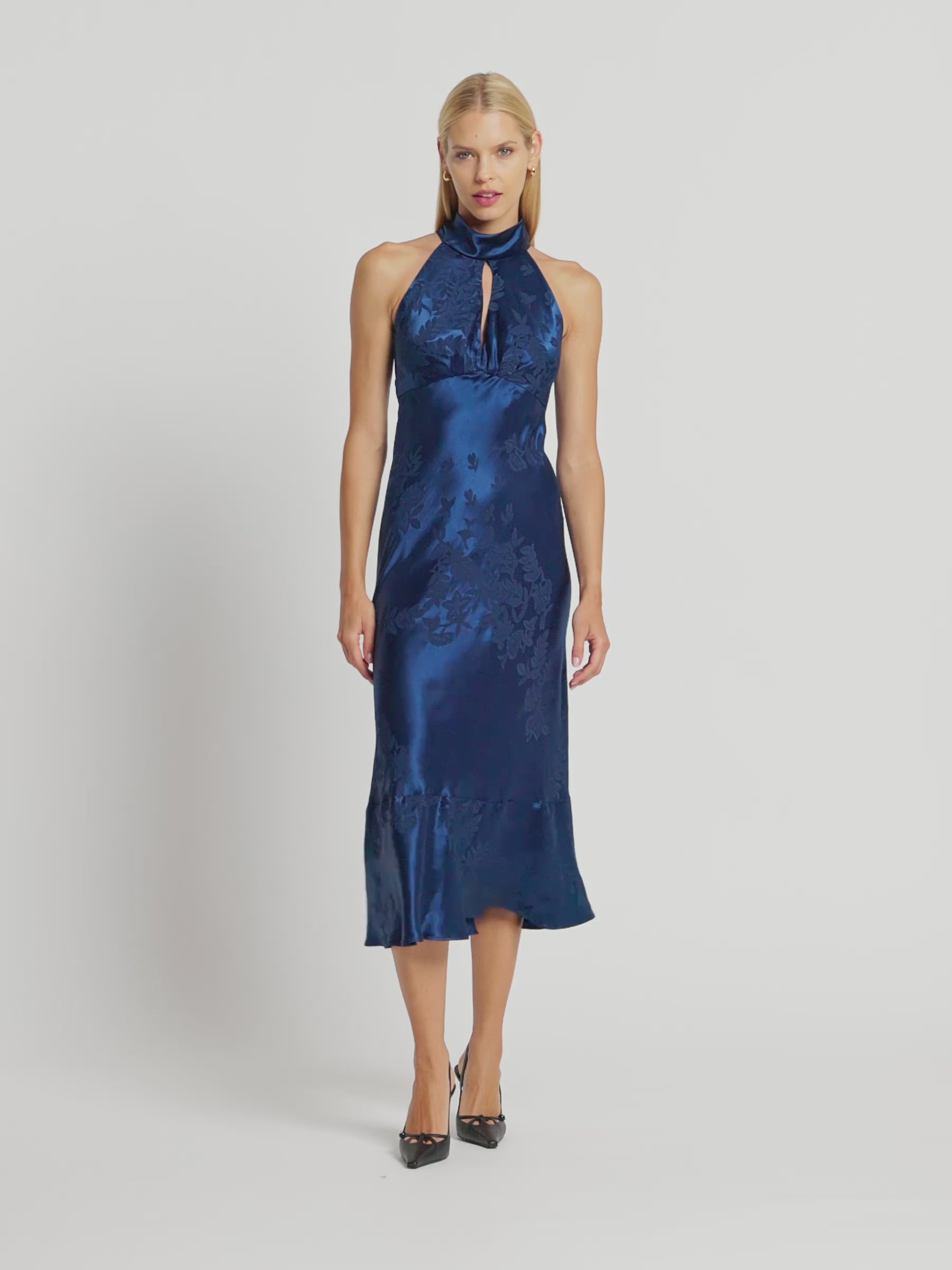 The subtle, yet striking floral motifs of the Primrose Sleeveless in a silk blend jacquard will leave a lasting impression at your next cocktail party or special event. Choose from either rich plum or royal blue to add to your trans-seasonal wardrobe. Fitted through the bodice with a cut away armhole, under bust seam and keyhole opening it secures with adjustable ties at centre back and falls to an A-line flounce hem, finishing at mid-calf.