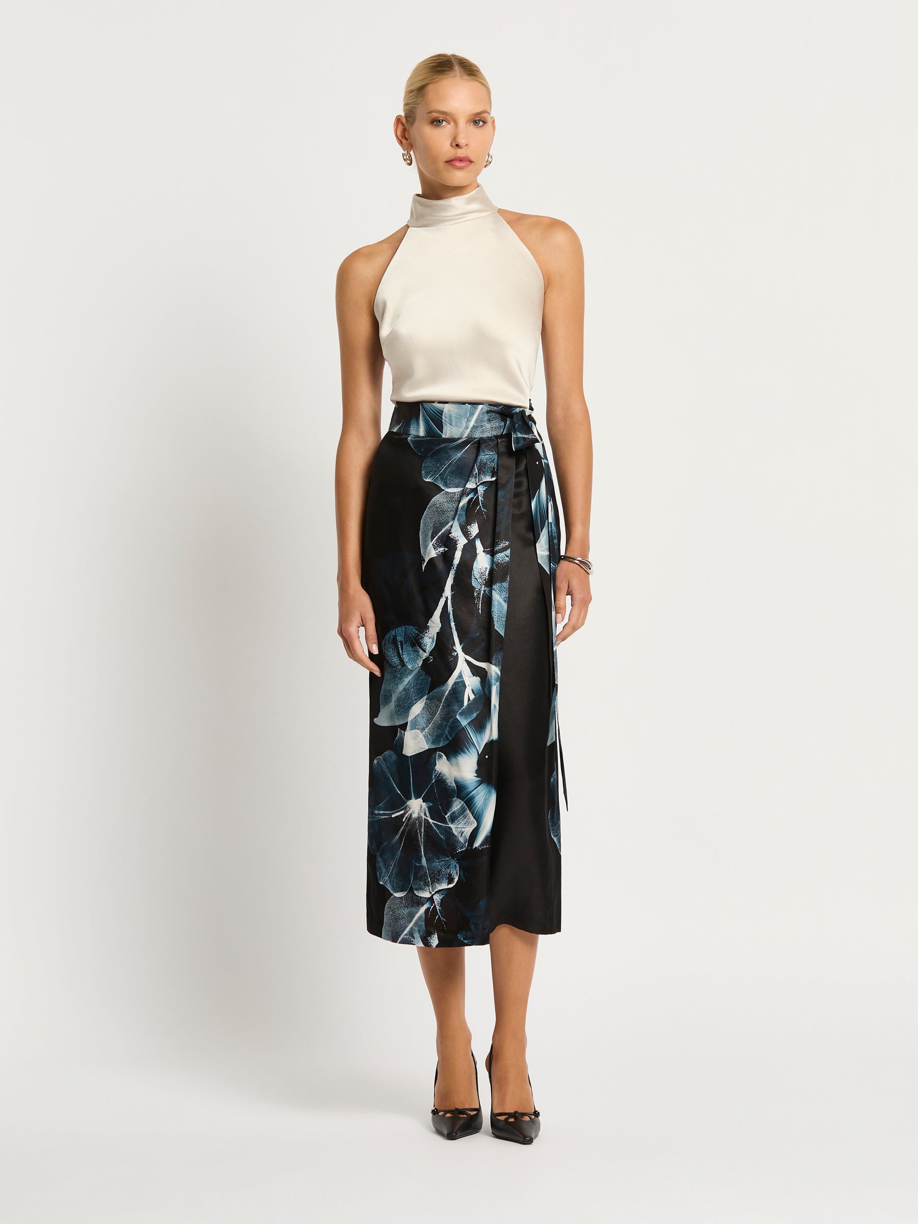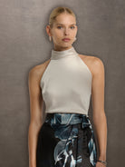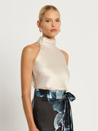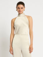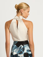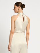 The Rachel Top is crafted from a matt crepe sateen, allowing drape whilst being tailored. Featuring a flattering cut away shoulder design with a cut out V-back neckline. The sleeveless design features a high neckline with button and loop fastenings at centre back. Cut on the bias, the Rachel Top is a flattering and elegant style for your next daytime or cocktail events, pair with the Rachel Pant for a complete look.