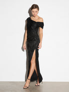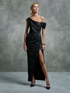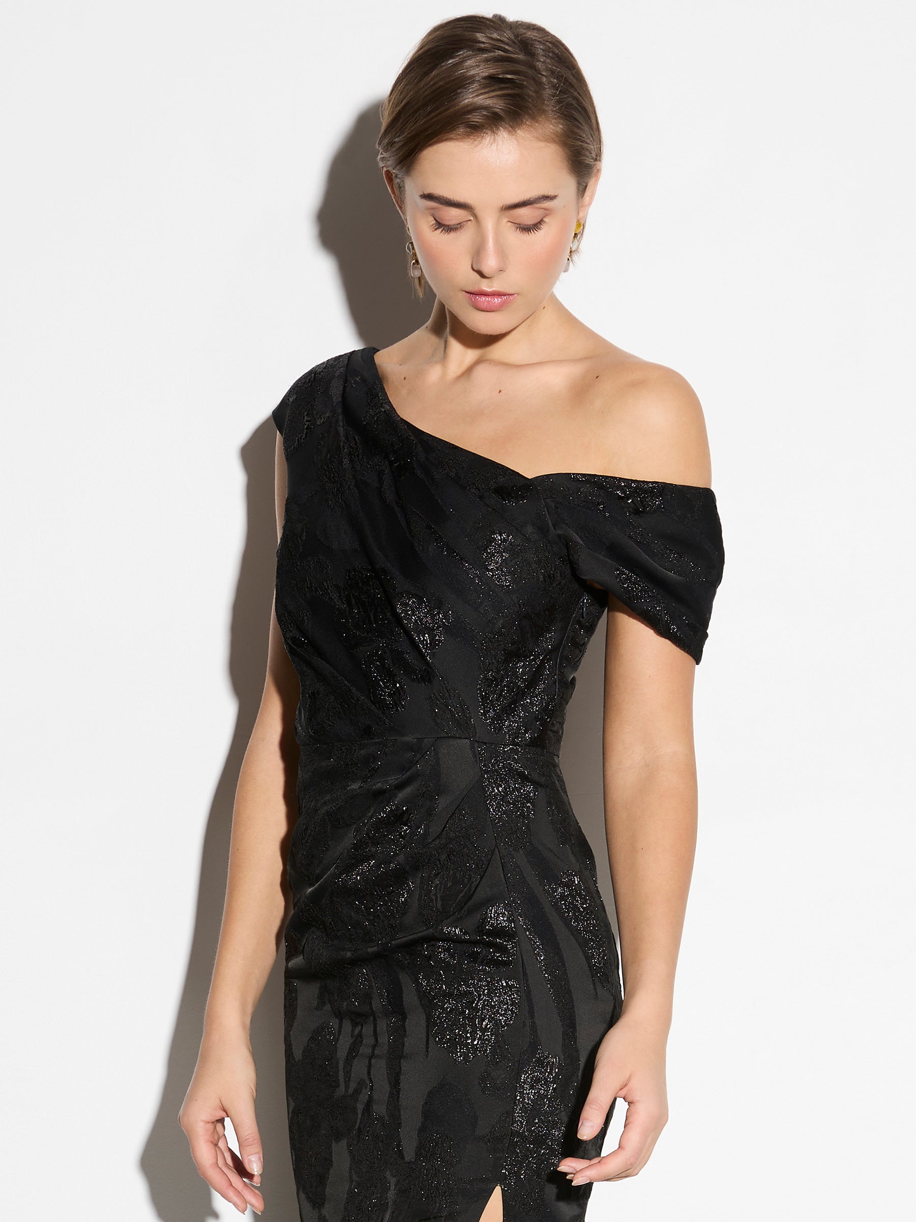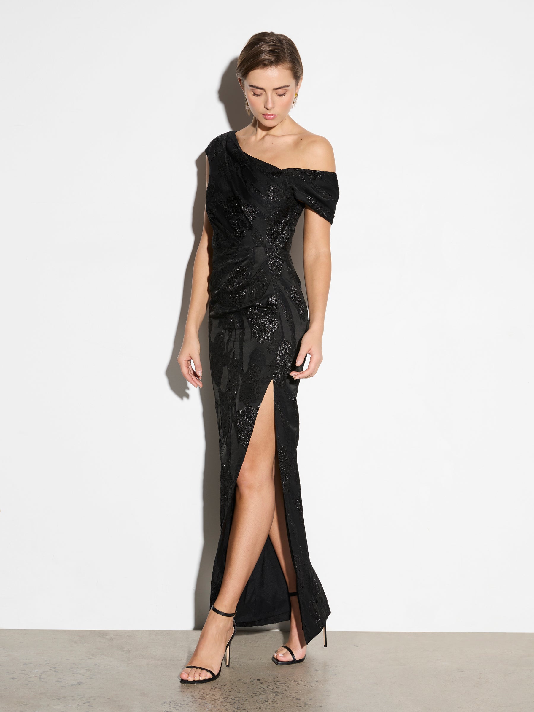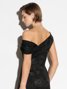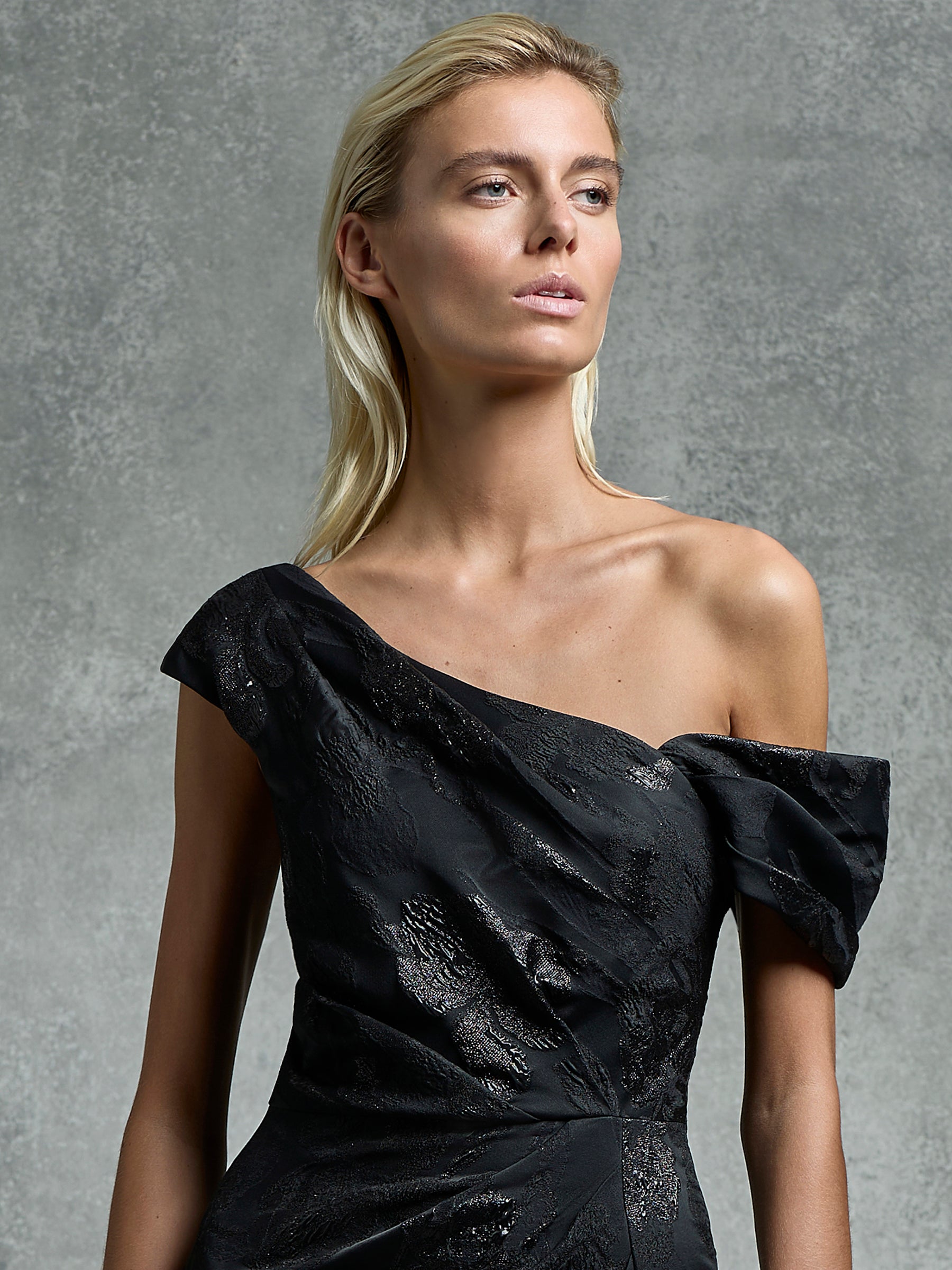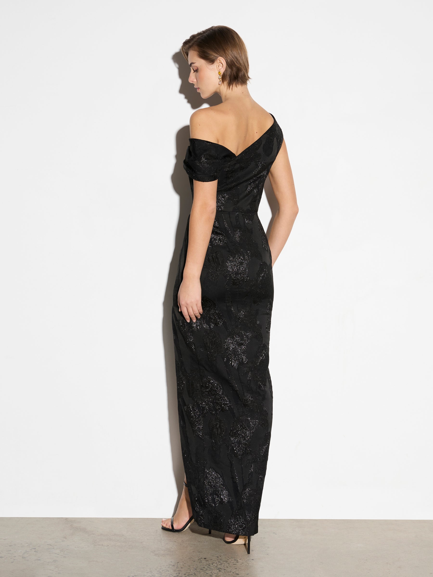 The Remy Gown is a dress sure to stun. Crafted from a deluxe Jacquard fabrication in black, this dress features a side front split starting from just above mid-thigh and an off-the-shoulder sleeve. For added detail this dress has front side tucks giving a flattering hourglass shape with the skirt tapering in at the sides finishing just above the ankle. The Remy Gown is an exquisite piece perfect for formal events.