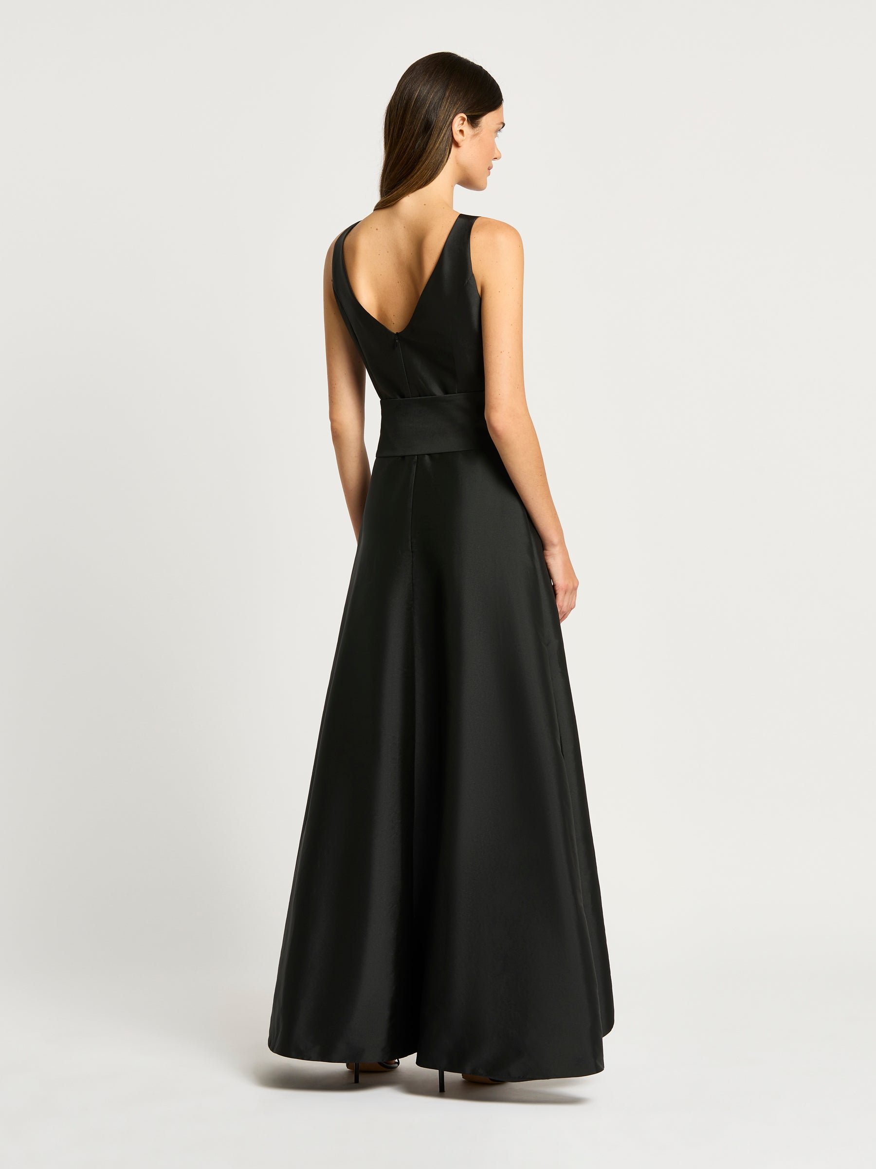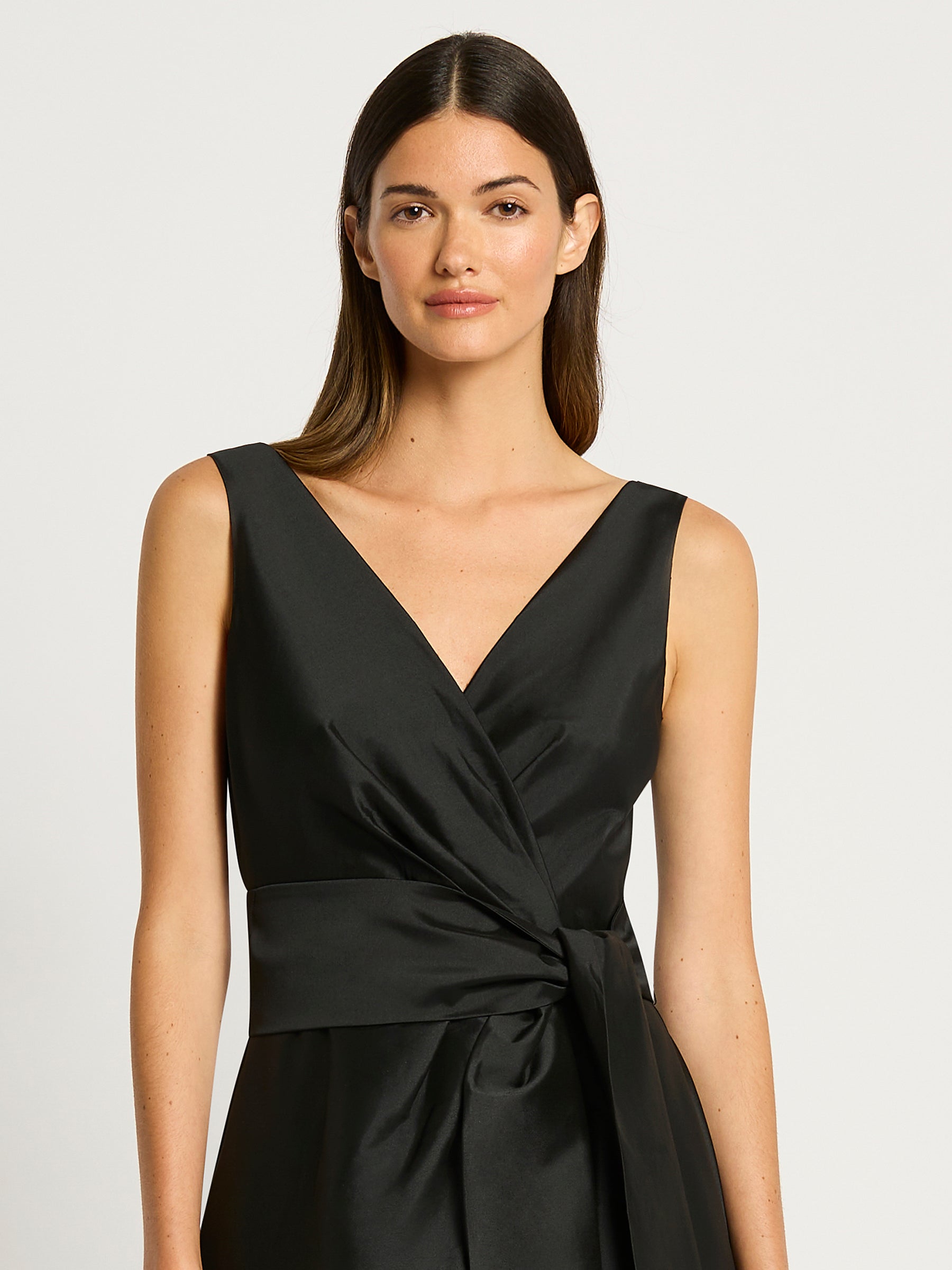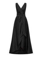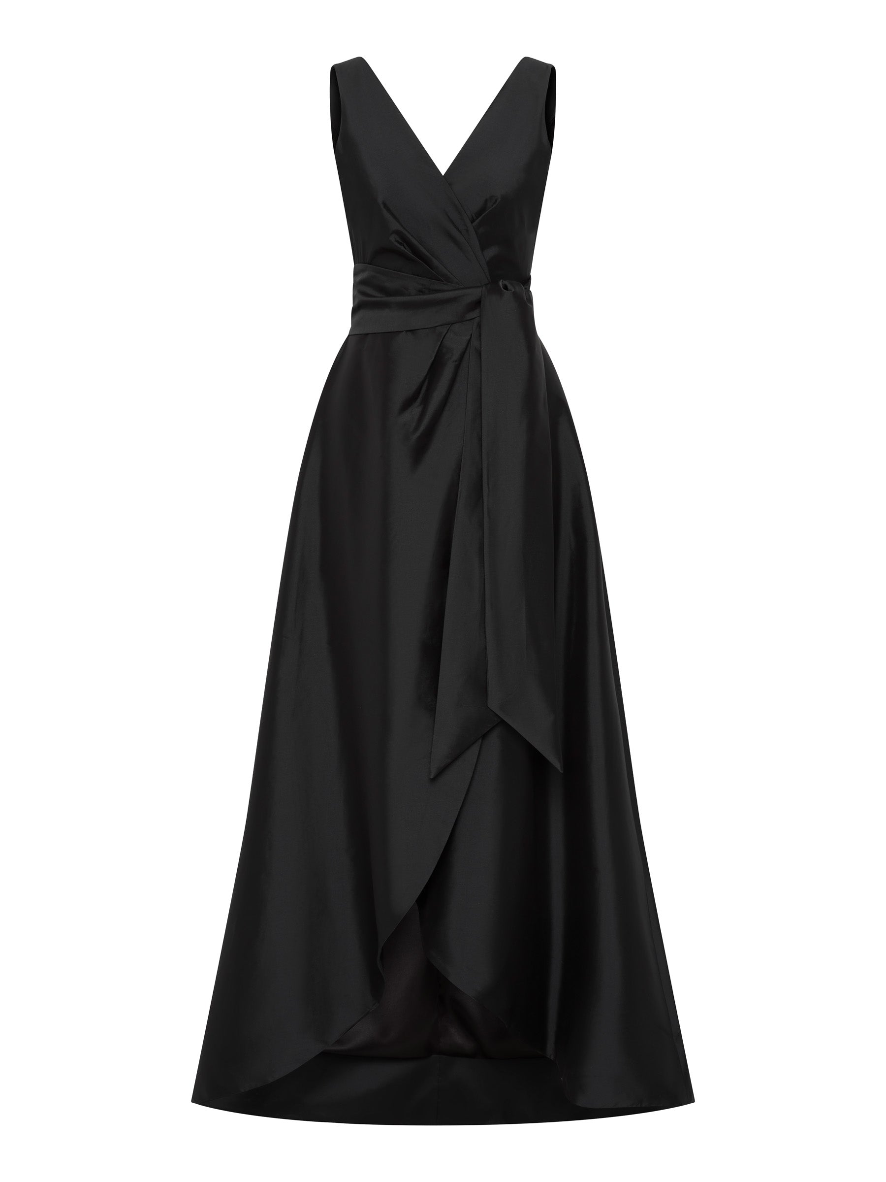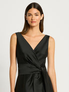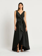 Our popular Rene Gown is back in the season’s colours. This statement gown crafted from a shot taffeta is fitted through the bodice with a mock wrap V-neckline secured at the waist with a separate tie to effortlessly accentuate the waistline. This sleeveless design is a classic silhouette, featuring a full length, A-line high-low skirt with a wrap style front. The Rene Gown is the perfect choice for your upcoming cocktail events or the modern mother of the bride.