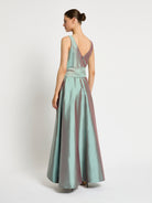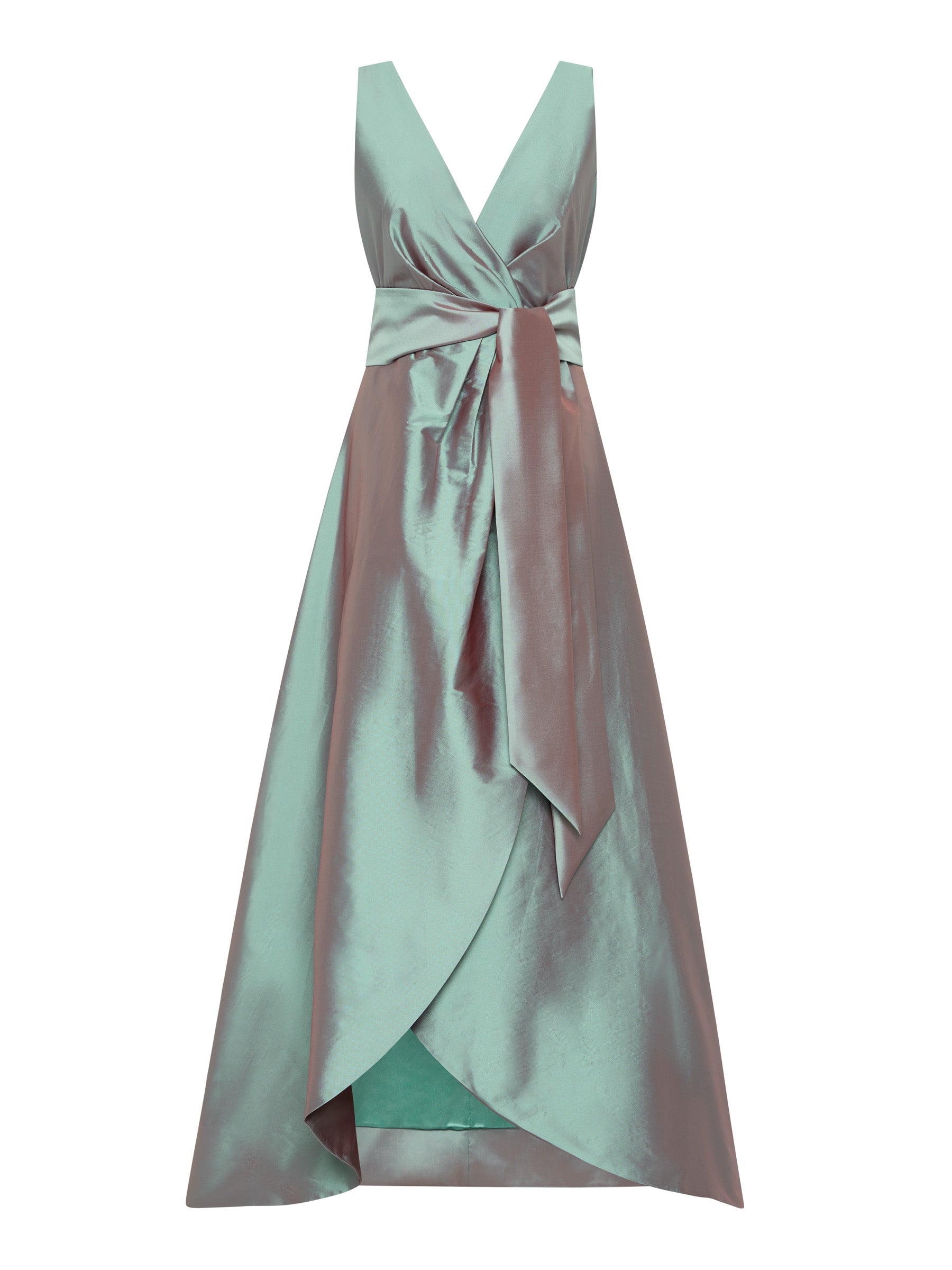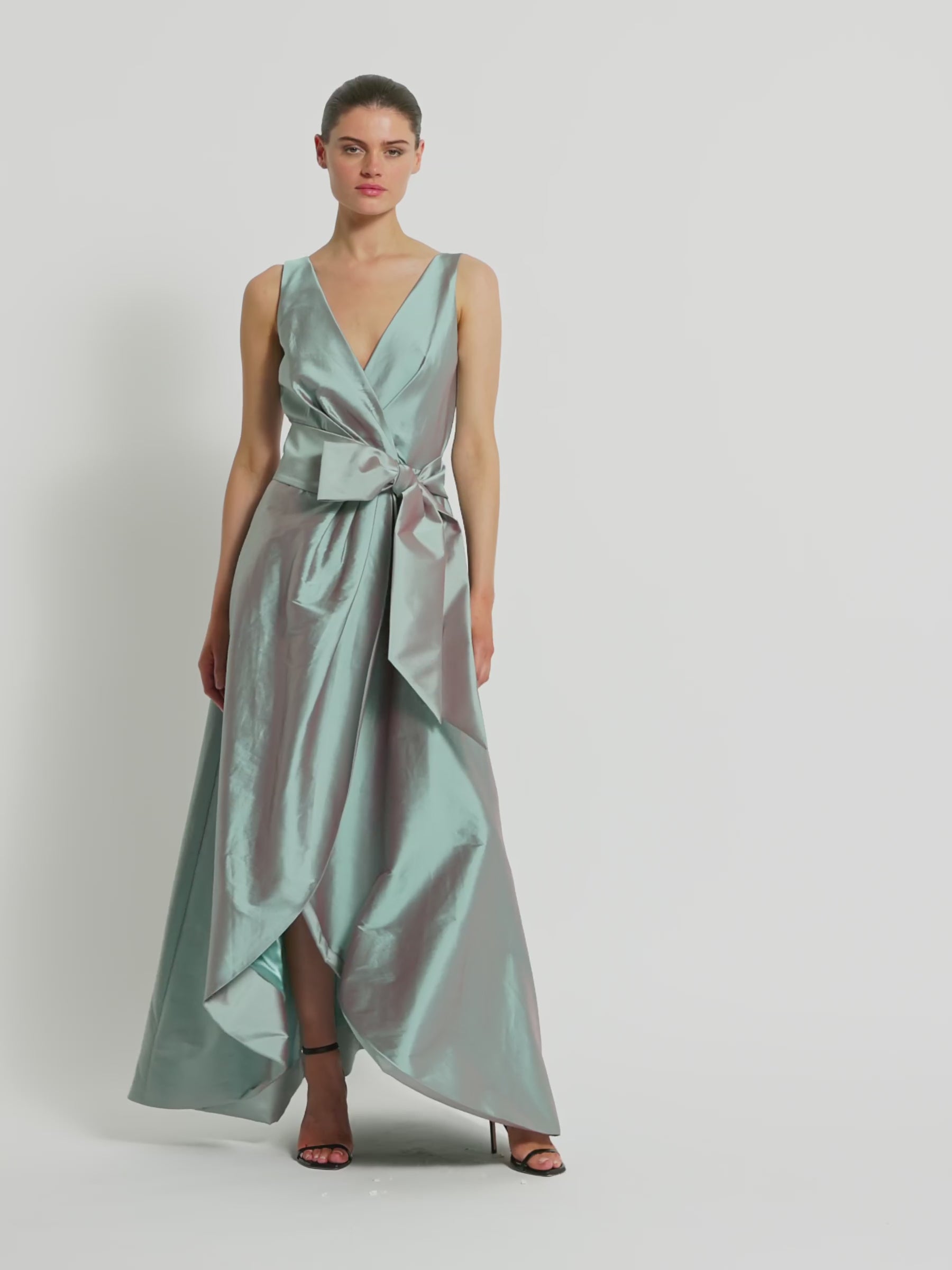 Our popular Rene Gown is back in the season’s colours. This statement gown crafted from a shot taffeta is fitted through the bodice with a mock wrap V-neckline secured at the waist with a separate tie to effortlessly accentuate the waistline. This sleeveless design is a classic silhouette, featuring a full length, A-line high-low skirt with a wrap style front. The Rene Gown is the perfect choice for your upcoming cocktail events or the modern mother of the bride.