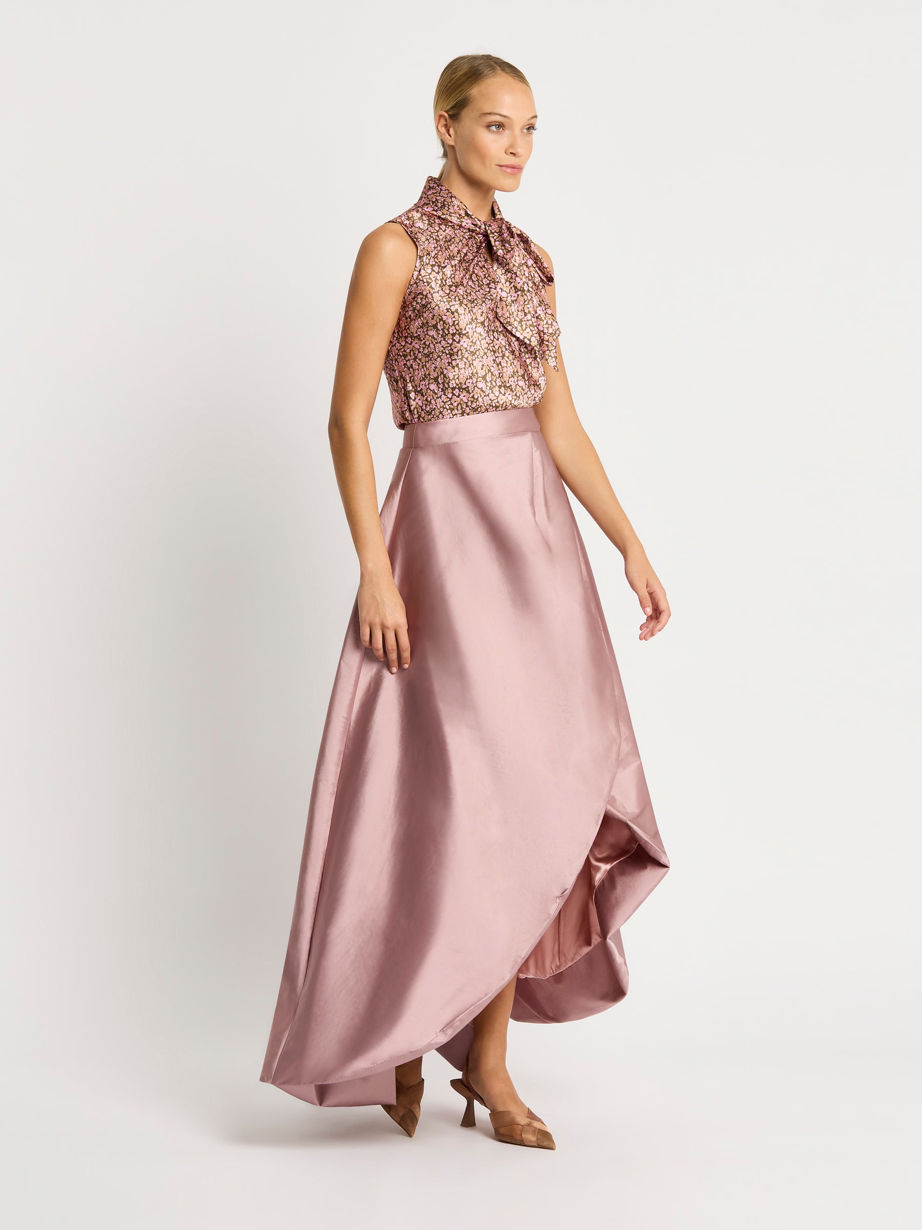 Our Rene Skirt is a statement silhouette, cut from a two-tone shot taffeta. Featuring a full length, A-line, high-low skirt with a wrap style front. Fully lined, with a wide waistband secured with a centre back invisible zip. It is an elegant style perfect for the races or your next cocktail event.
