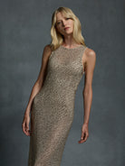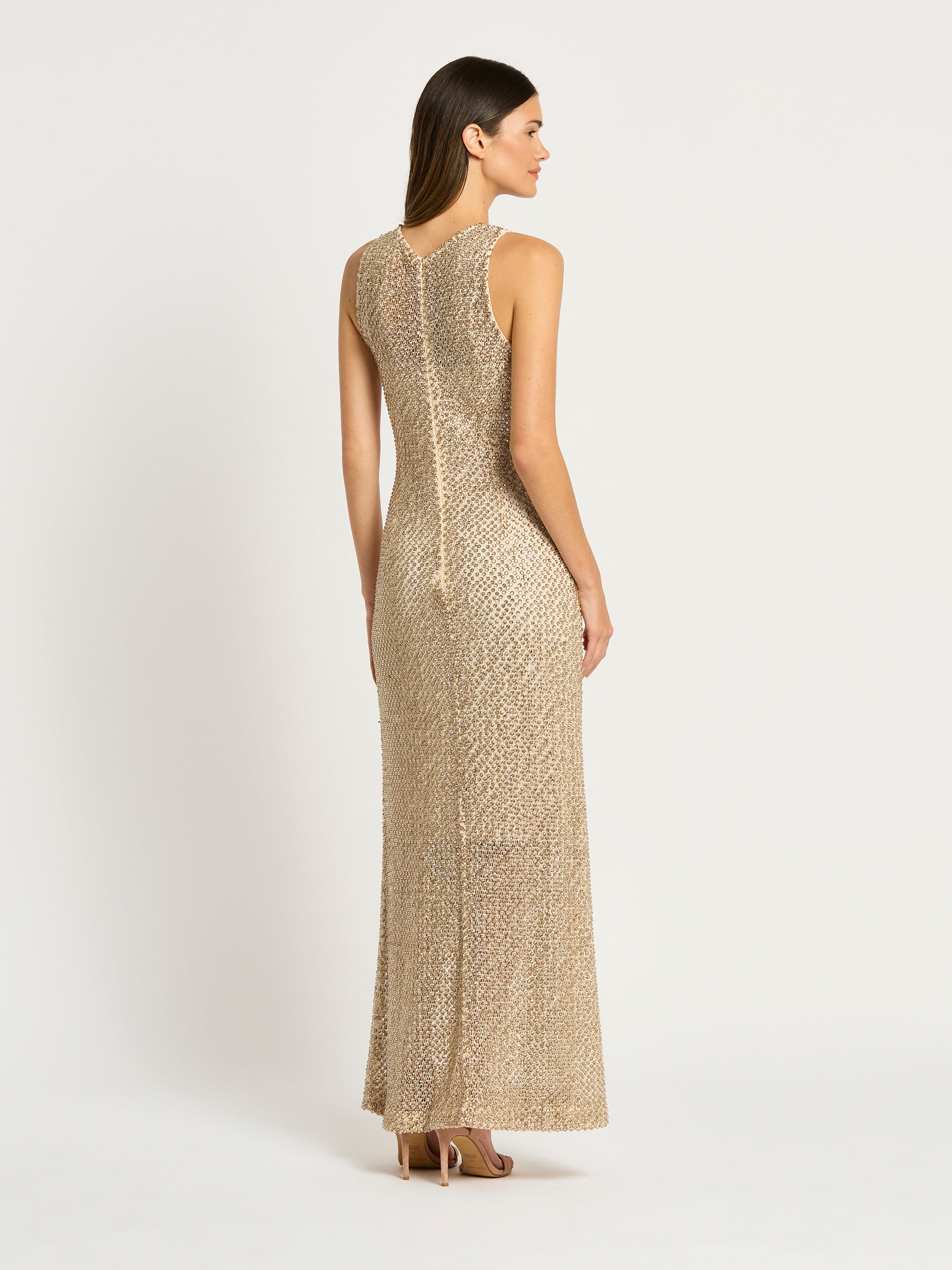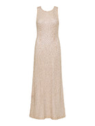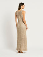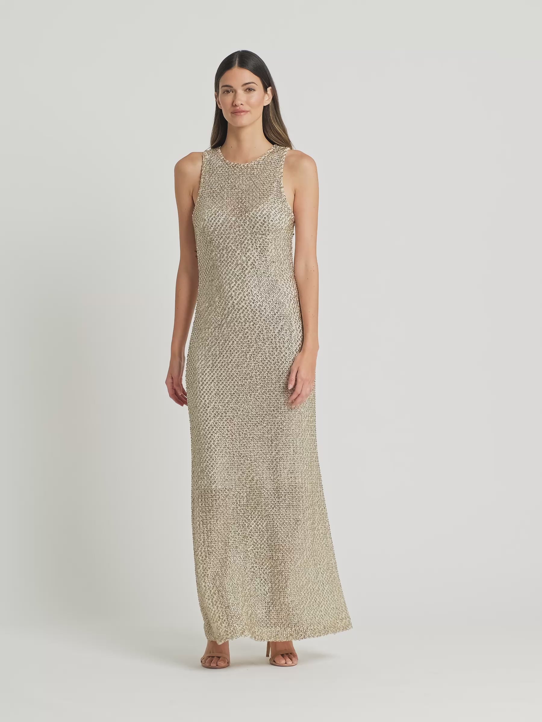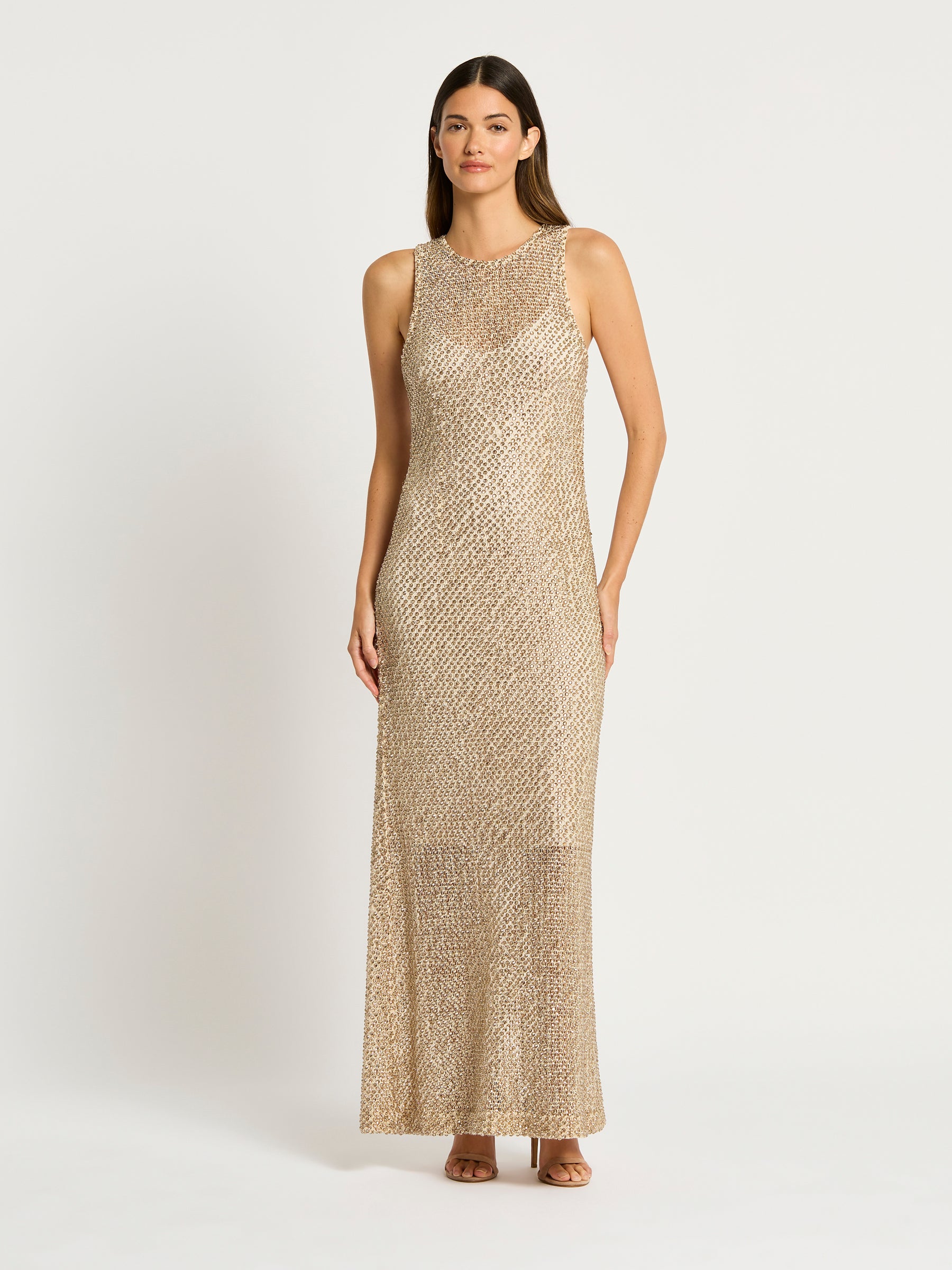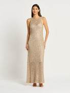 The Sabine Gown is heavily beaded with pale gold glass beads on a cream cotton netting. Fitted to the body falling to a slight A-line shape, finishing at maxi length. It also comes with a matching jersey slip. A real showstopper for your next formal or black-tie event.