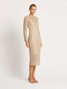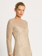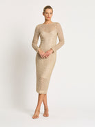 The Sabine Midi is heavily beaded with pale gold glass beads on a cream cotton netting. Fitted to the body falling to a shift silhouette, finishing at mid-calf. It also comes with a matching jersey slip. A real showstopper for your next formal or black-tie event.
