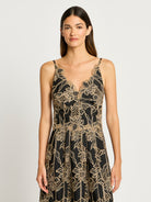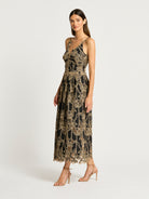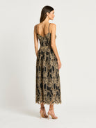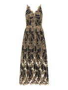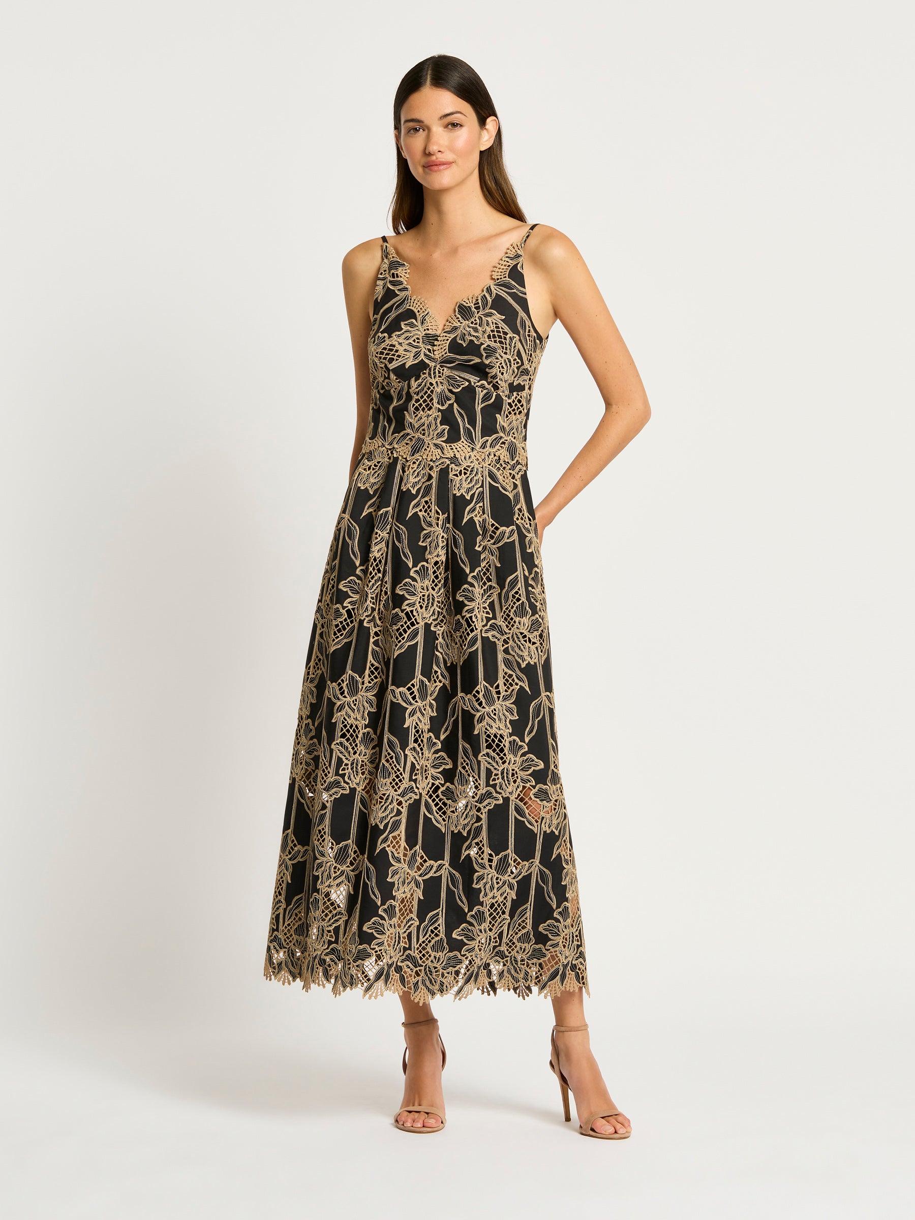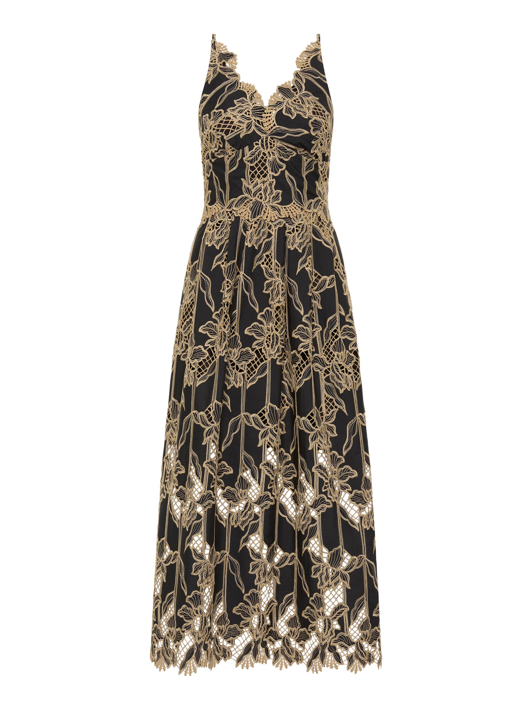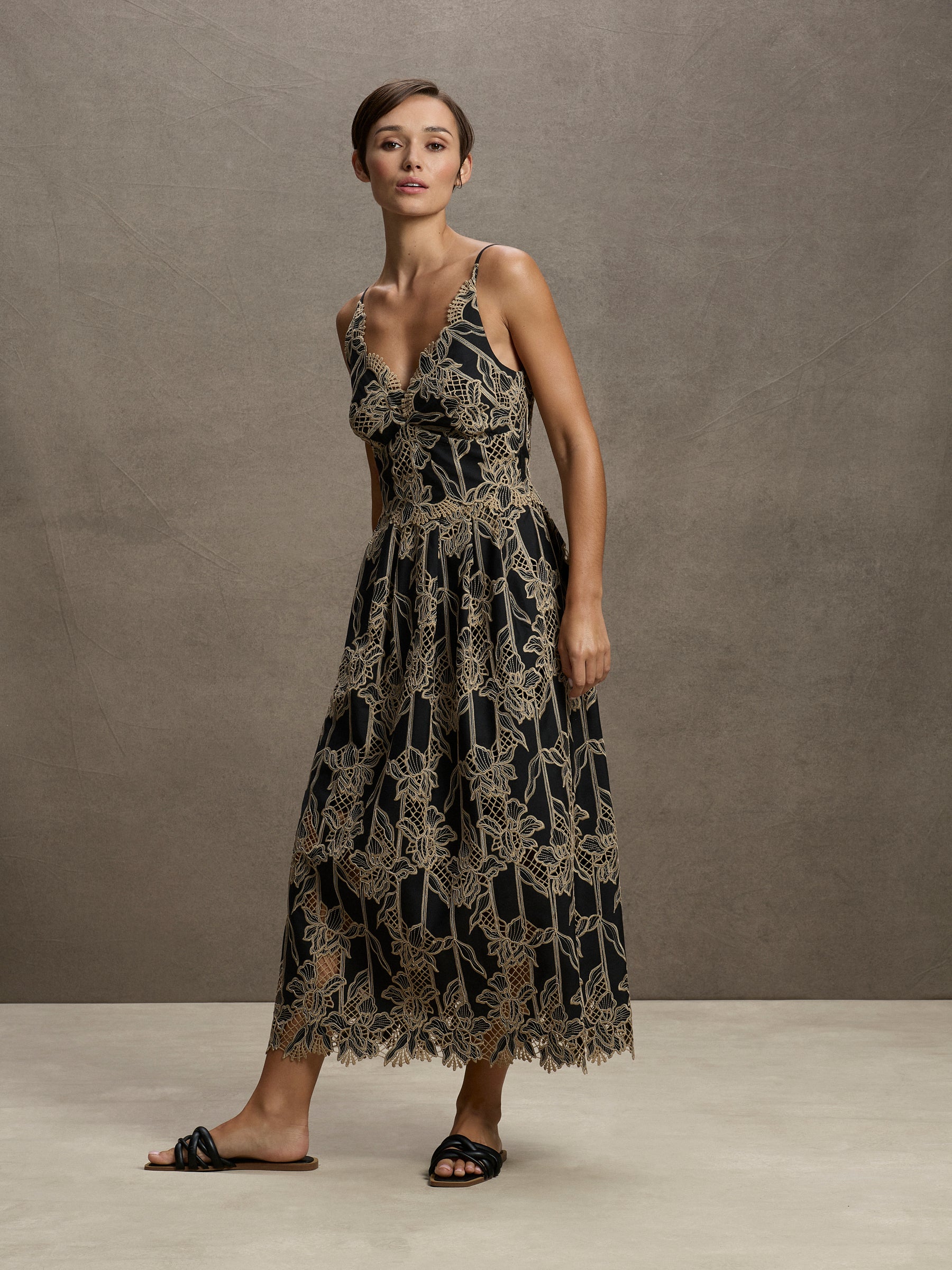 Featuring a striking corded floral embroidery in straw colour on a black background with cut-out detailing, the Sandy Midi has an elegant silhouette with intricately cut scallop detailing around the neckline. Its fitted waist seam has a scallop hem which overlays the tucked skirt, falling to a long midi-length and elegantly embroidered hem. Lined in a soft cotton voile and with adjustable straps, the Sandy Midi is the perfect dress for your next summer event.