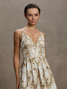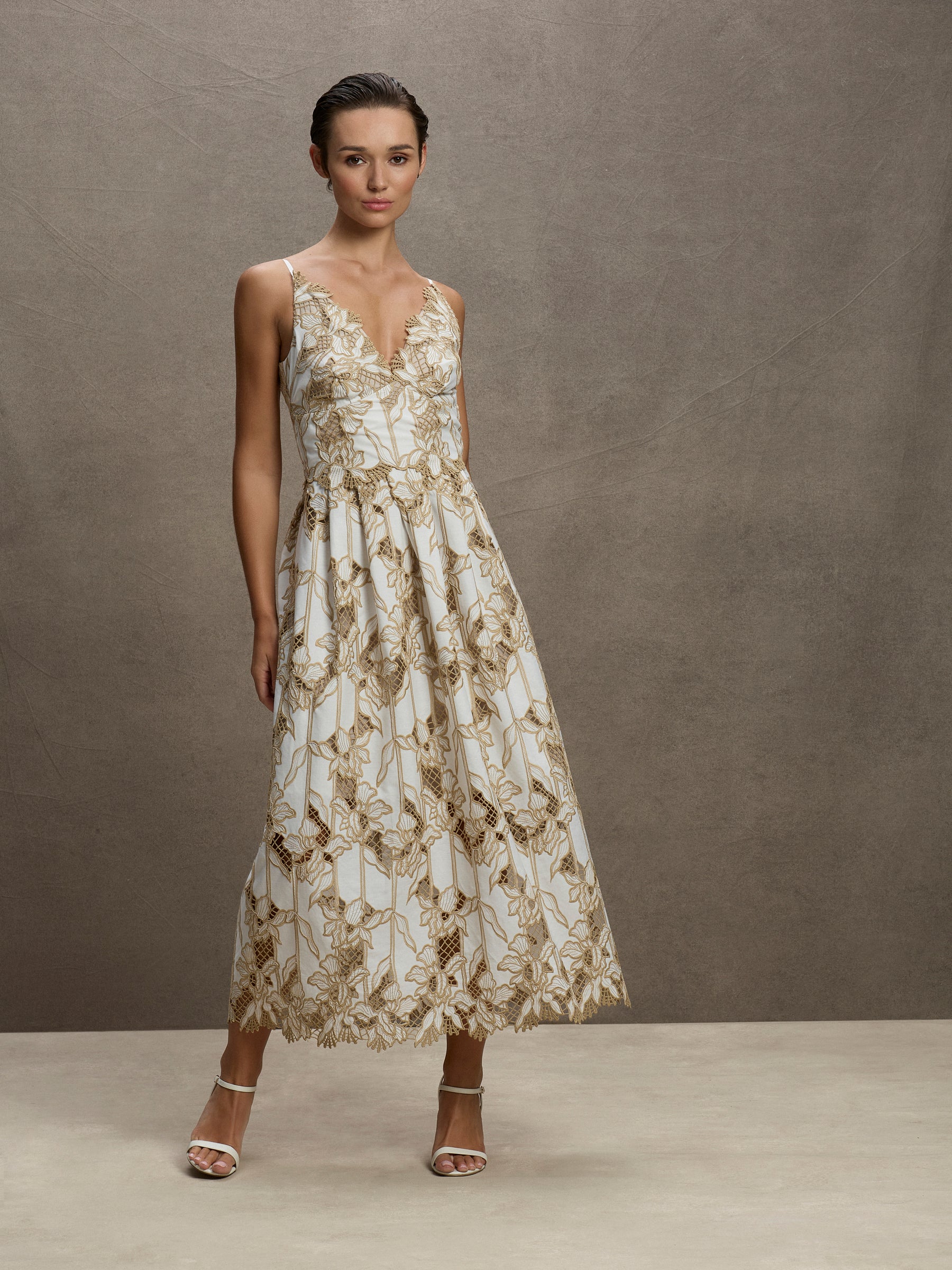 Featuring a striking corded floral embroidery in straw colour on a white background with cut-out detailing, the Sandy Midi has an elegant silhouette with intricately cut scallop detailing around the neckline. Its fitted waist seam has a scallop hem which overlays the tucked skirt, falling to a long midi-length and elegantly embroidered hem. Lined in a soft cotton voile and with adjustable straps, the Sandy Midi is the perfect dress for your next summer event.