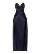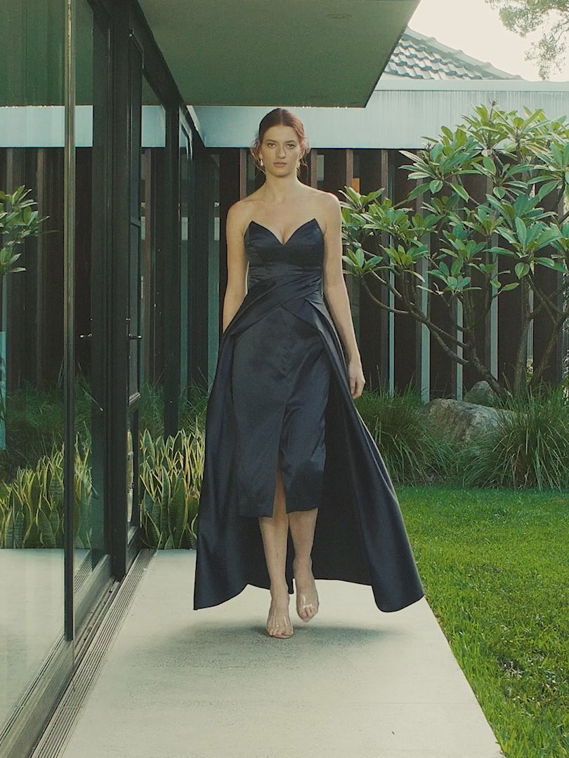 The Sephora Gown is a beautiful and elegant strapless gown, with a sweetheart V-neckline. This silhouette is fitted through the bust and waist and features an A-line skirt overlay with tucks and draping attached at the waist seam. The bodice is structured with boning on the side seams. The Sephora Gown is a perfect statement piece, ideal for your next black-tie event.