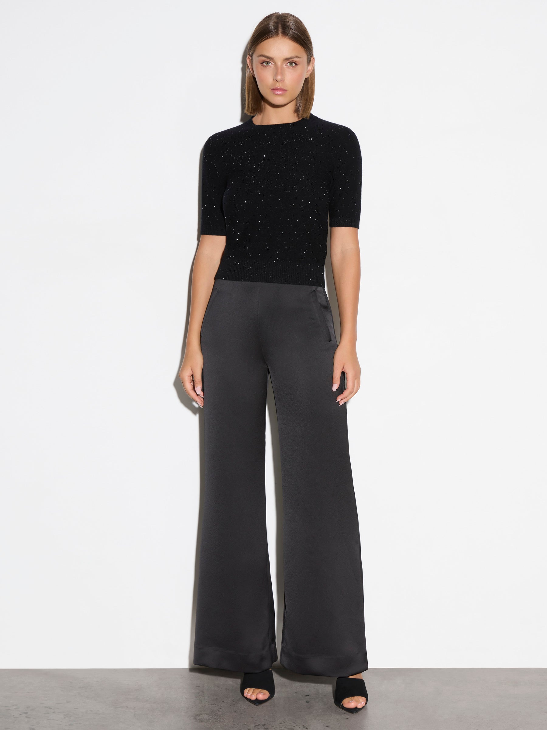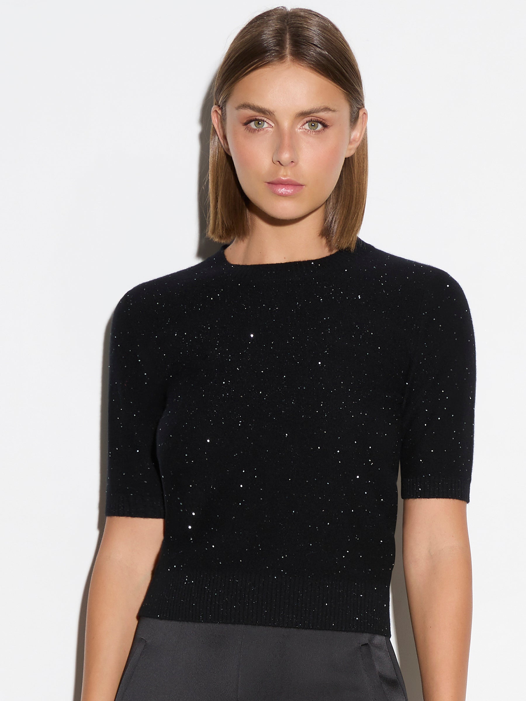 Knitted from 100% Cashmere this luxuriously embellished short sleeve sweater is the perfect statement knit to layer with your winter wardrobe. Soft to touch, it is embedded with micro sequins to give a distinctive yet subtle sparkle. Designed to be a relaxed slim fit it can be worn over pants or skirts, finishing on the hip.