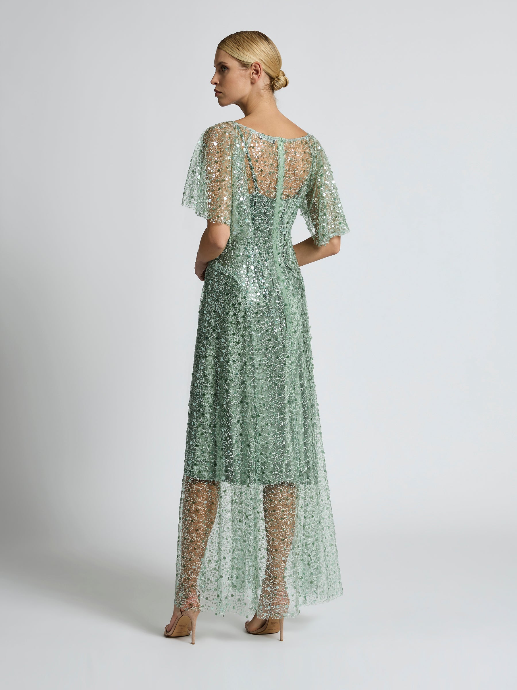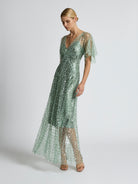 A gracefully flowing sheer gown, the Tilda Gown is designed to captivate. The lightweight tulle is intricately embroidered in hues of sage, delicately finished with sequins for a soft, light-catching finish that highlights the V-neckline. It has flowy elbow length sleeves with slits and is fitted through the bodice falling to a beautifully draping A-line skirt, finishing at maxi length. The matching satin slip creates a complete look with a silhouette that moves beautifully with every step.