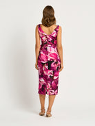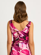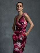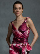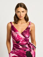 This statement top in rich vibrant tones of pink and crimson has a V-front with tucks as well as a V- back neckline and a twisted strap for added detail. The cross over wrap design has a small peplum waistband and tie which allows for easy adjustment and can be tied at the side or back. The Viola Wrap Top is designed to sit over the Viola Skirt or can also be teamed with pants. The perfect choice for your upcoming cocktail event.
