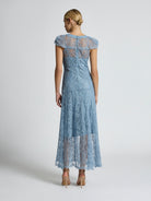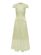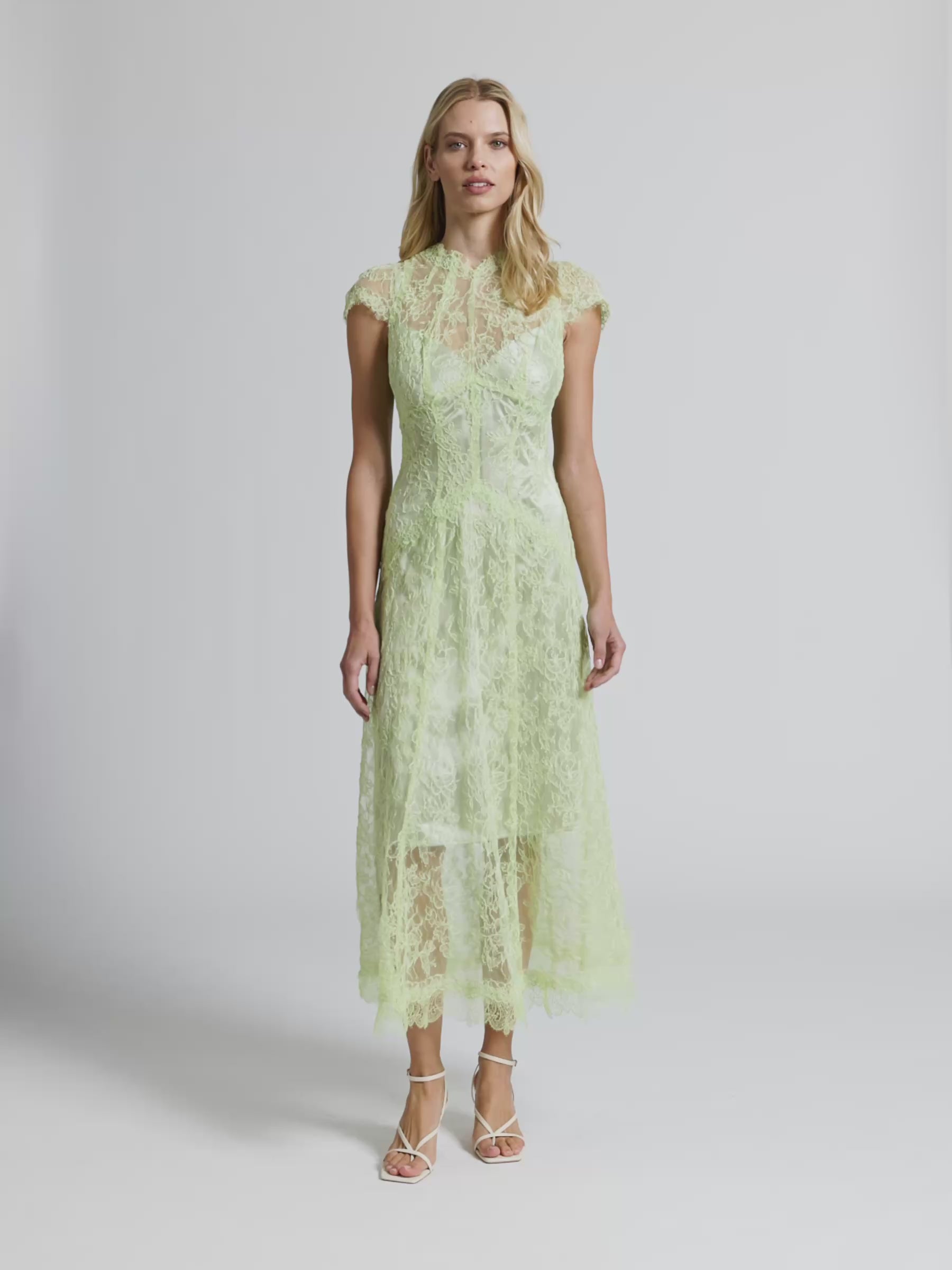 The fine floral lace of The Lorena Midi in a soft citrus green over its matching satin slip combines timeless femininity with modern elegance. Scalloped detailing around the neckline, cap sleeves and hem enhance the striking feminine look, while the figure flattering silhouette is fitted through the bodice before falling to a soft A-line skirt finishing above the ankle. Certain to create an elegant first impression at any day or evening event.