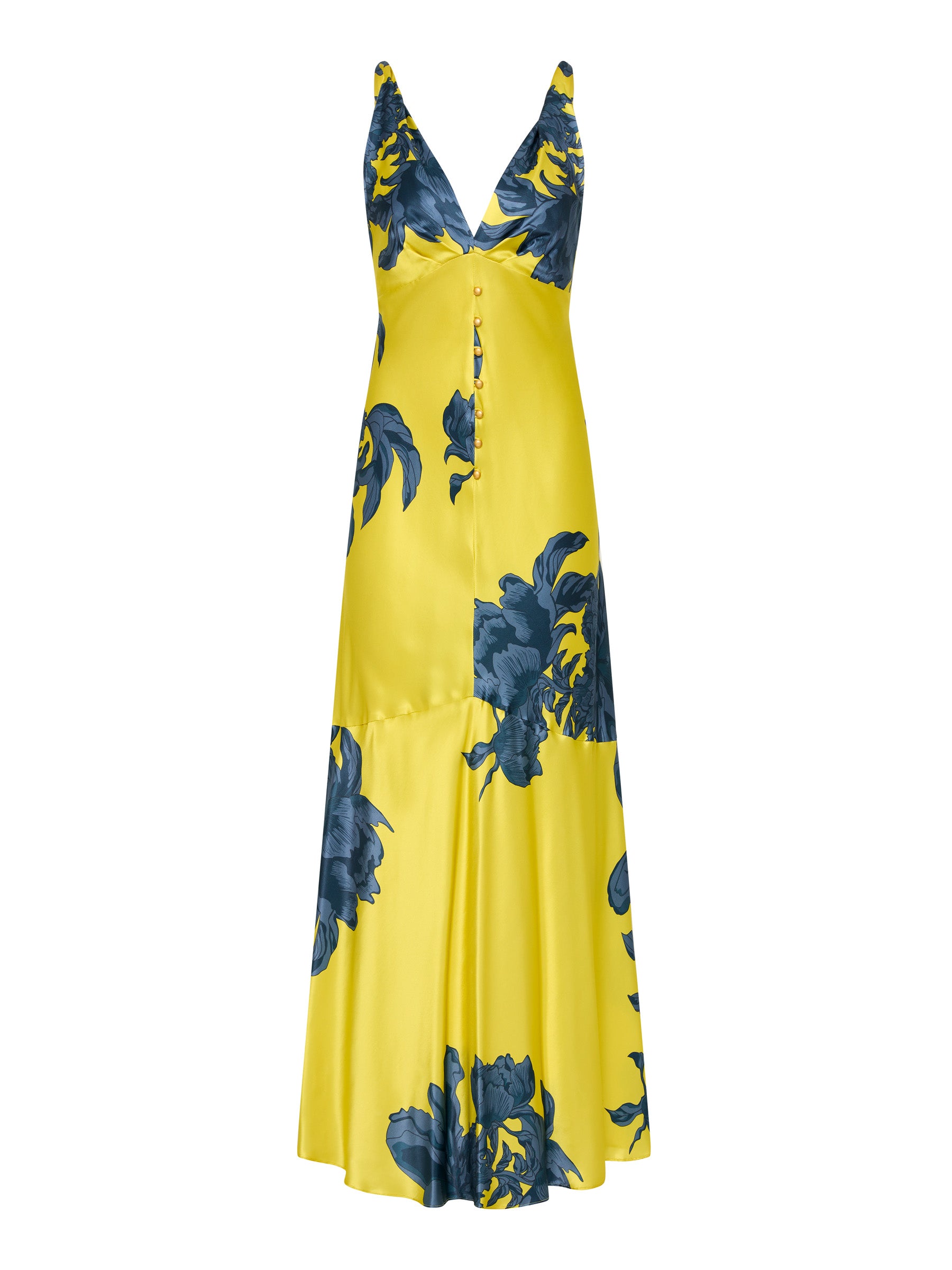Make a statement with the striking silk Delphine Midi featuring a vibrant citrus backdrop adorned with a digital floral design in tonal shades of blue. This summer midi dress features tuck detailing and a keyhole neckline with an under bust seam that flows into an A-line bias-cut skirt with a flounce hem. Elbow length flounce sleeves add a soft, feminine touch to this elegant style.