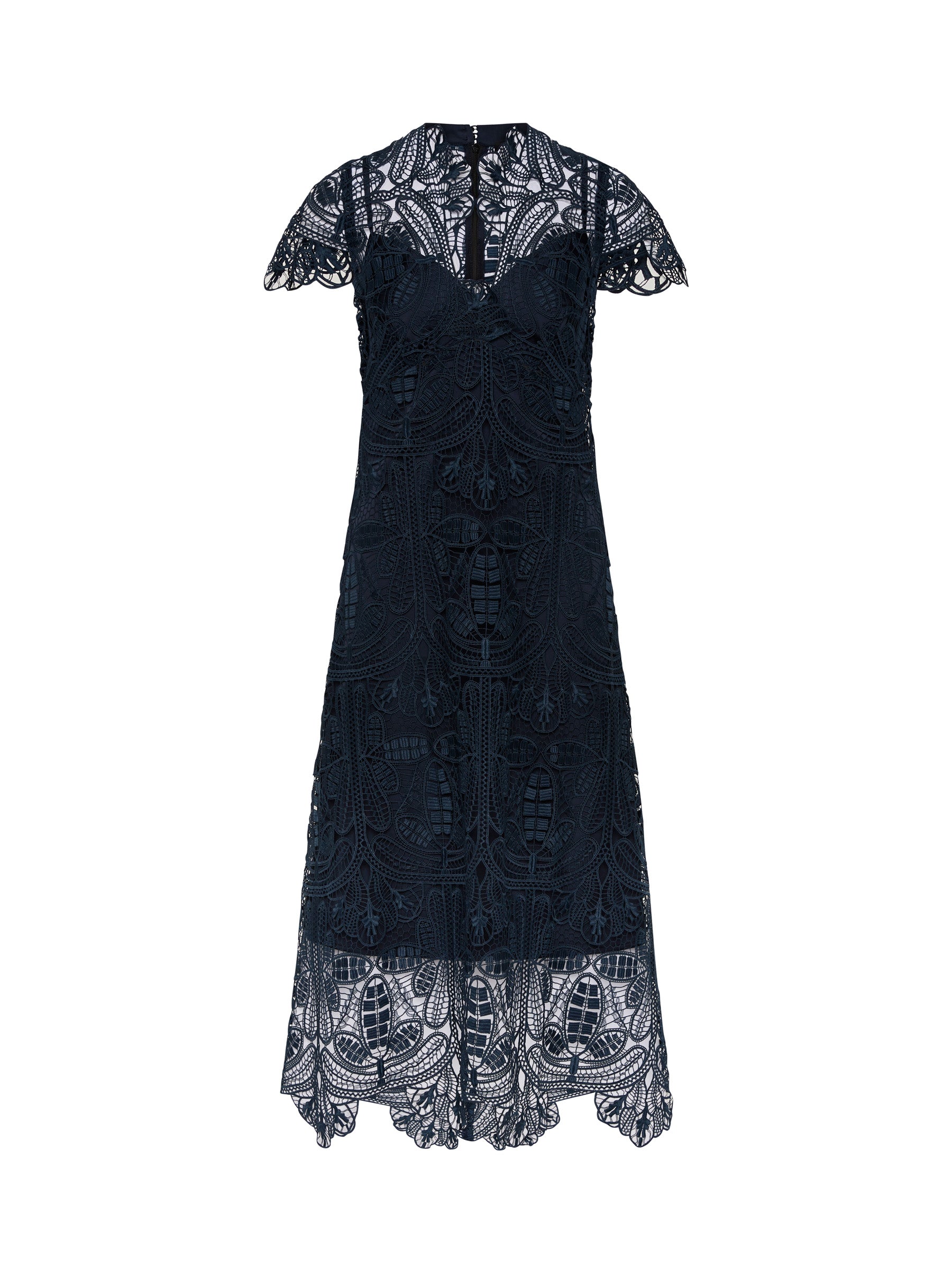 A contemporary take on the classic lace dress, the elegant style of the Elise Midi is crafted from a geometric floral design on midnight guipure. Perfect for any cocktail event or party, this timeless silhouette features scalloped detailing at the neckline, cap sleeve and hemline. Fitted through the body with a slight A-line skirt, and finishing mid-calf, it comes with a matching satin slip.